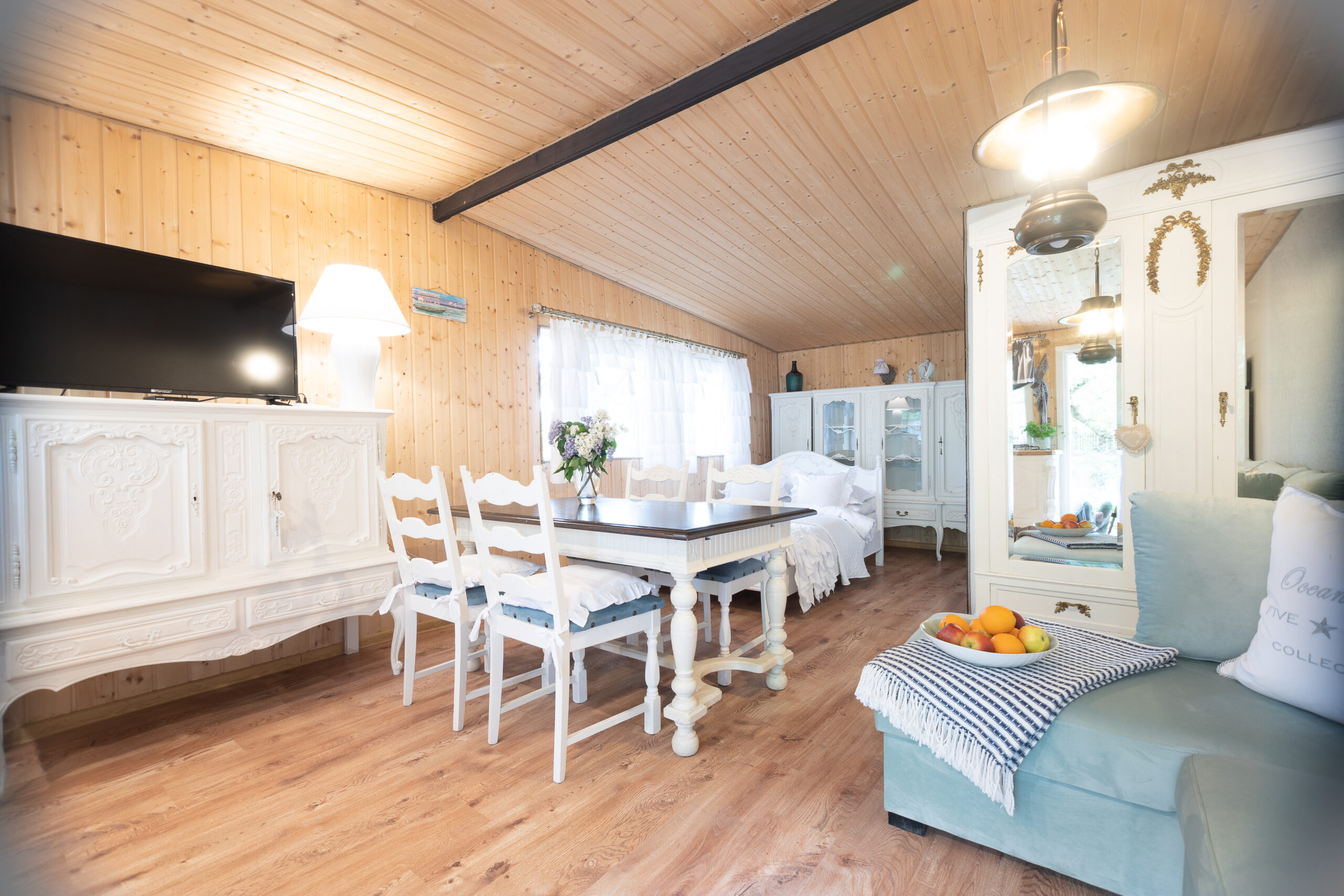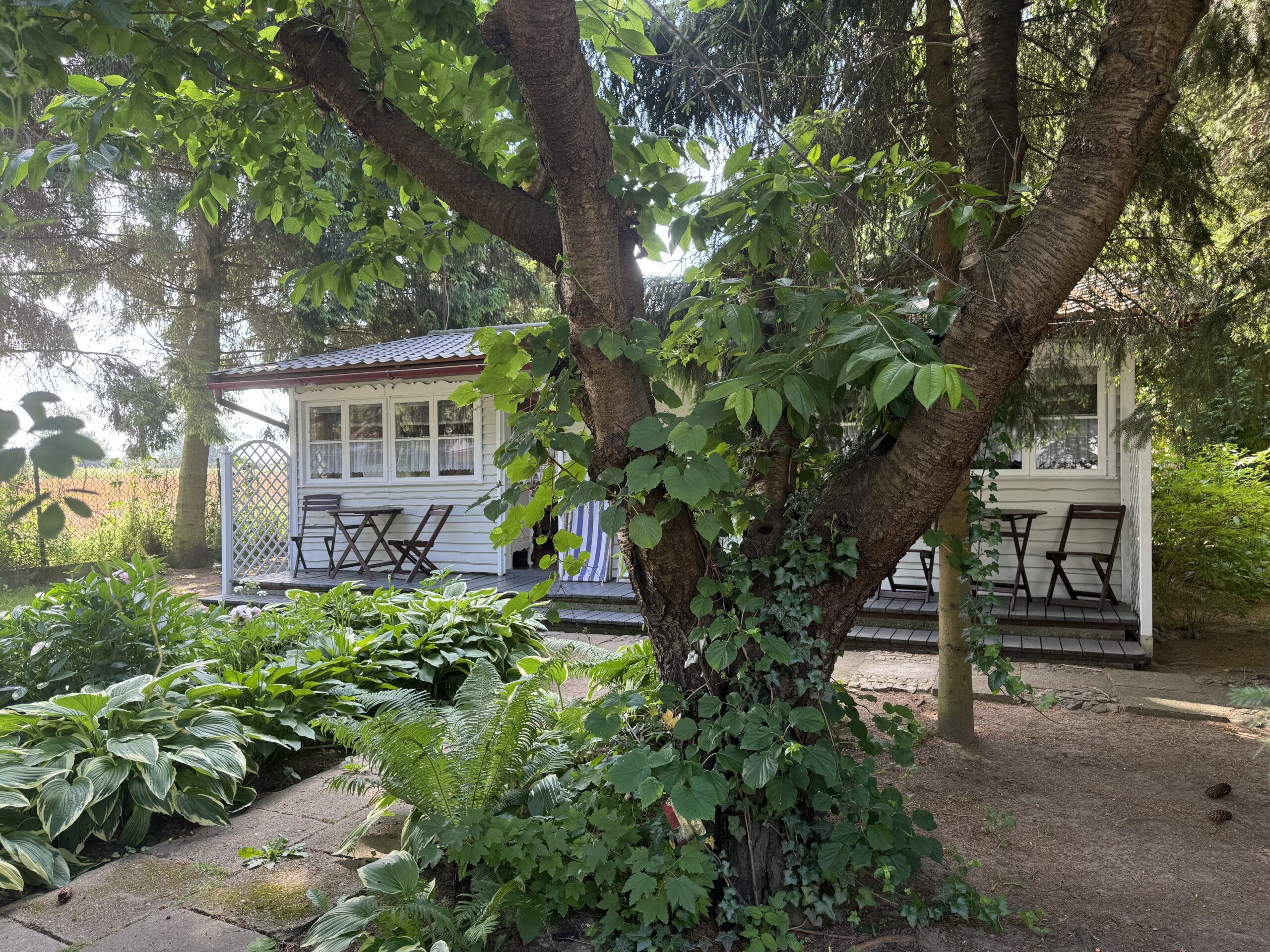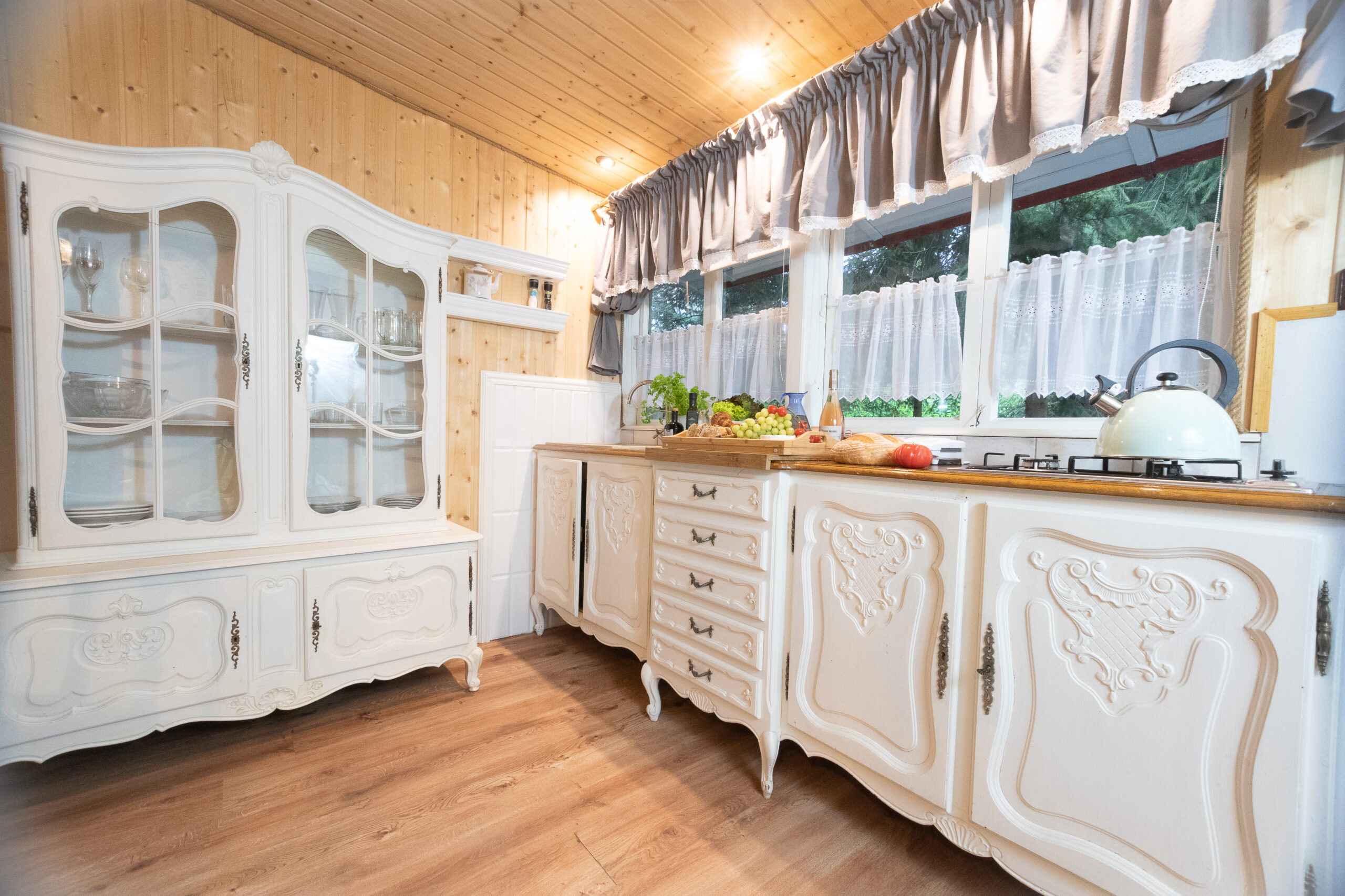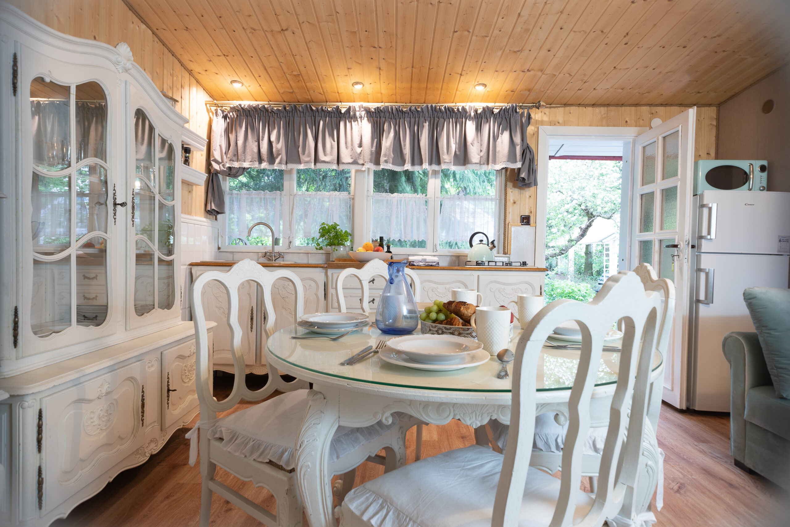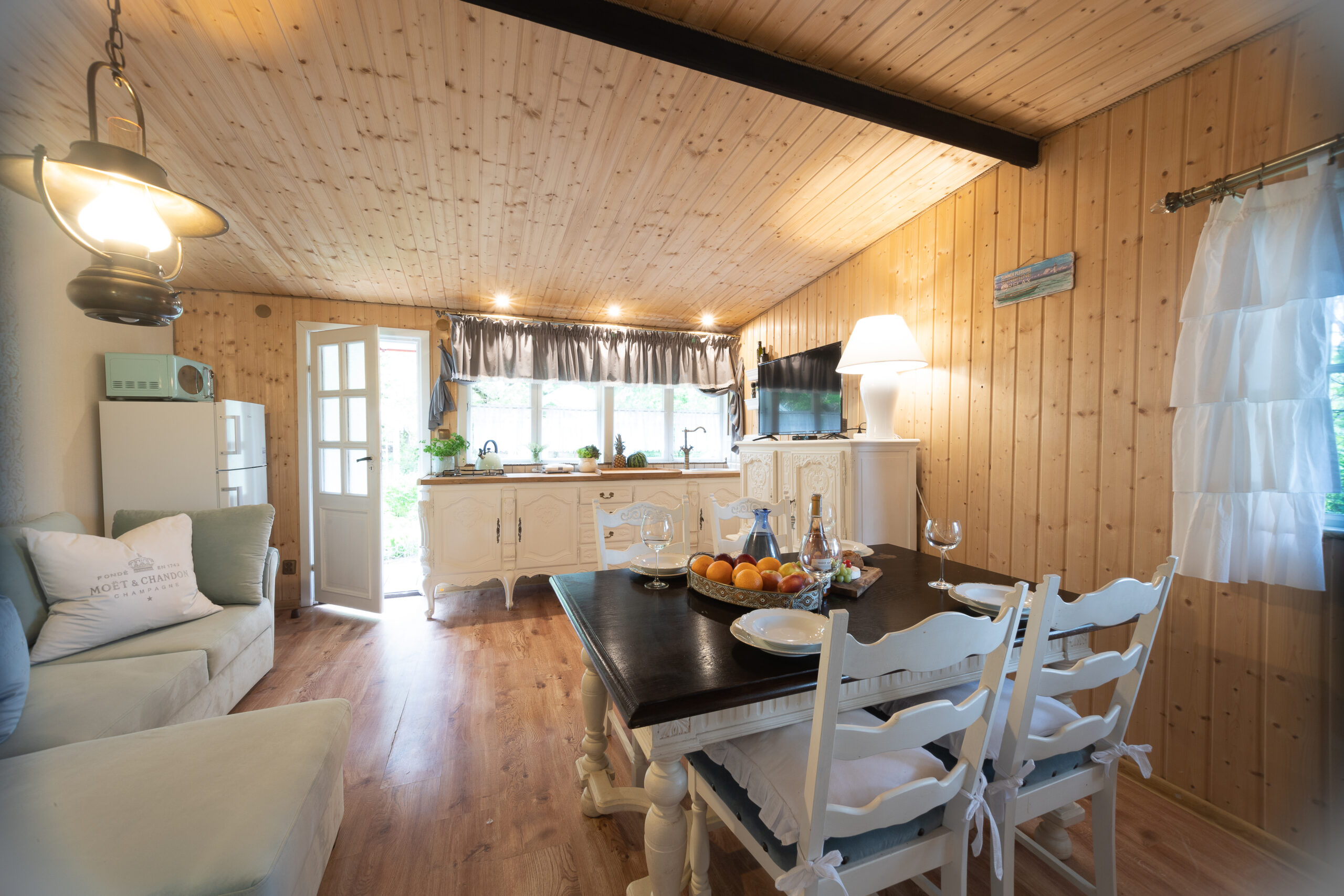 Aneks kuchenny w pełni wyposażony. Łazienka z prysznicem, WC, TV, grill. Dla każdej części dodatkowa altanka pełniąca rolę saloniku do dziennego pobytu i grillowania. Domek drewniany osadzony w starym sadzie niedostępnym dla innych gości, co zapewnia dużo prywatności.
