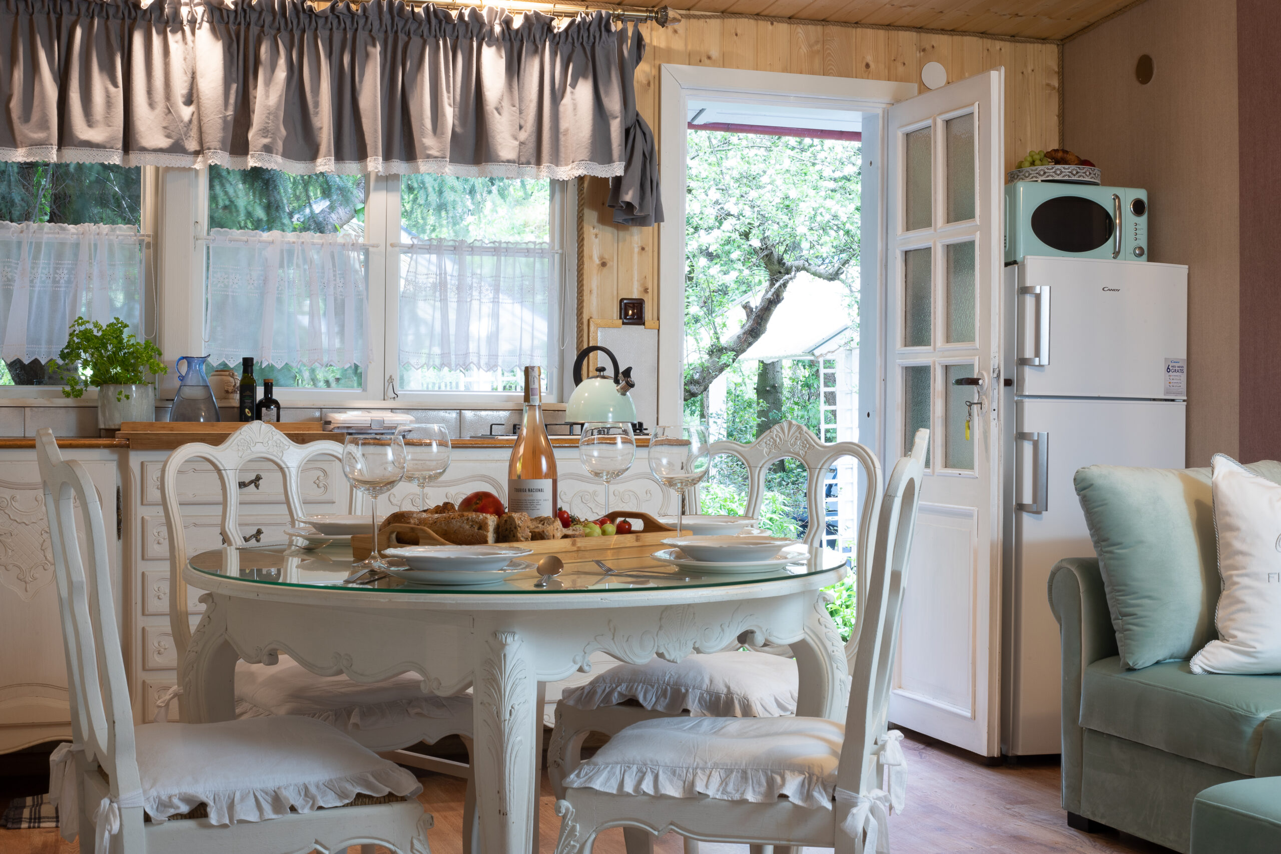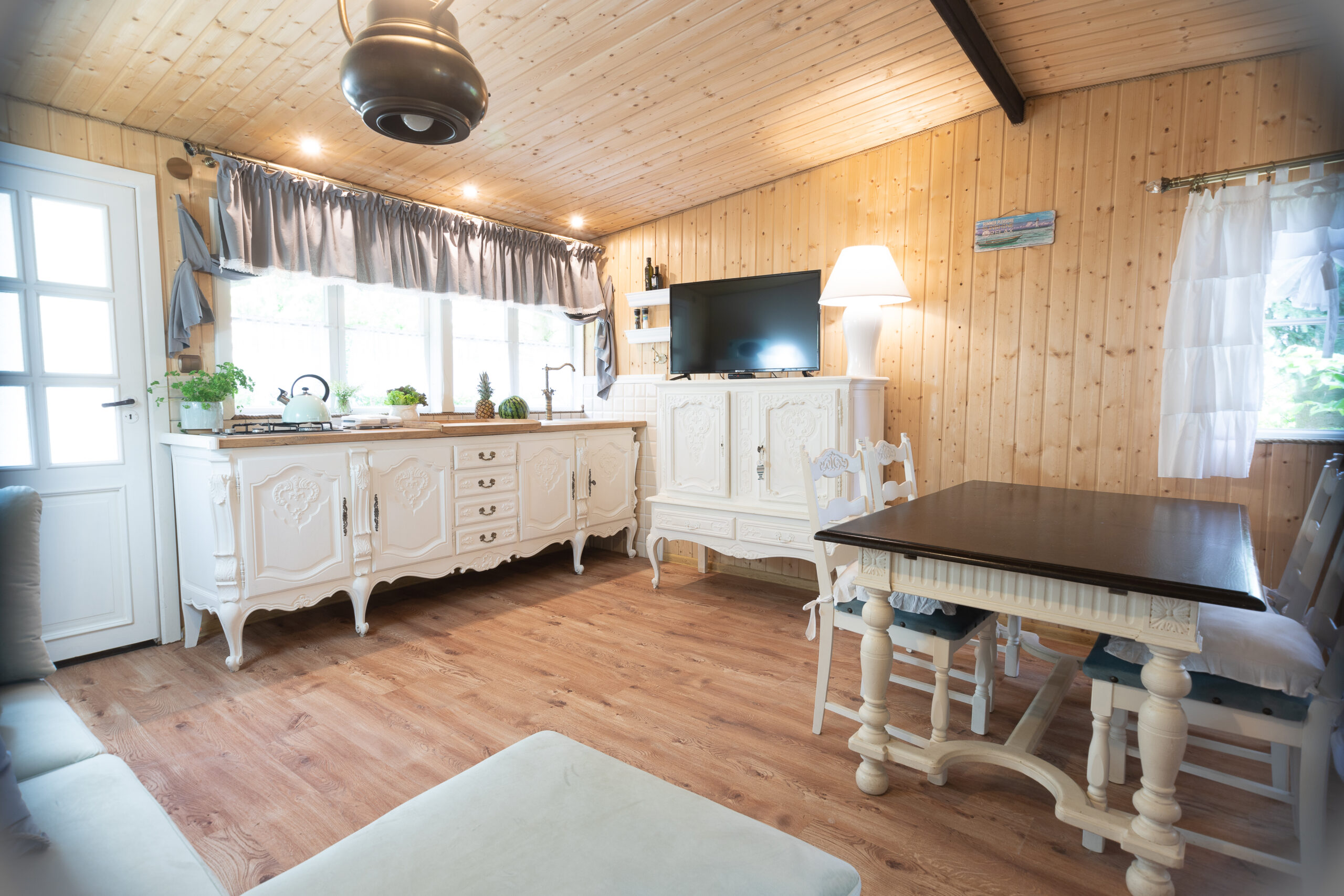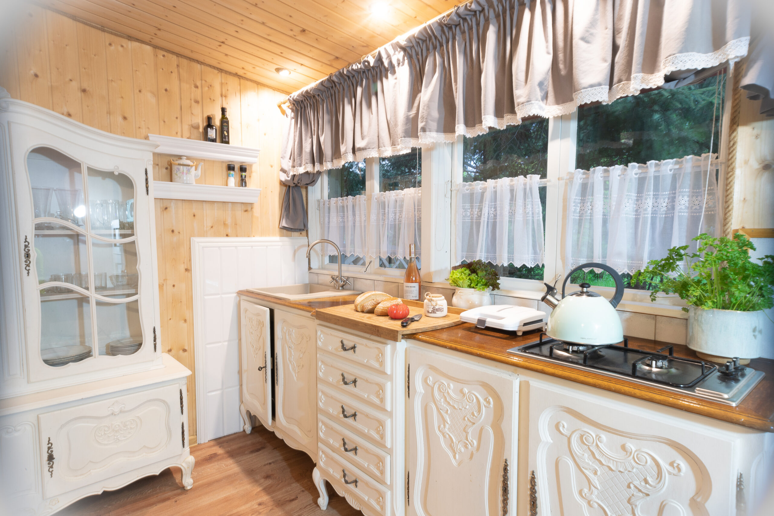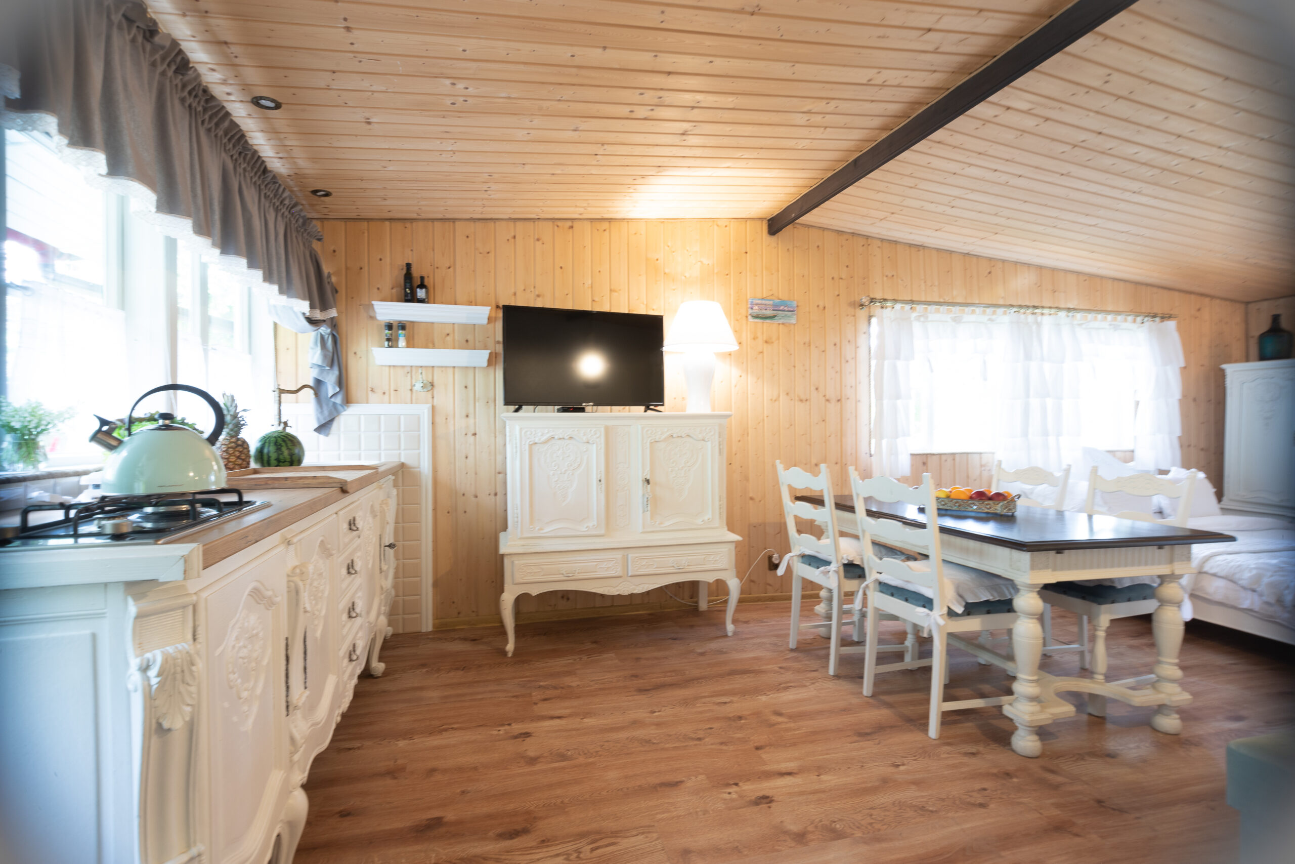 Aneks kuchenny w pełni wyposażony. Łazienka z prysznicem, WC, TV, grill. Dla każdej części dodatkowa altanka pełniąca rolę saloniku do dziennego pobytu i grillowania. Domek drewniany osadzony w starym sadzie niedostępnym dla innych gości, co zapewnia dużo prywatności.