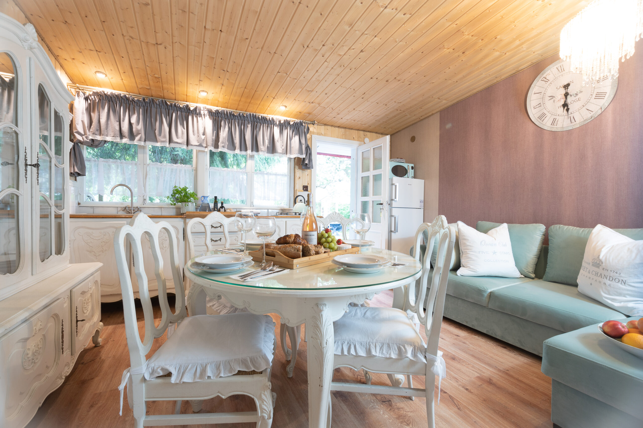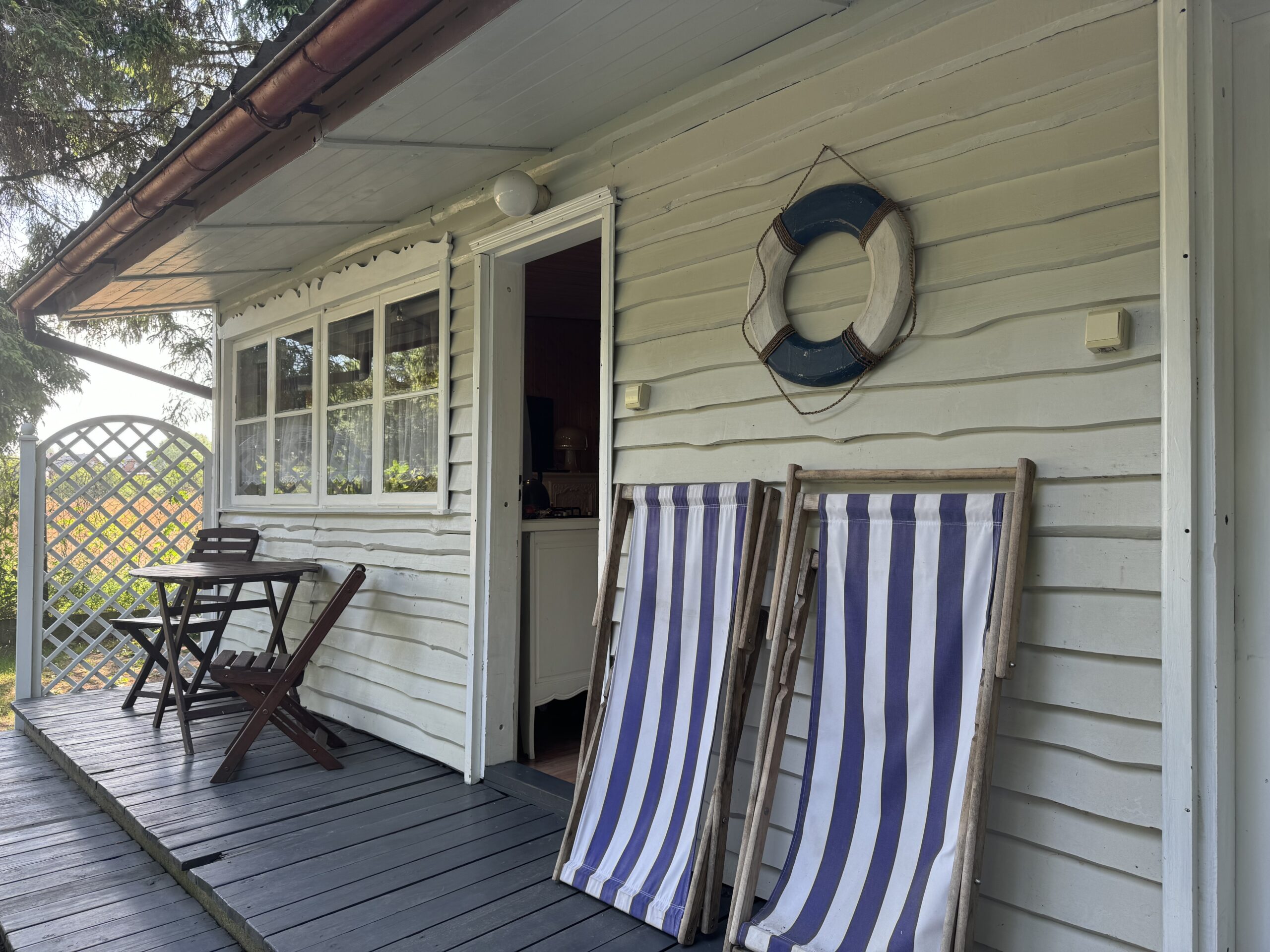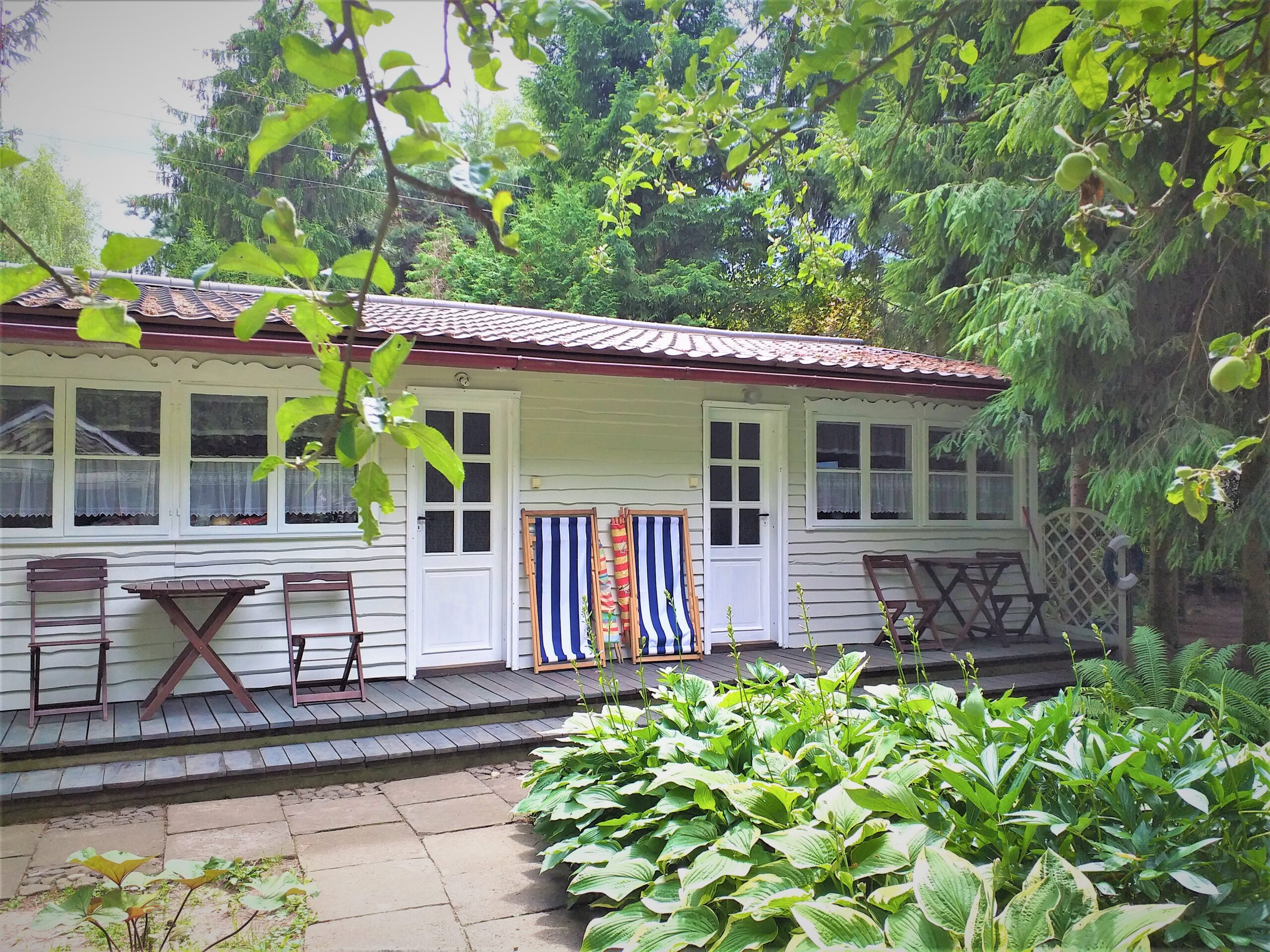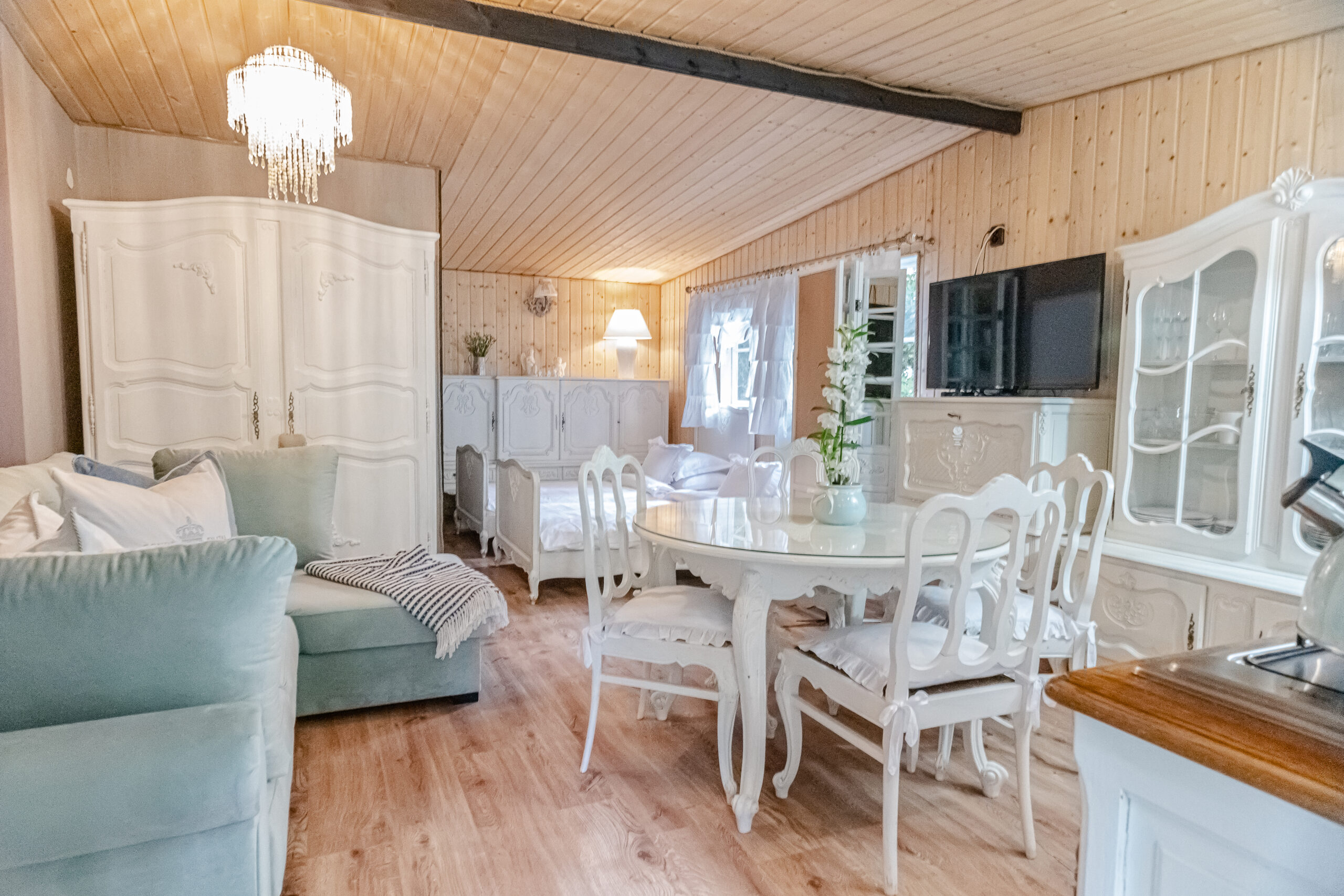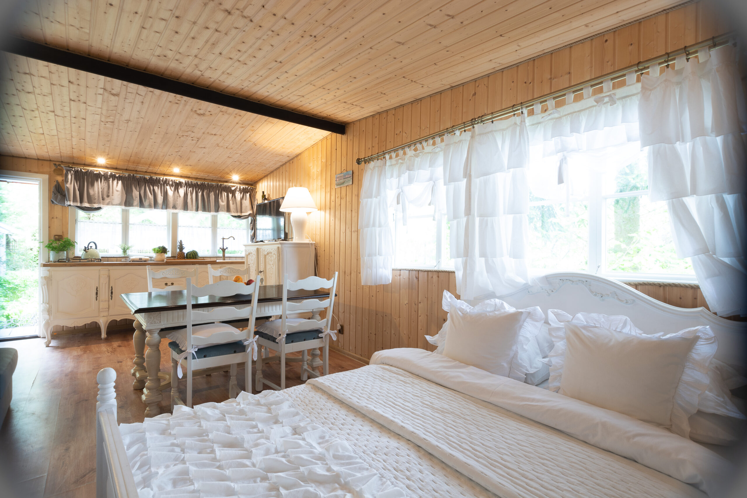 Aneks kuchenny w pełni wyposażony. Łazienka z prysznicem, WC, TV, grill. Dla każdej części dodatkowa altanka pełniąca rolę saloniku do dziennego pobytu i grillowania. Domek drewniany osadzony w starym sadzie niedostępnym dla innych gości, co zapewnia dużo prywatności.