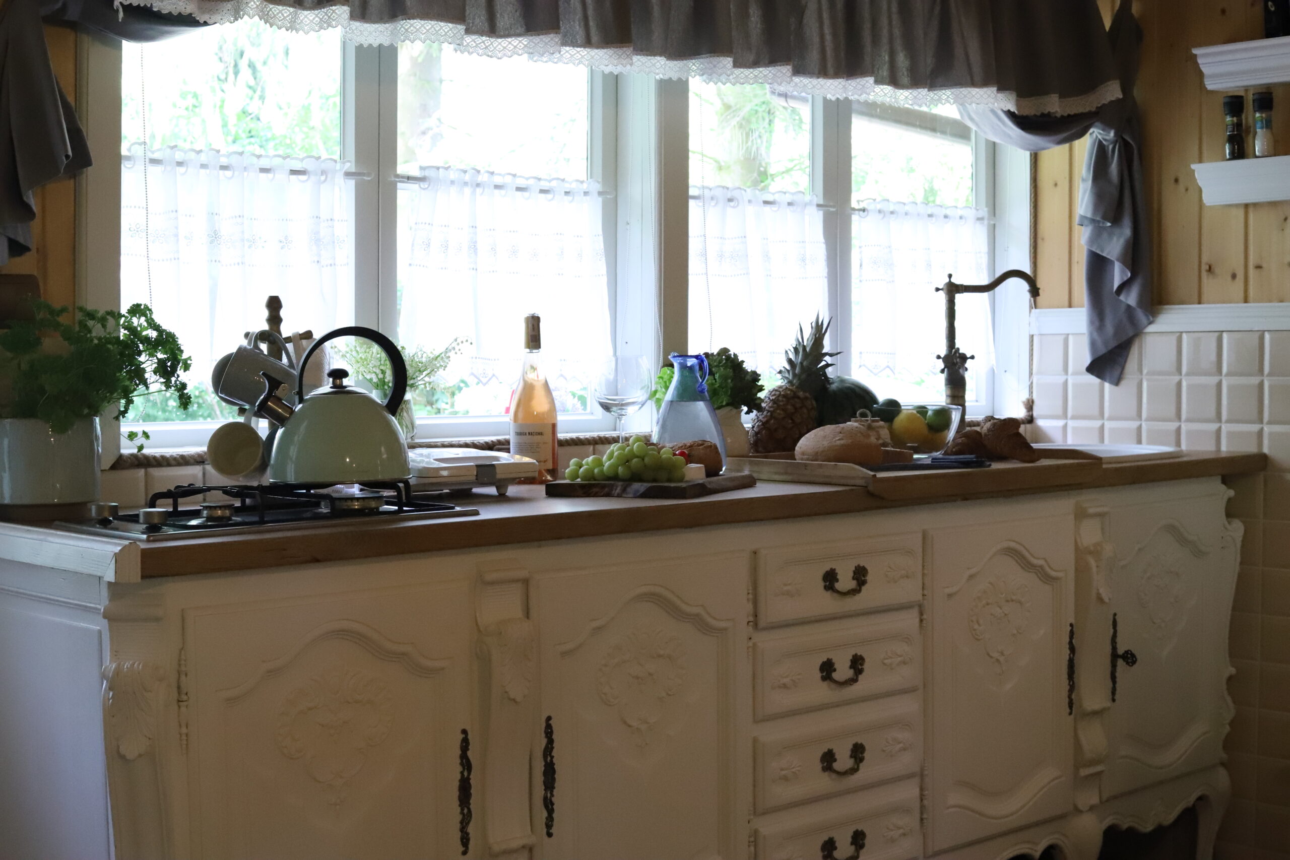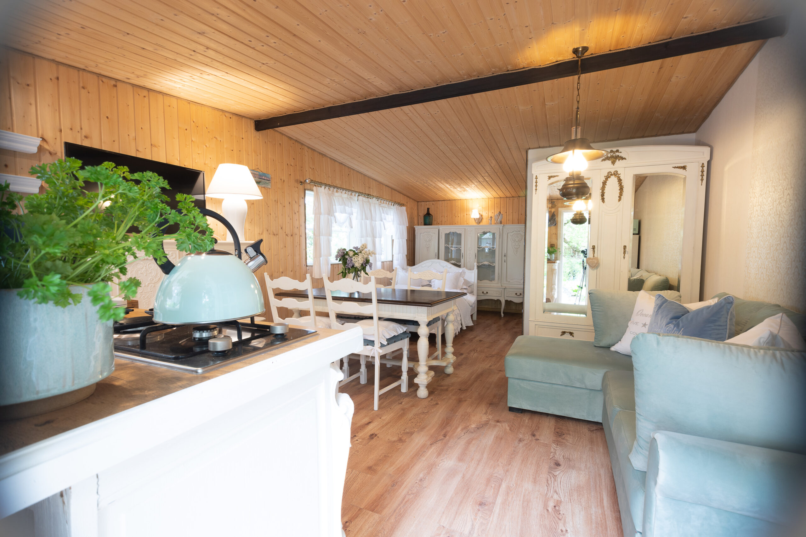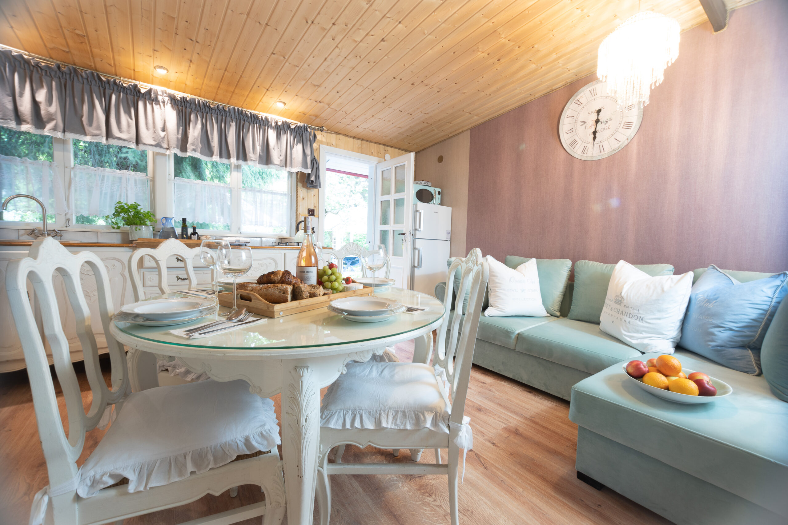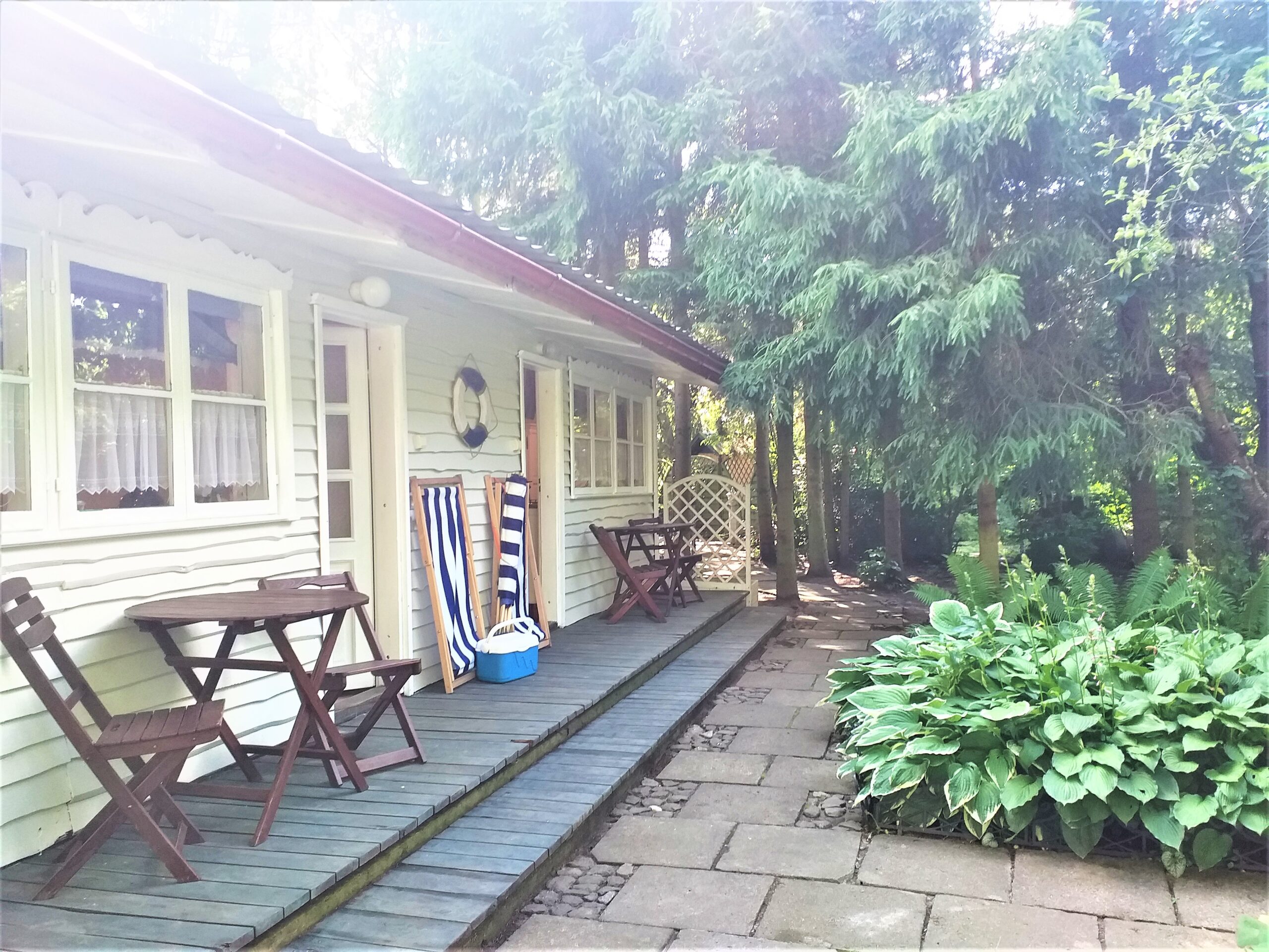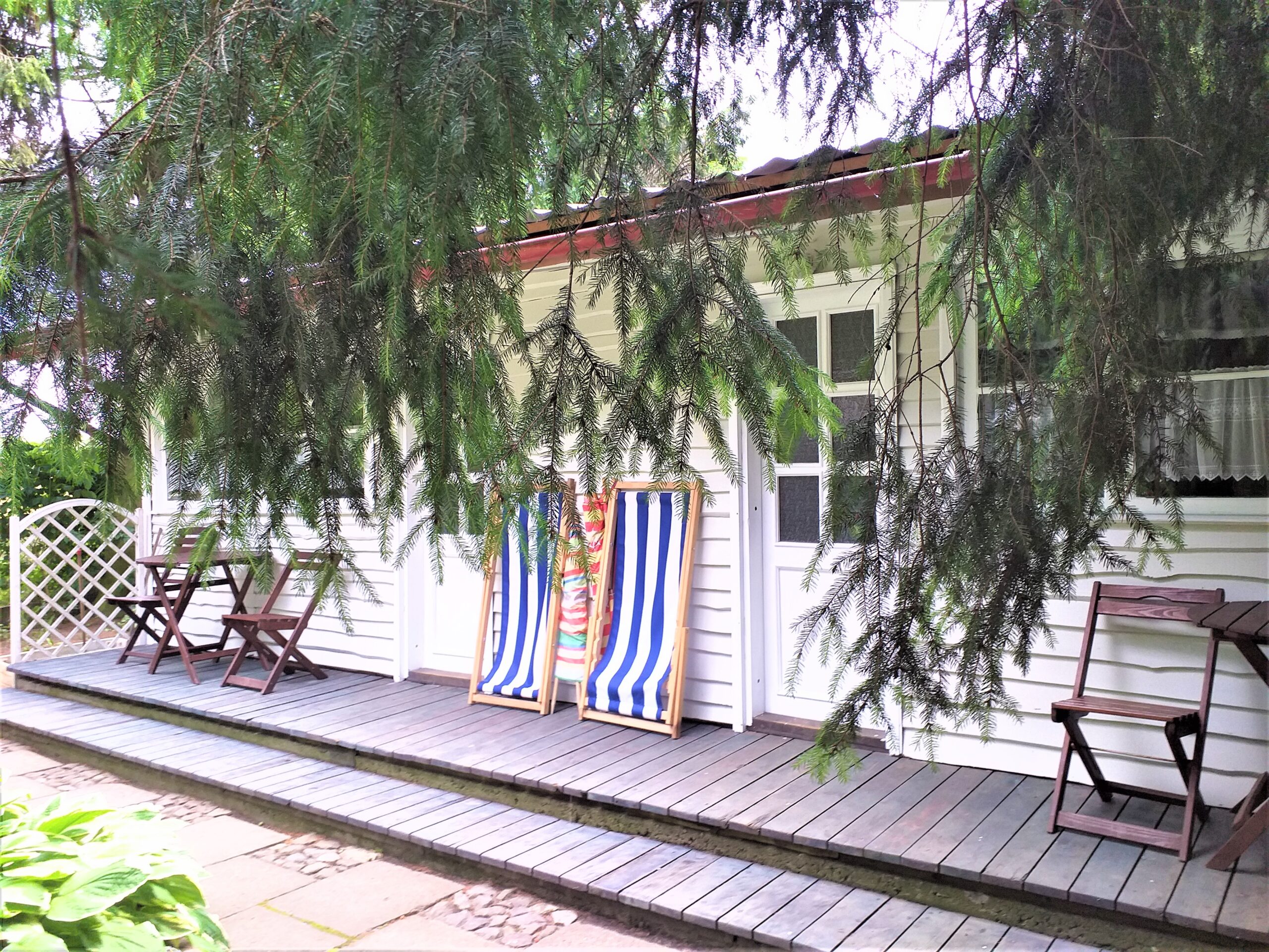 Aneks kuchenny w pełni wyposażony. Łazienka z prysznicem, WC, TV, grill. Dla każdej części dodatkowa altanka pełniąca rolę saloniku do dziennego pobytu i grillowania. Domek drewniany osadzony w starym sadzie niedostępnym dla innych gości, co zapewnia dużo prywatności.