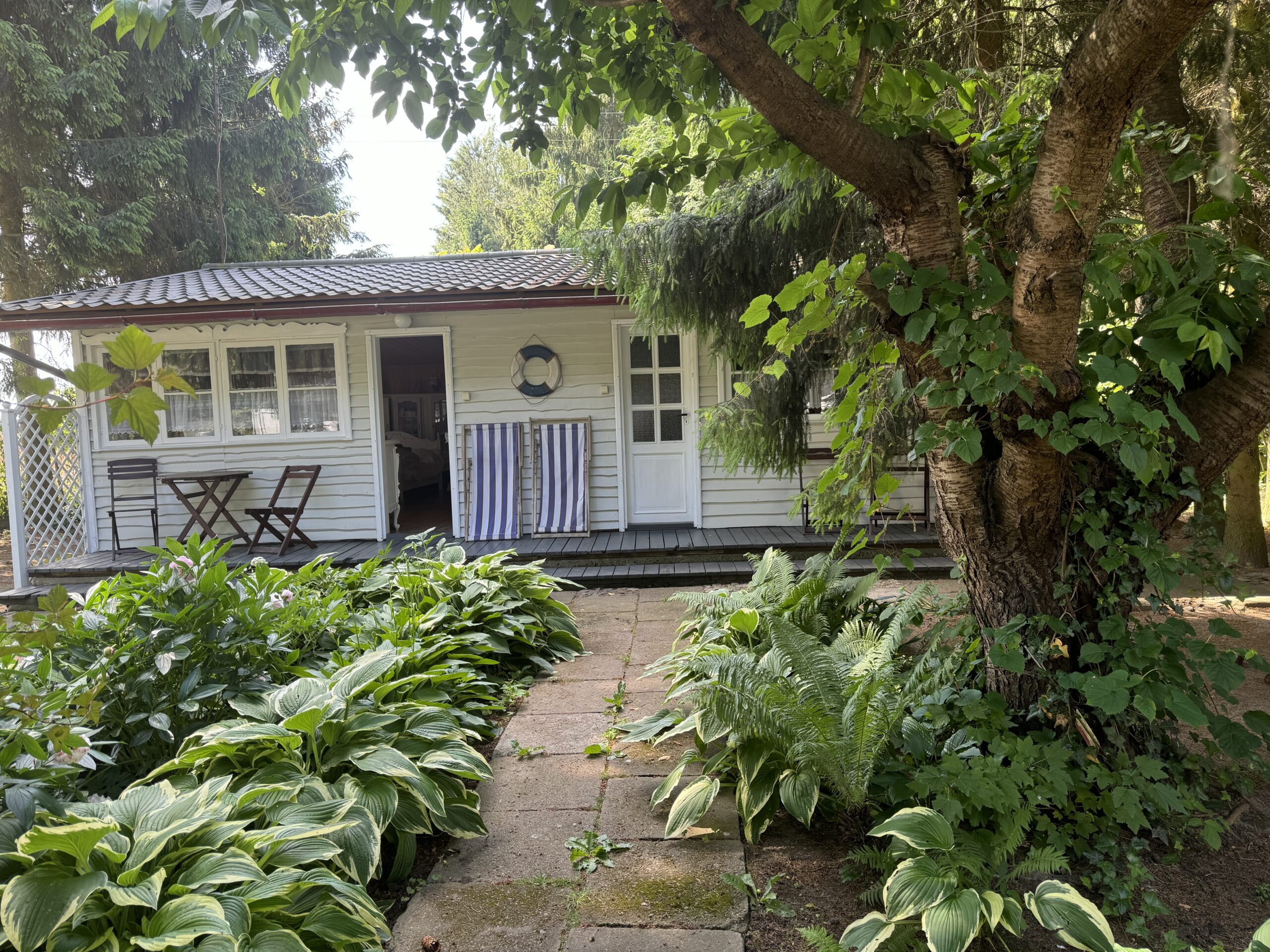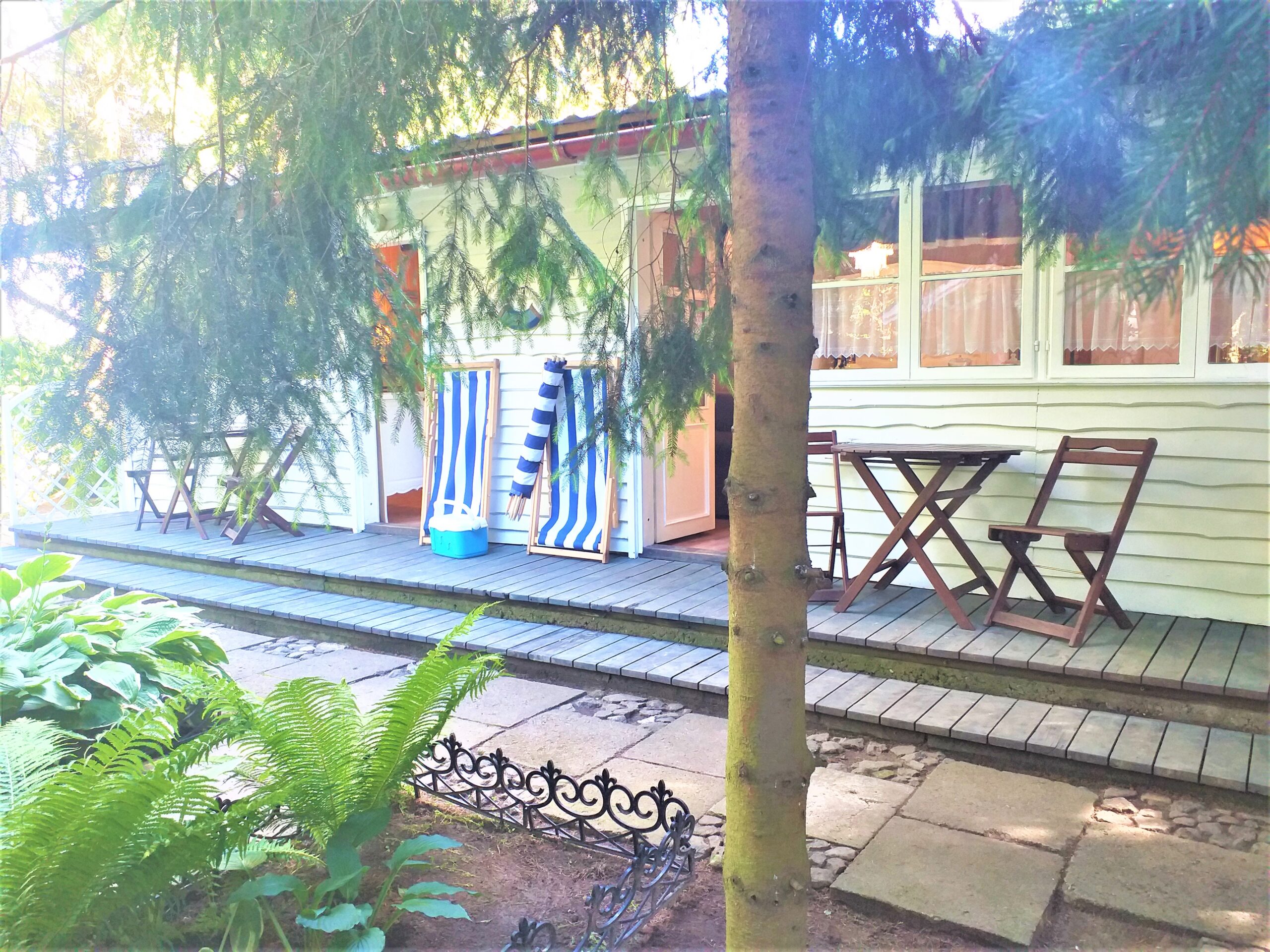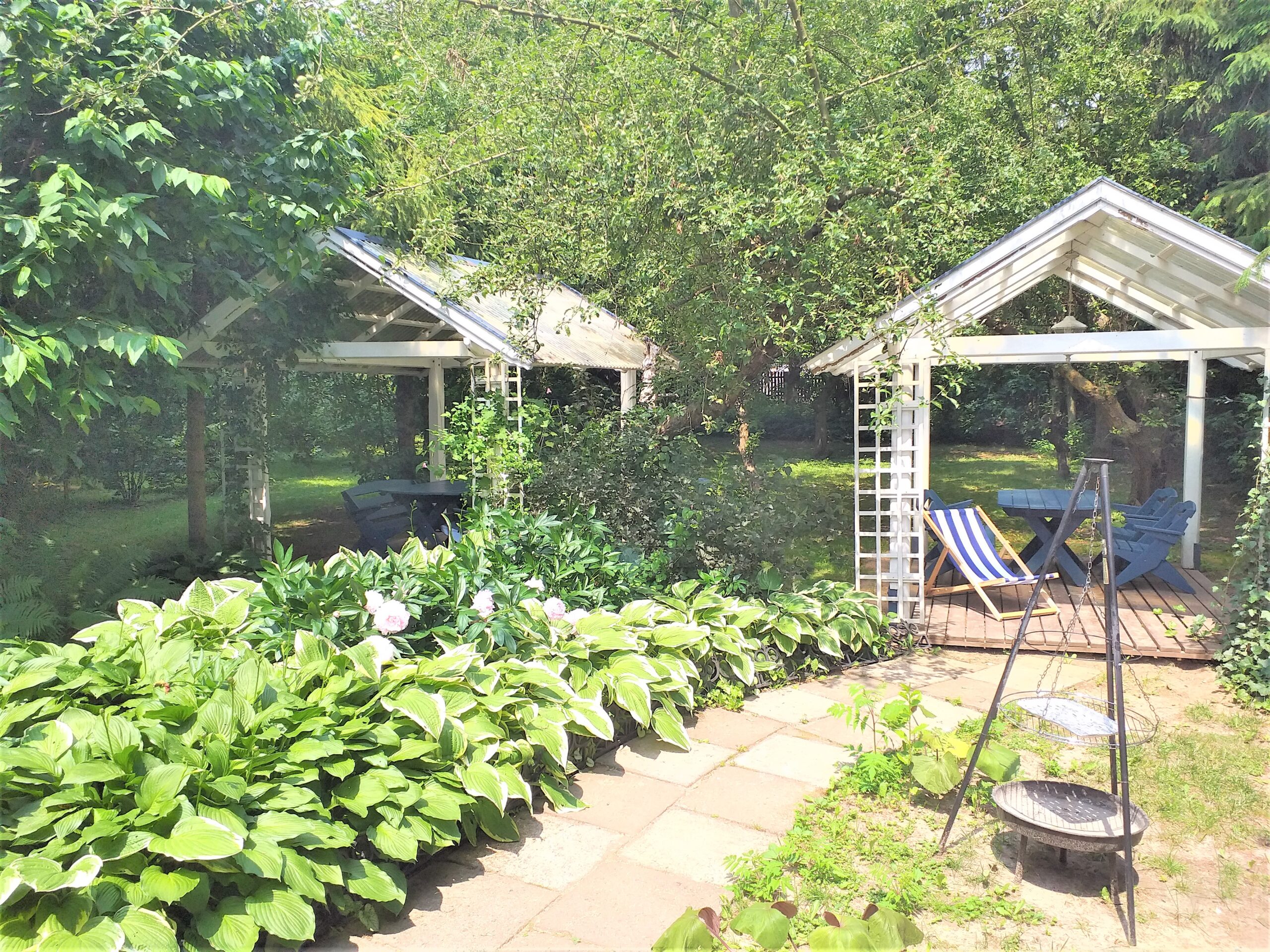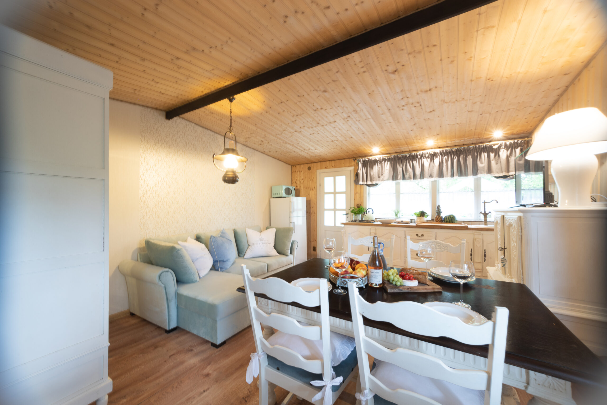 Aneks kuchenny w pełni wyposażony. Łazienka z prysznicem, WC, TV, grill. Dla każdej części dodatkowa altanka pełniąca rolę saloniku do dziennego pobytu i grillowania. Domek drewniany osadzony w starym sadzie niedostępnym dla innych gości, co zapewnia dużo prywatności.