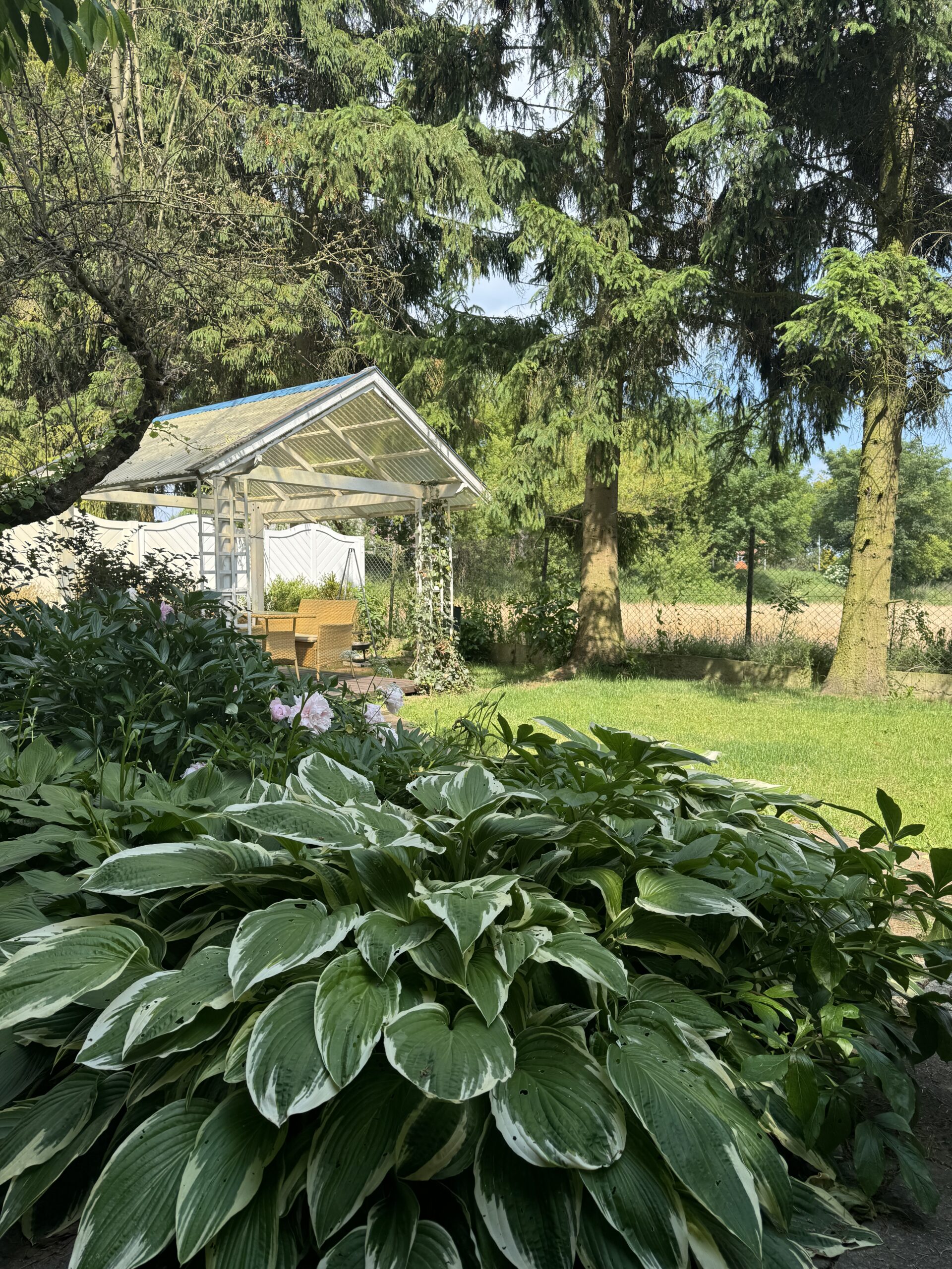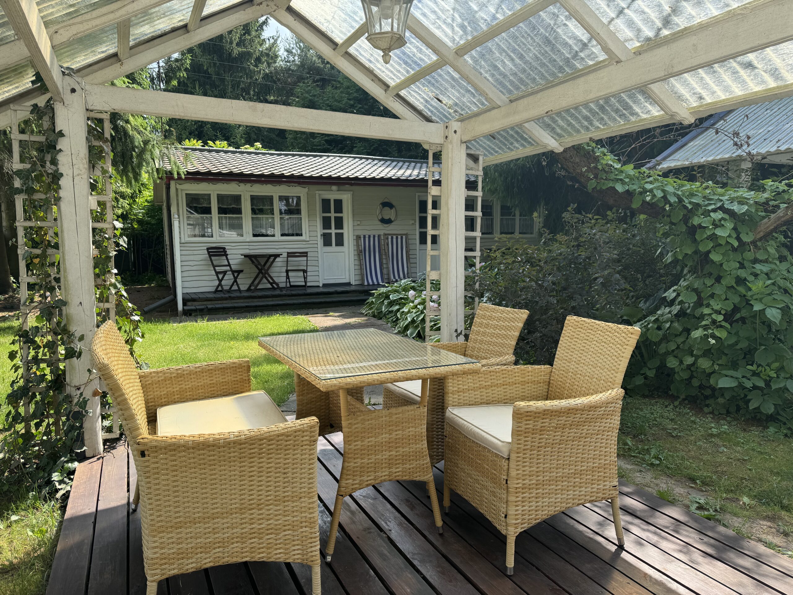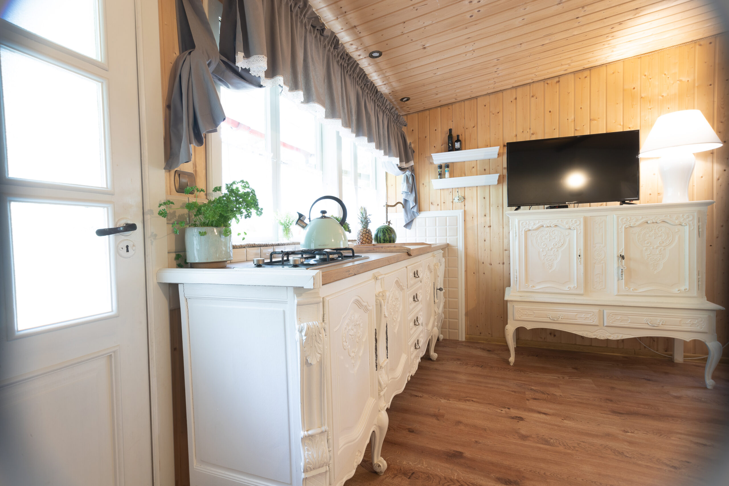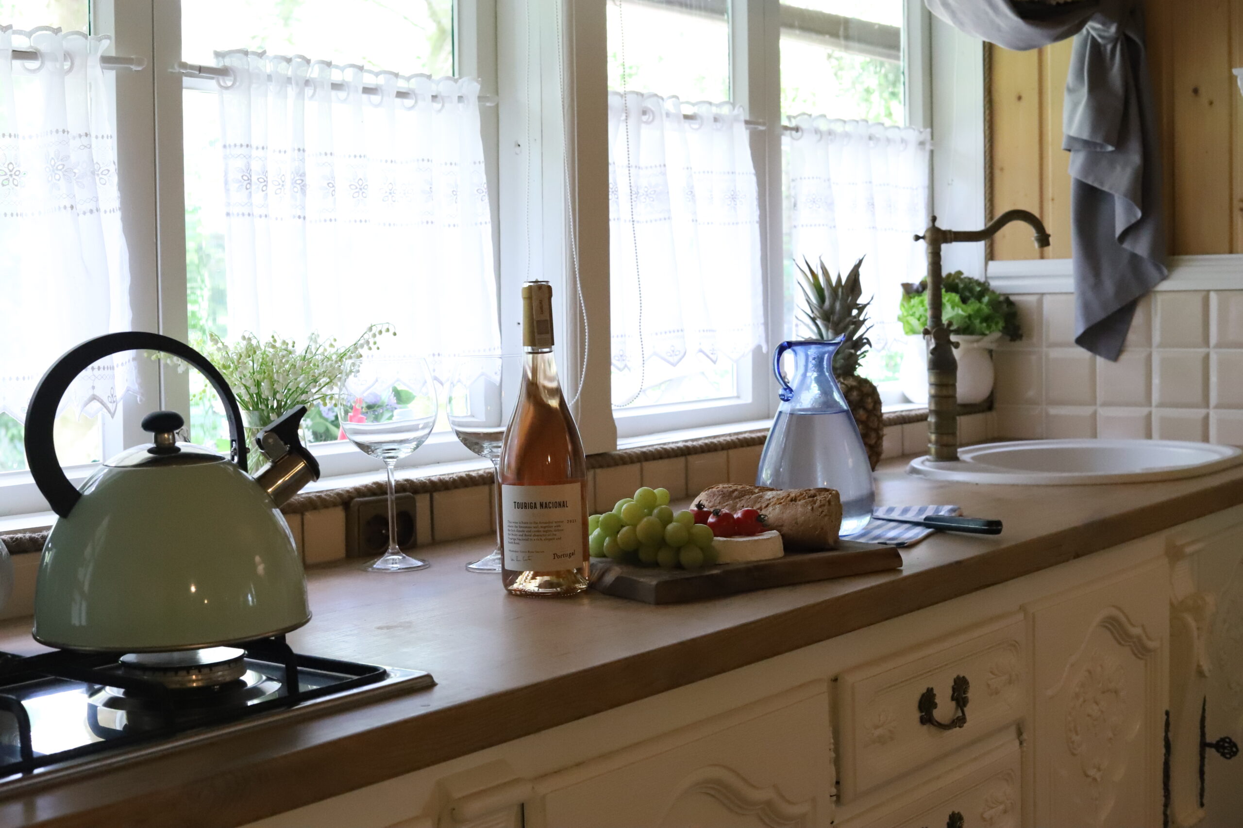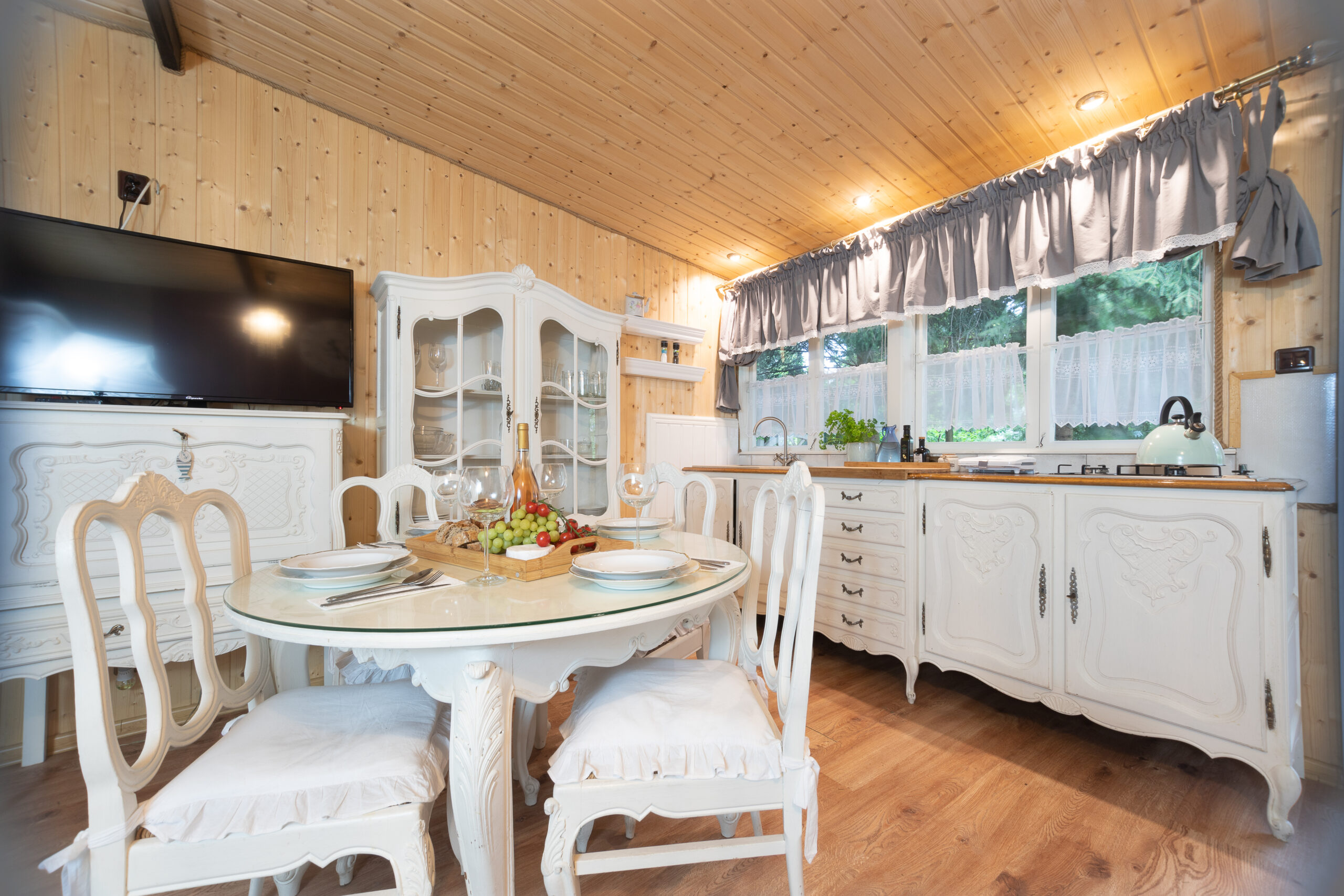 Aneks kuchenny w pełni wyposażony. Łazienka z prysznicem, WC, TV, grill. Dla każdej części dodatkowa altanka pełniąca rolę saloniku do dziennego pobytu i grillowania. Domek drewniany osadzony w starym sadzie niedostępnym dla innych gości, co zapewnia dużo prywatności.