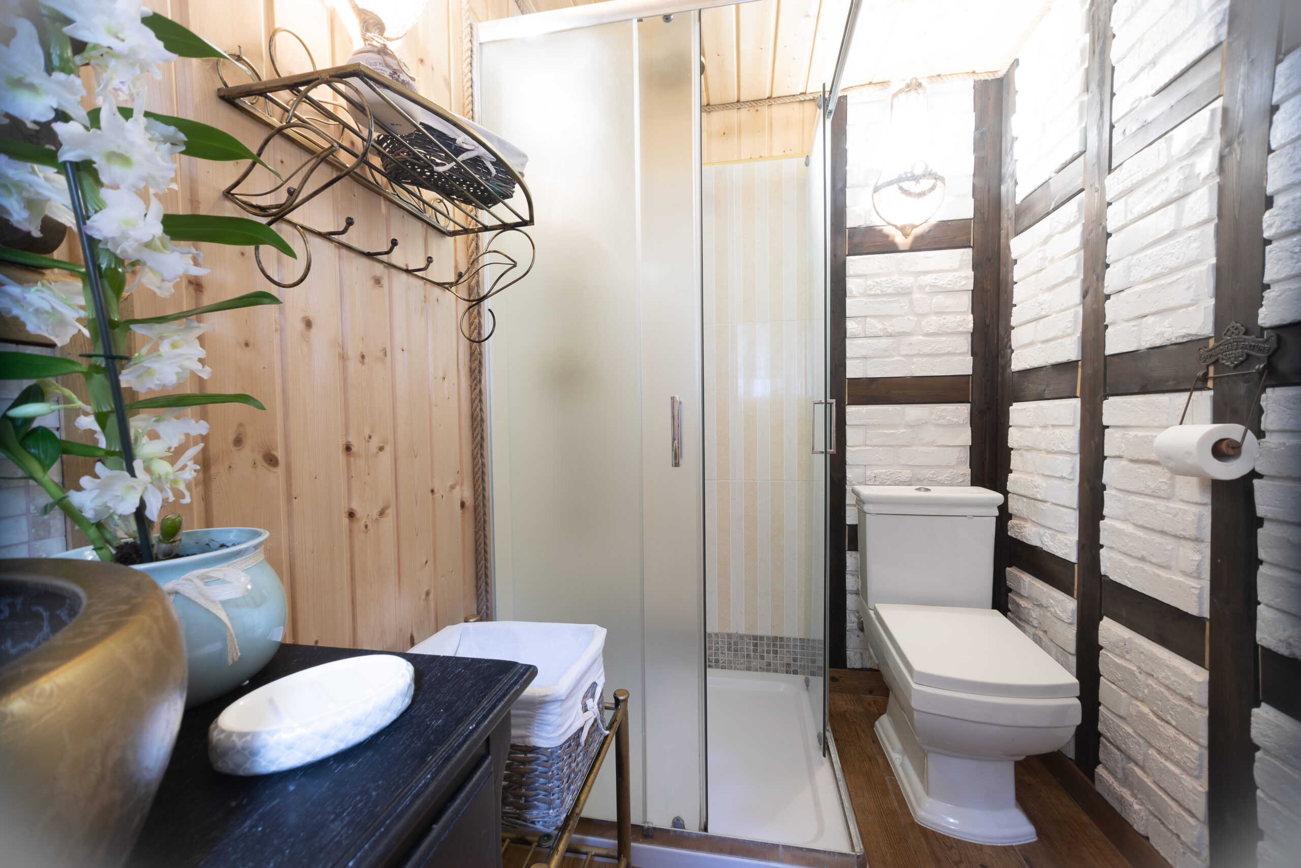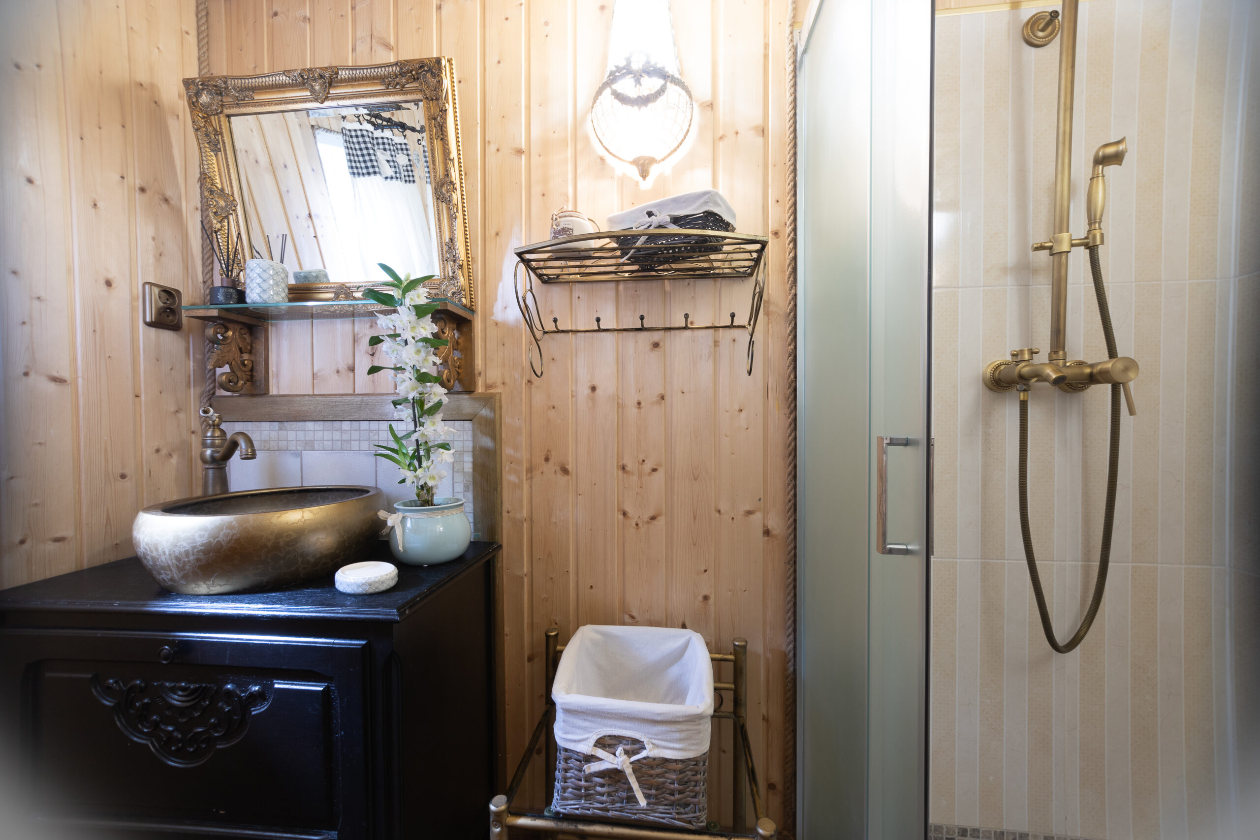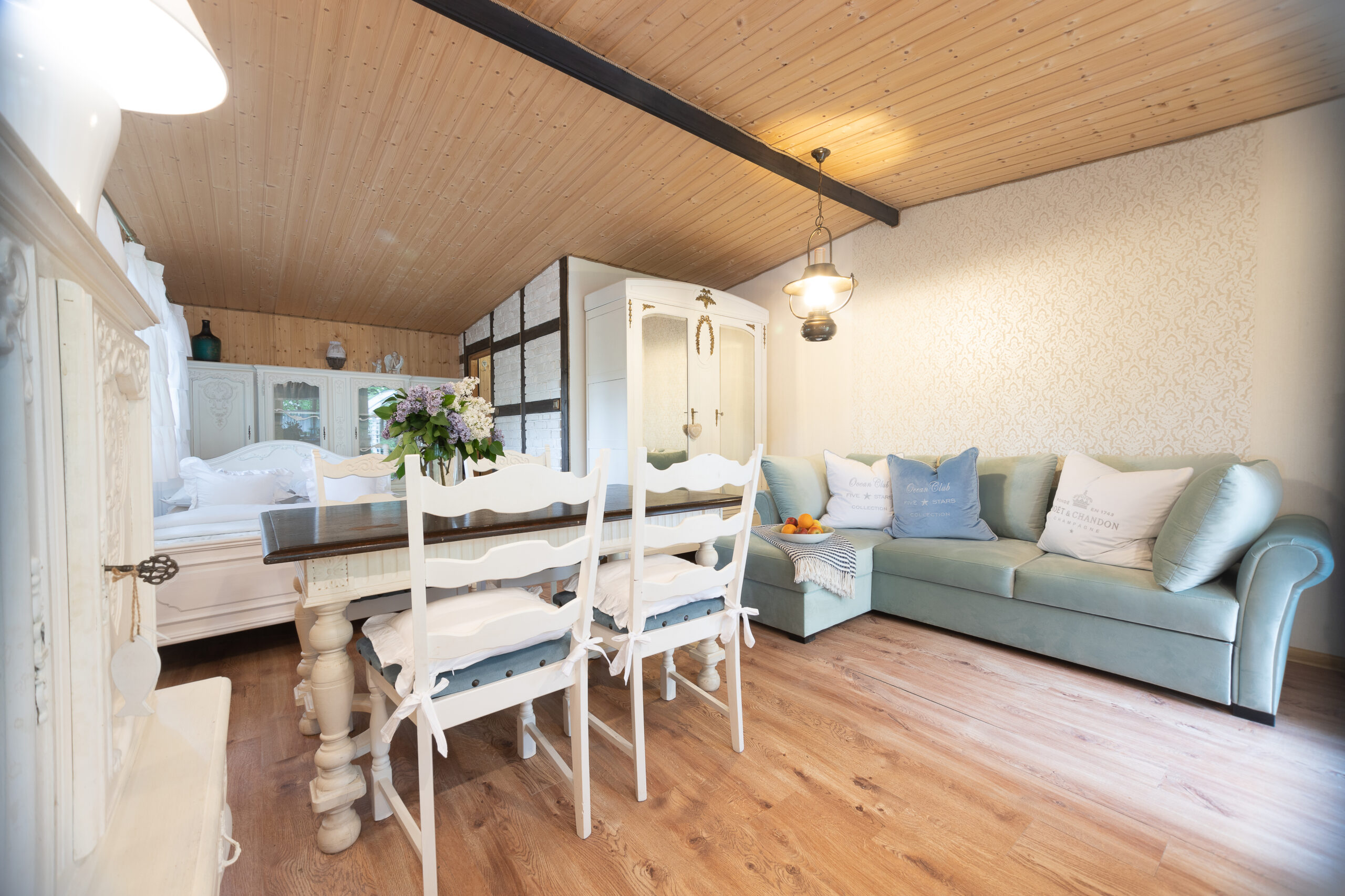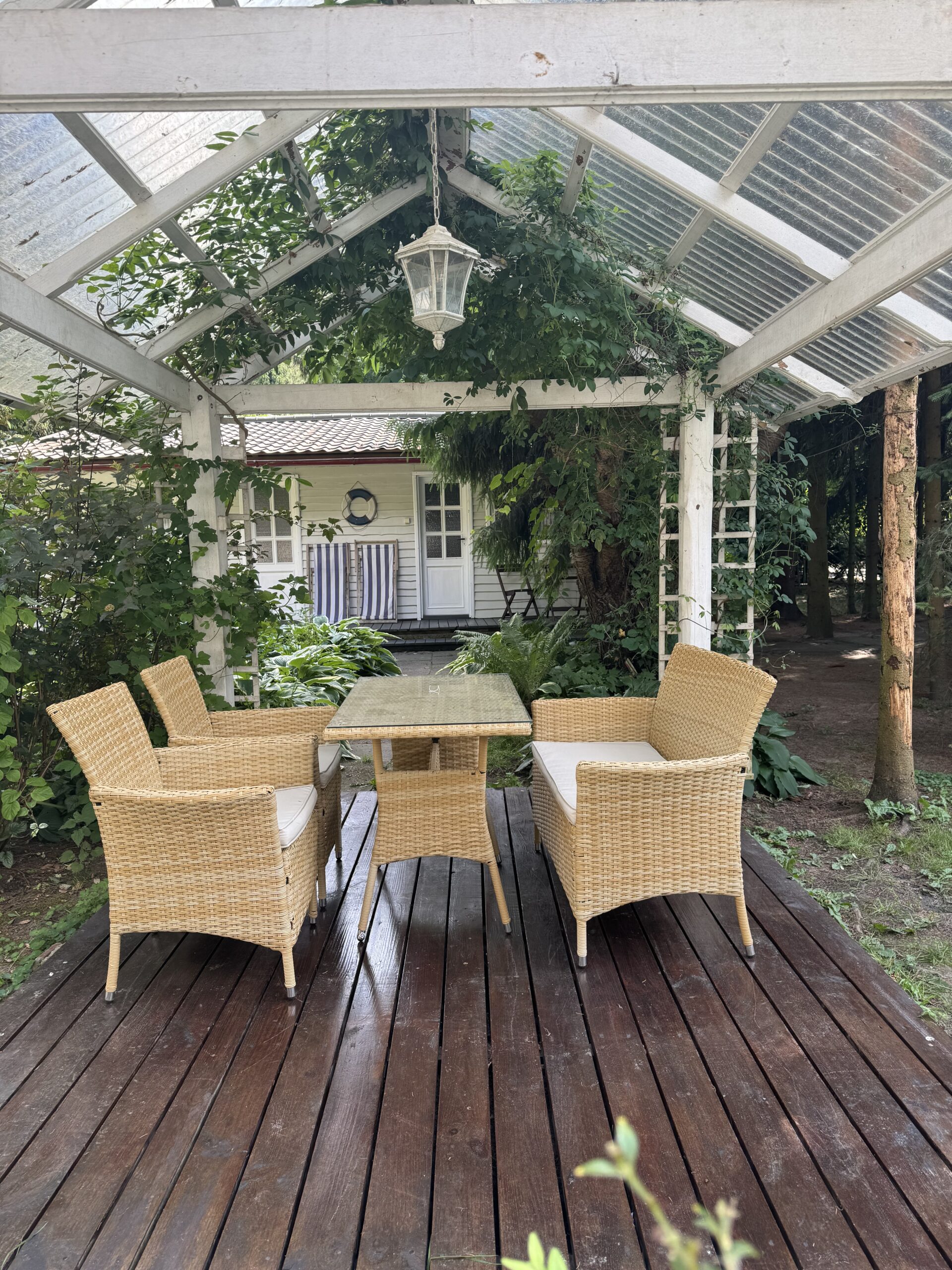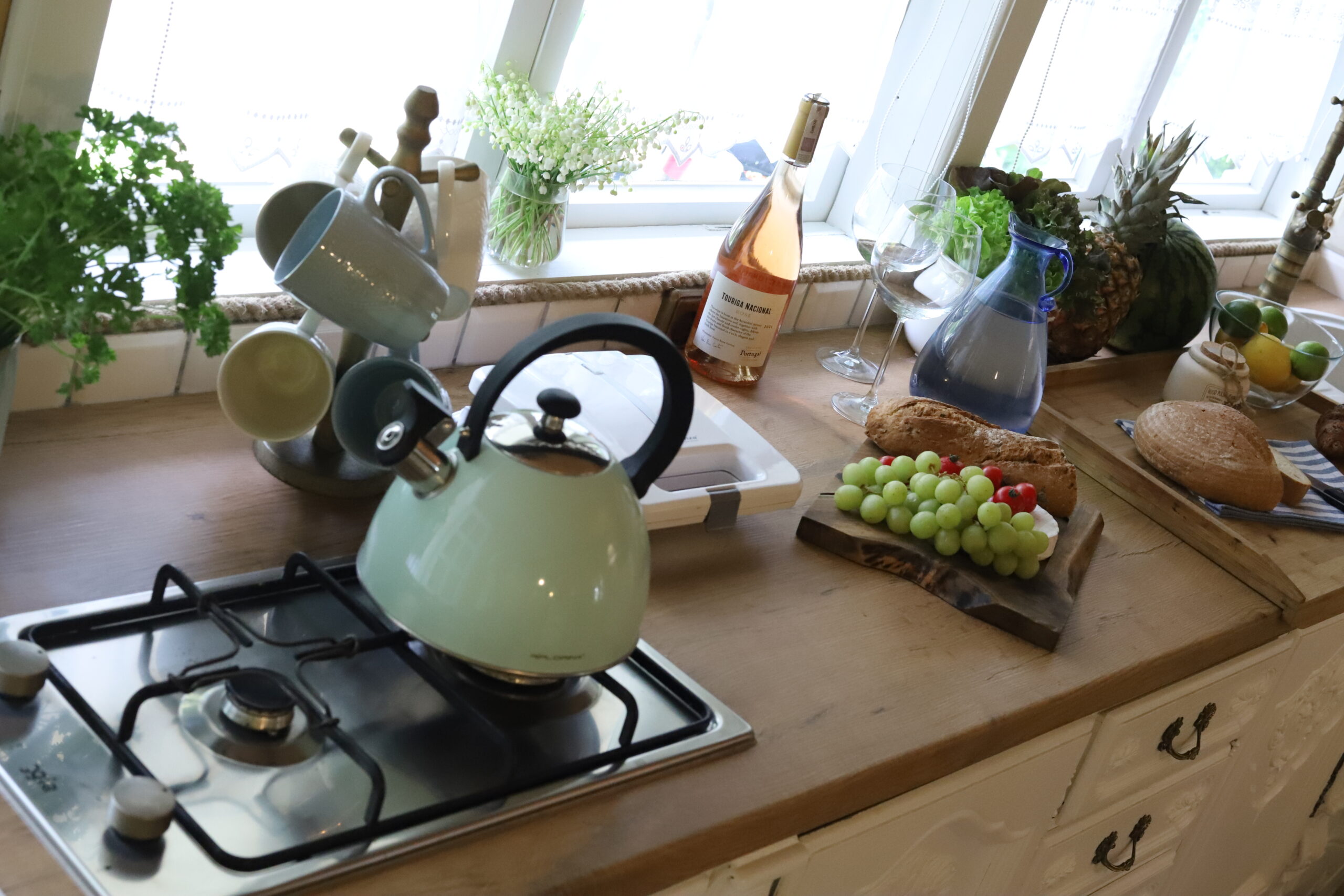 Aneks kuchenny w pełni wyposażony. Łazienka z prysznicem, WC, TV, grill. Dla każdej części dodatkowa altanka pełniąca rolę saloniku do dziennego pobytu i grillowania. Domek drewniany osadzony w starym sadzie niedostępnym dla innych gości, co zapewnia dużo prywatności.
