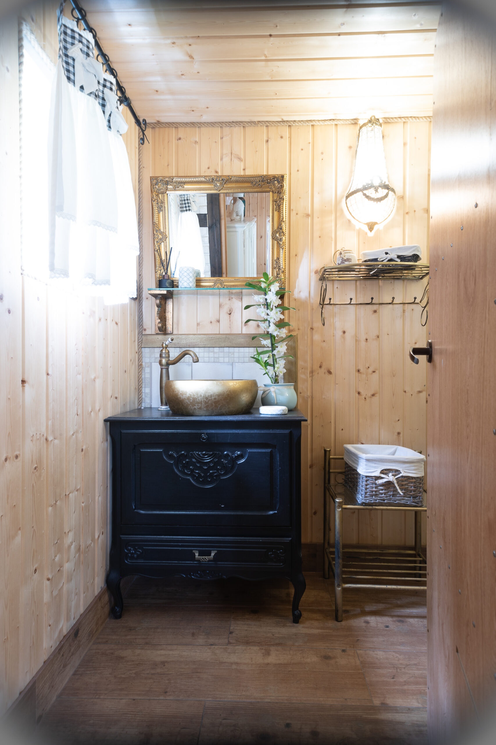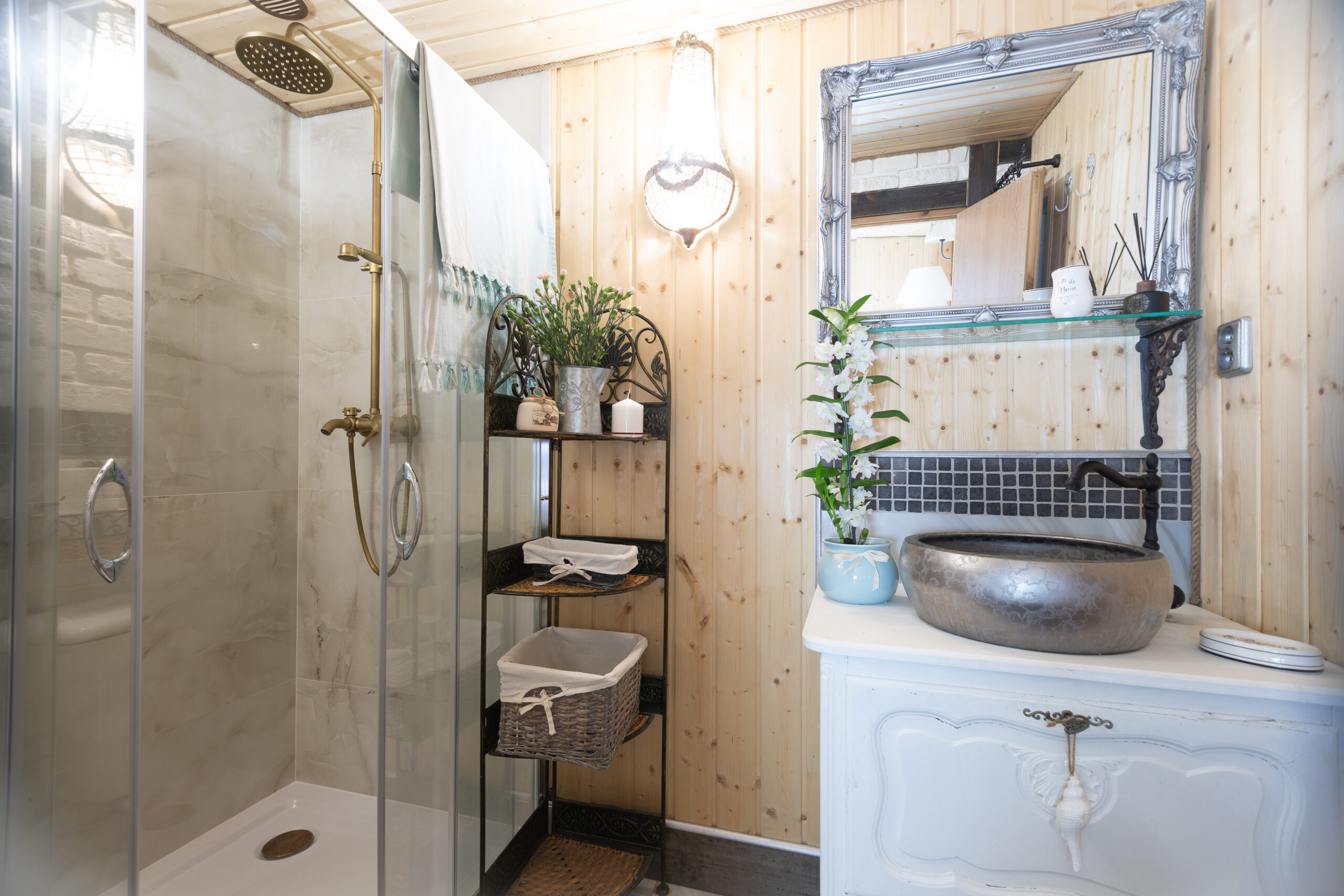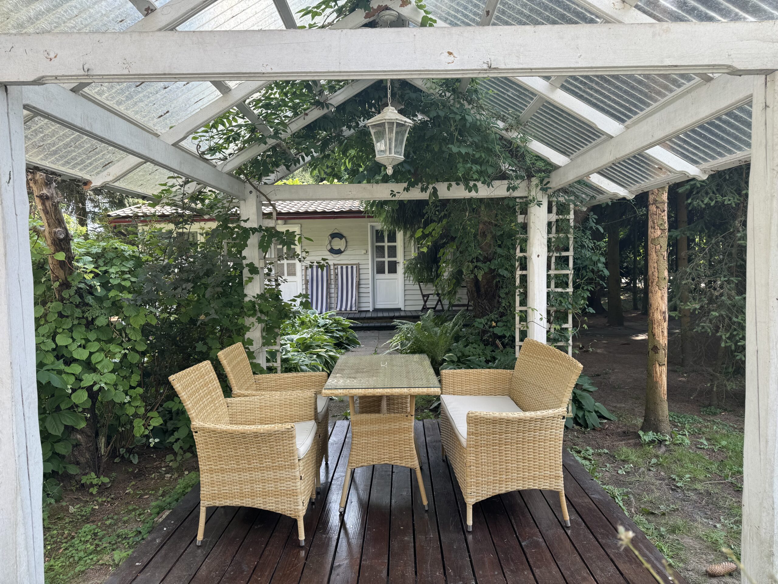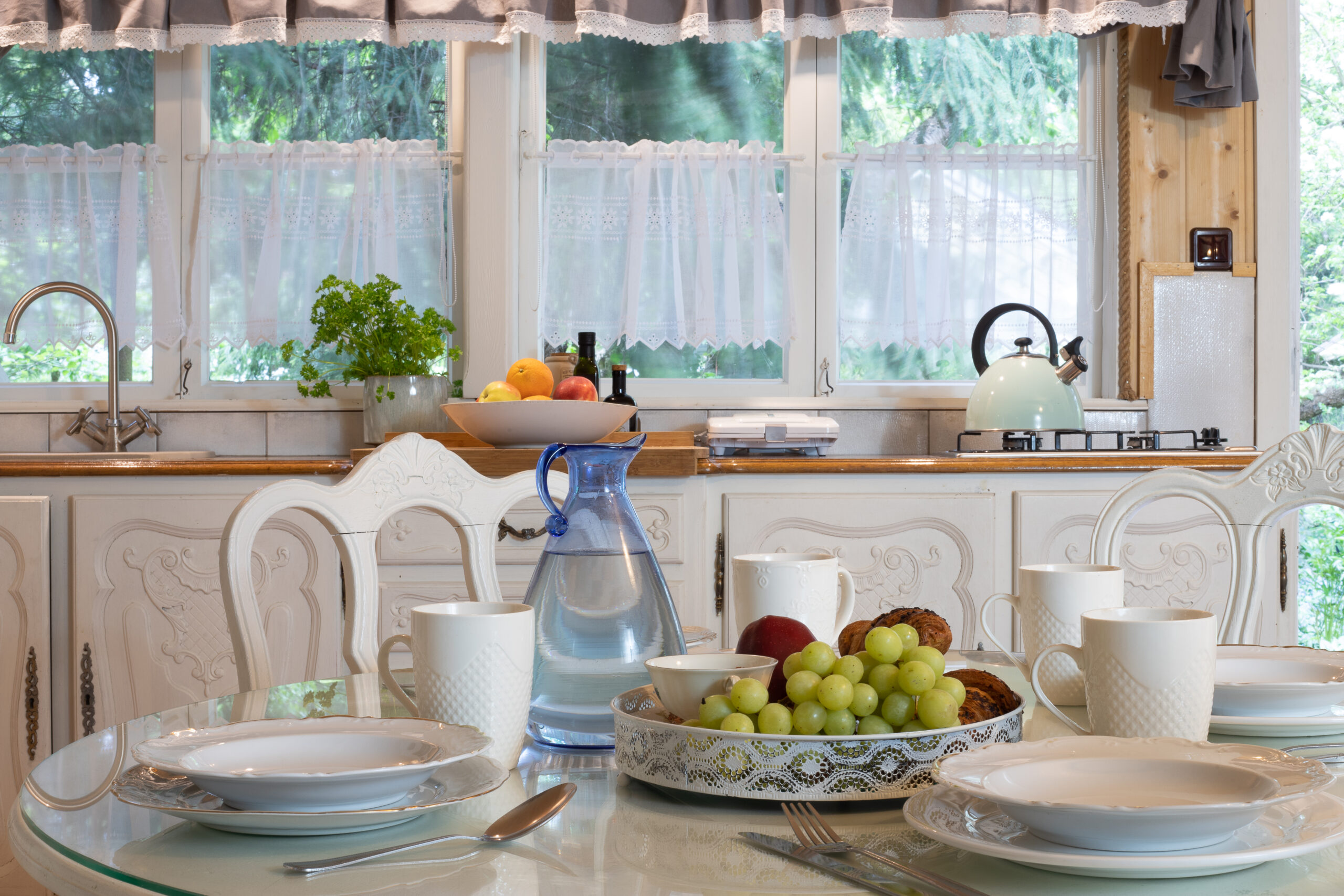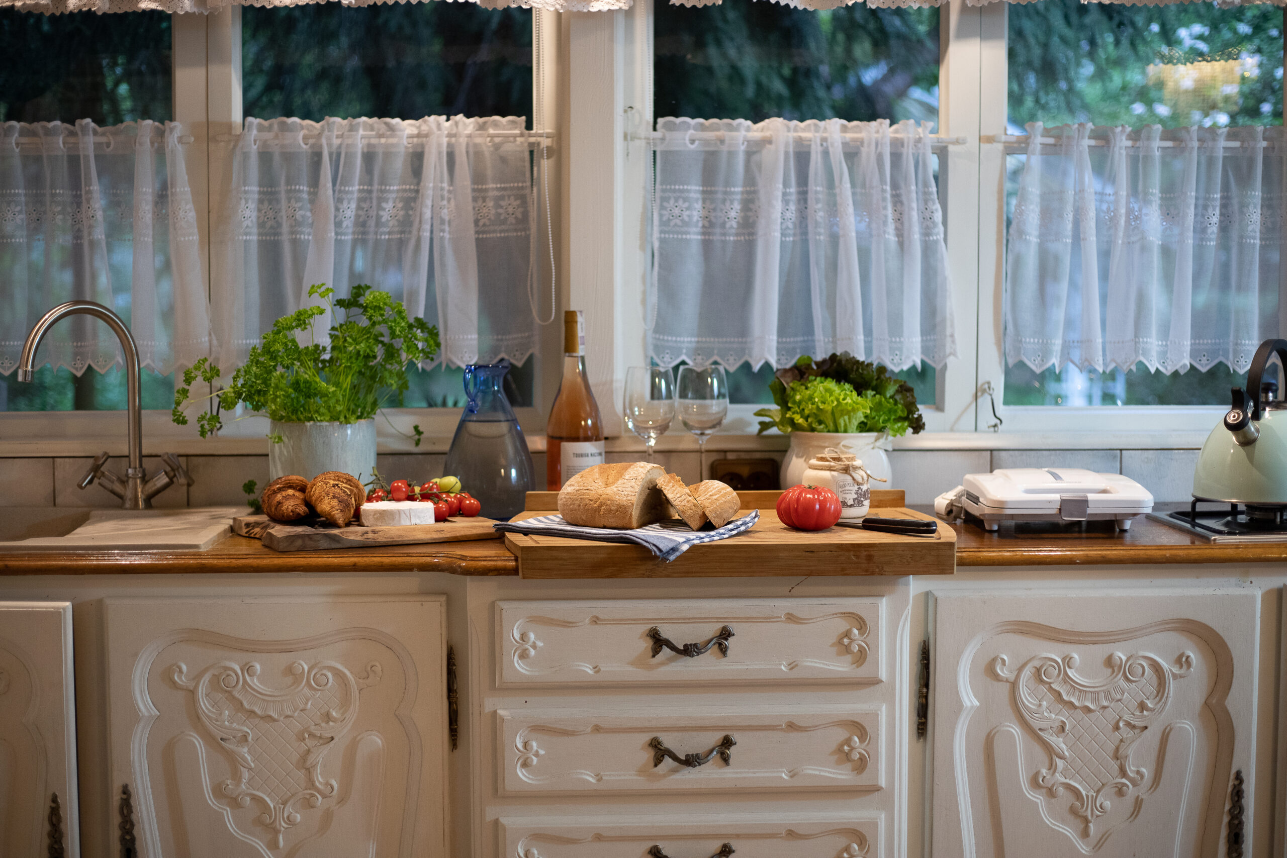 Aneks kuchenny w pełni wyposażony. Łazienka z prysznicem, WC, TV, grill. Dla każdej części dodatkowa altanka pełniąca rolę saloniku do dziennego pobytu i grillowania. Domek drewniany osadzony w starym sadzie niedostępnym dla innych gości, co zapewnia dużo prywatności.