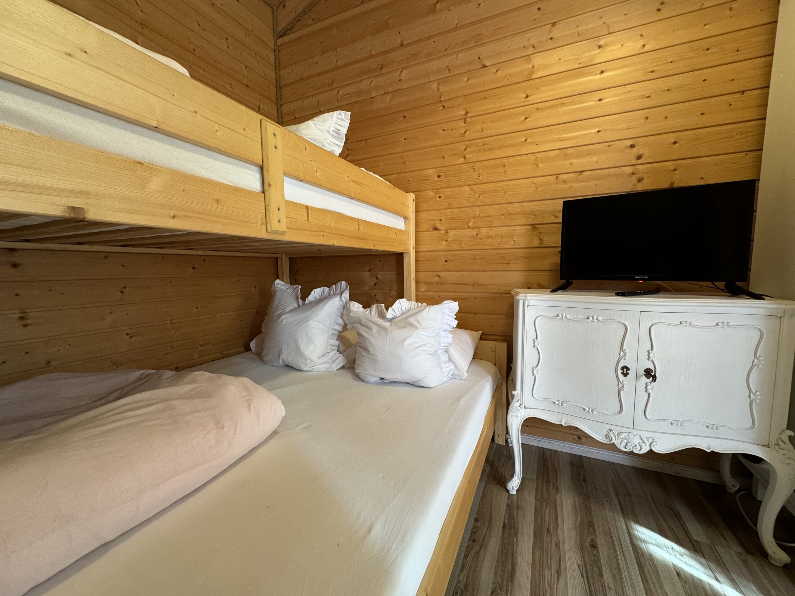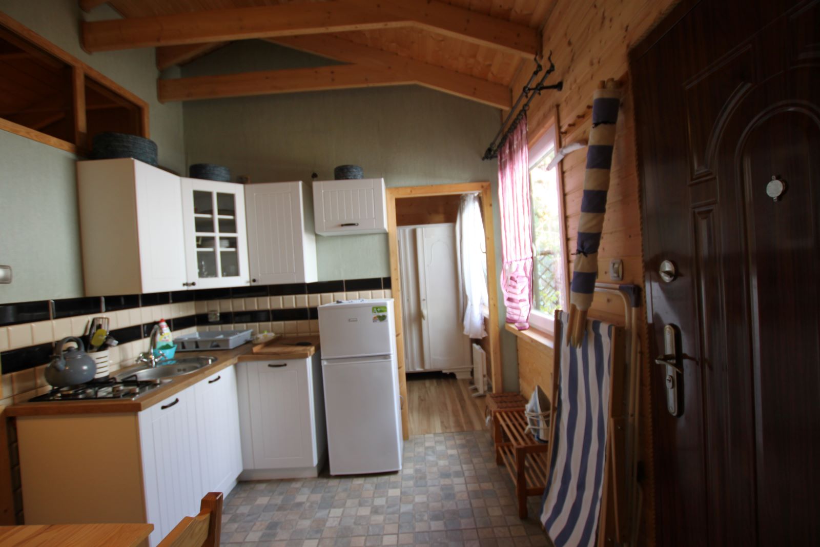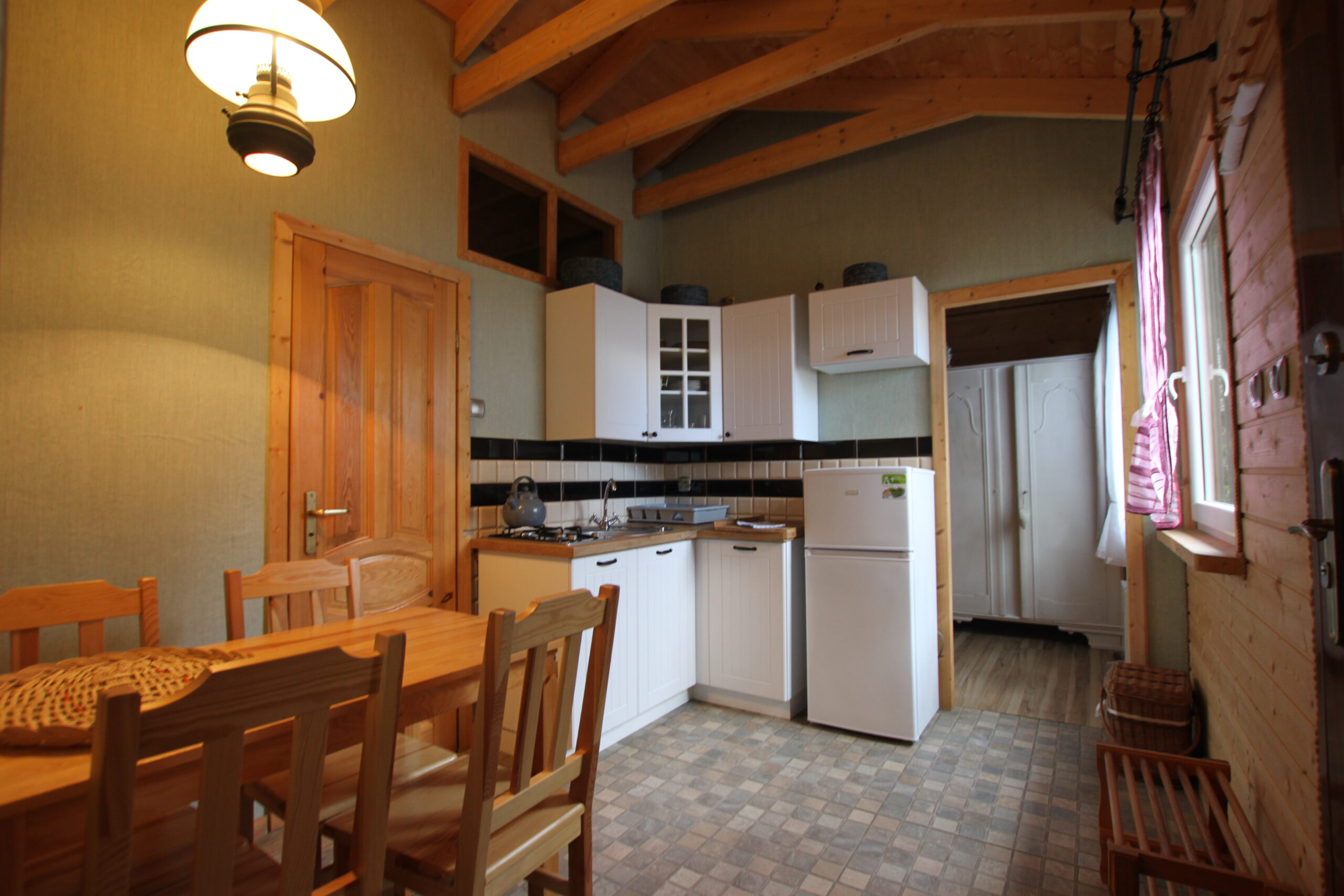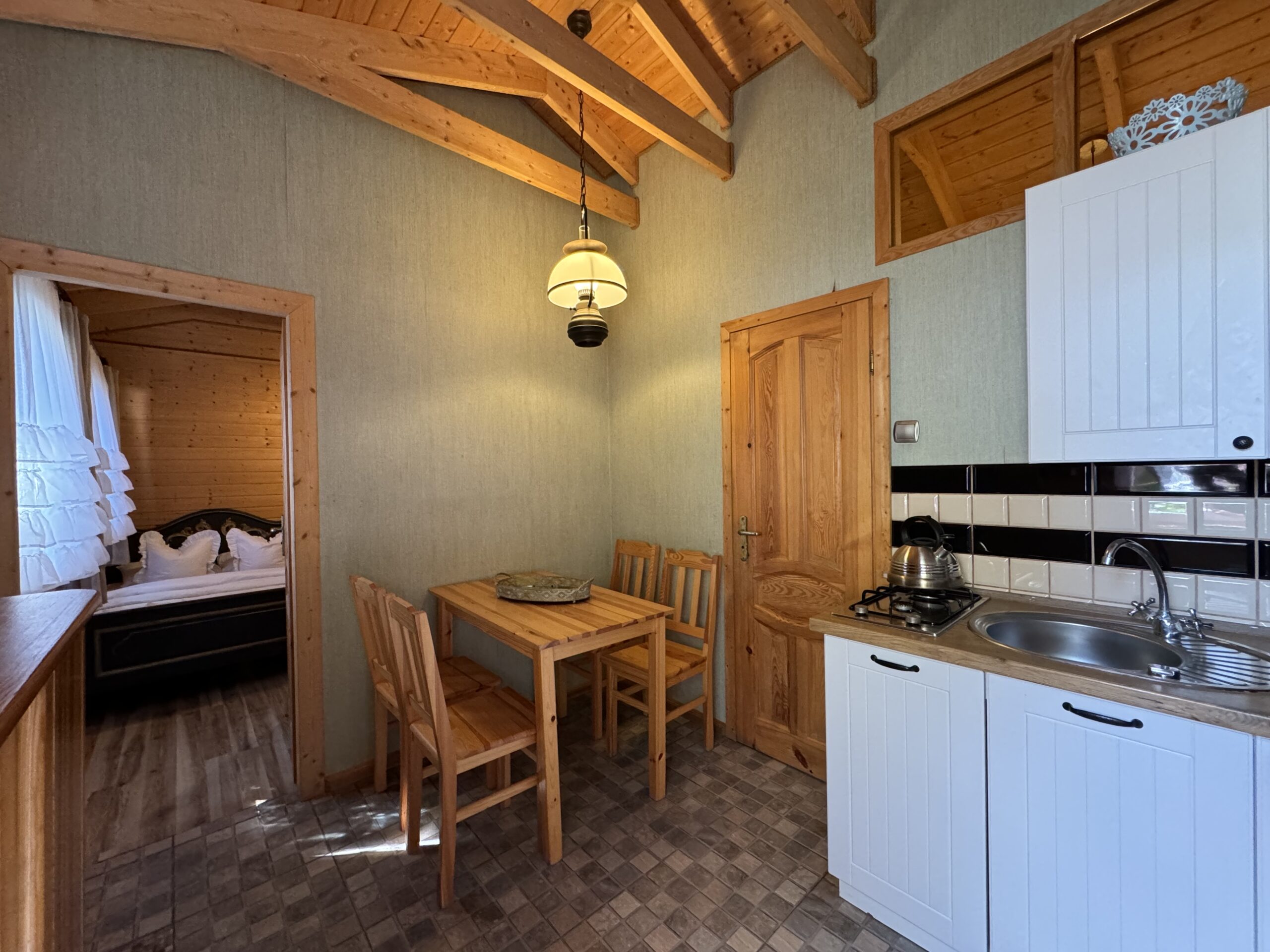 Dwie sypialnie: pierwsza 2-osobowa z możliwością spania dla dwóch dodatkowych osób (sofa narożna z funkcją spania), także możliwość dostawienia łóżeczka dziecięcego oraz drga 3-osobowa. Łazienka z prysznicem, WC. Kompletna kuchnia.
