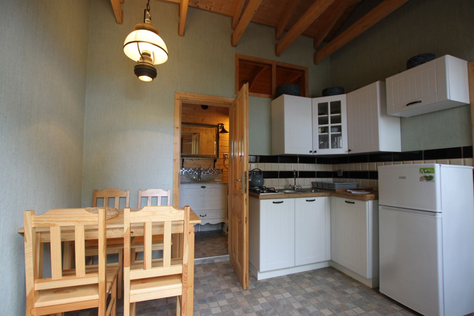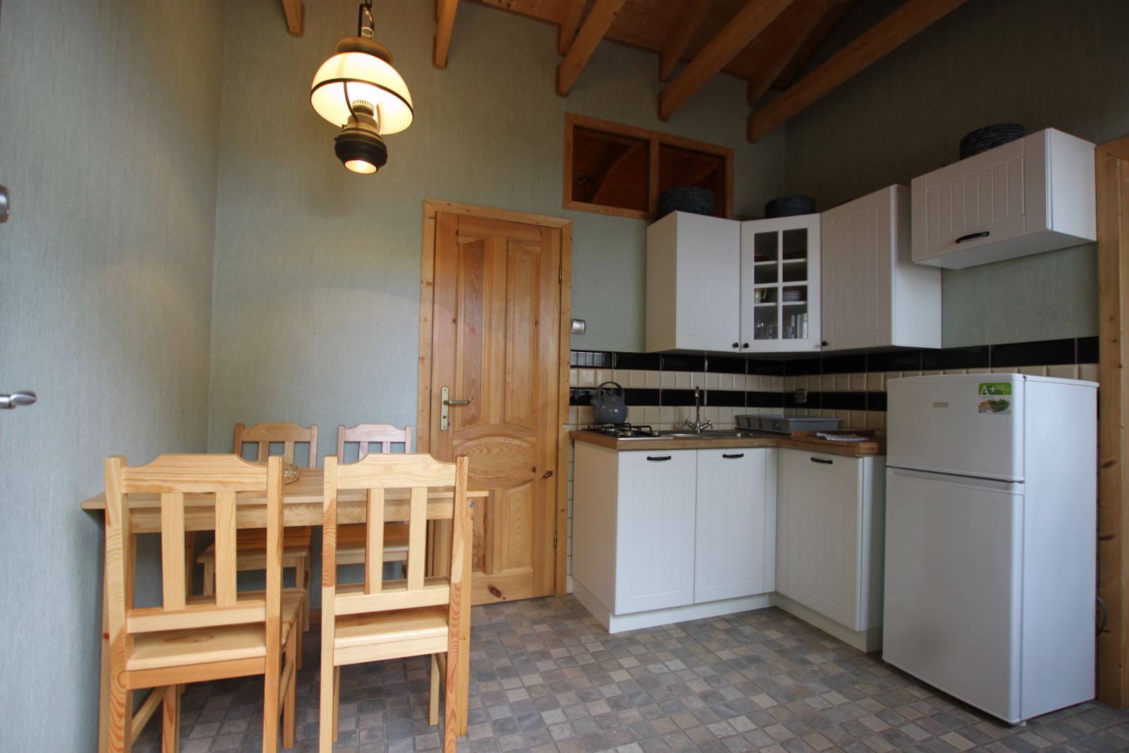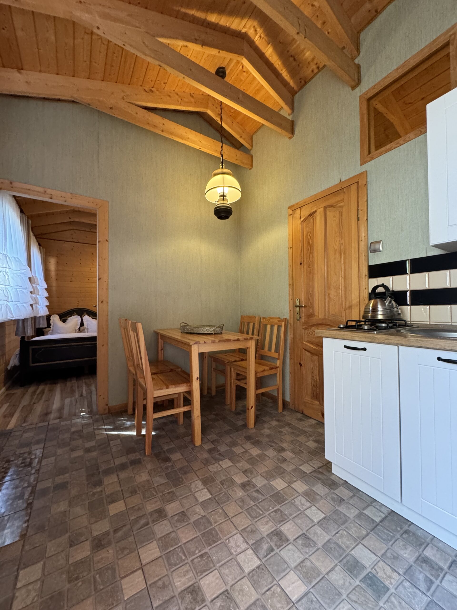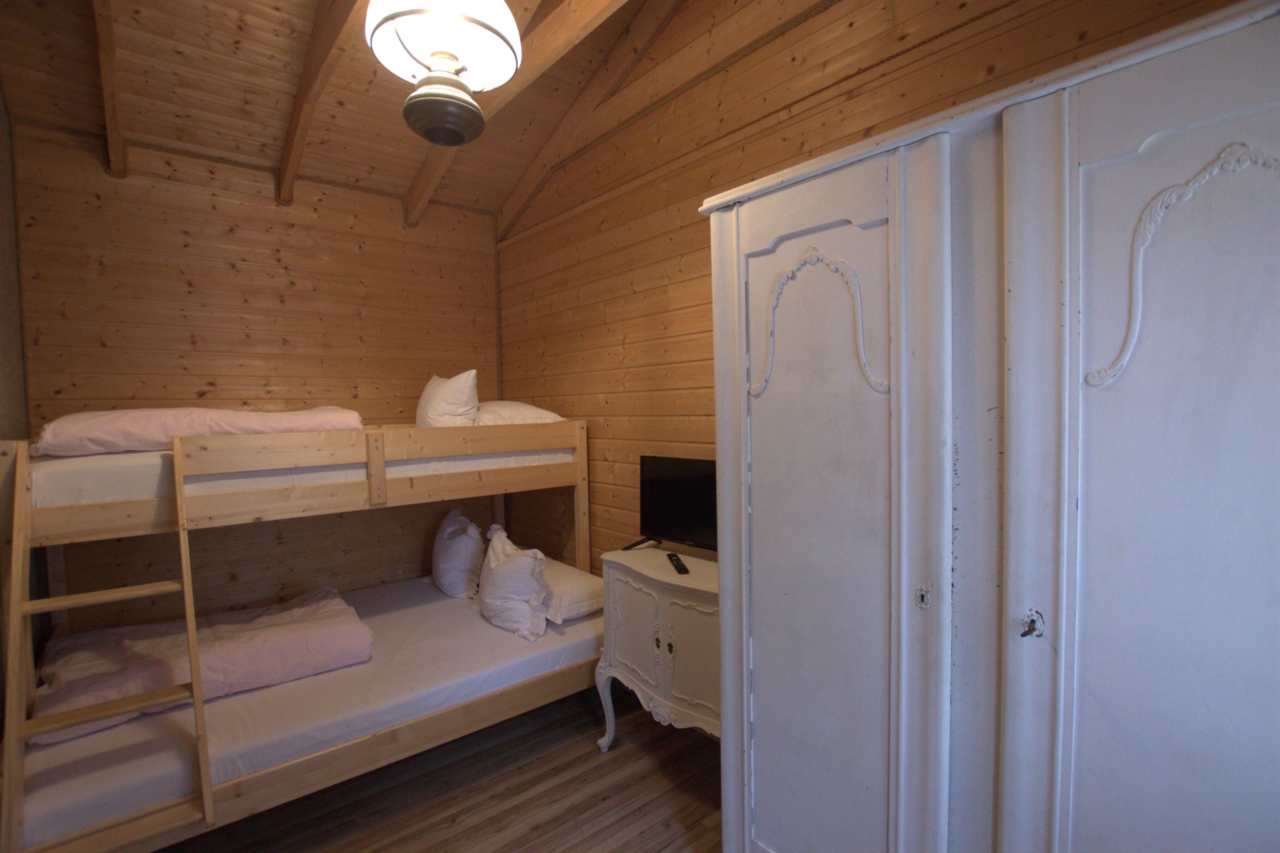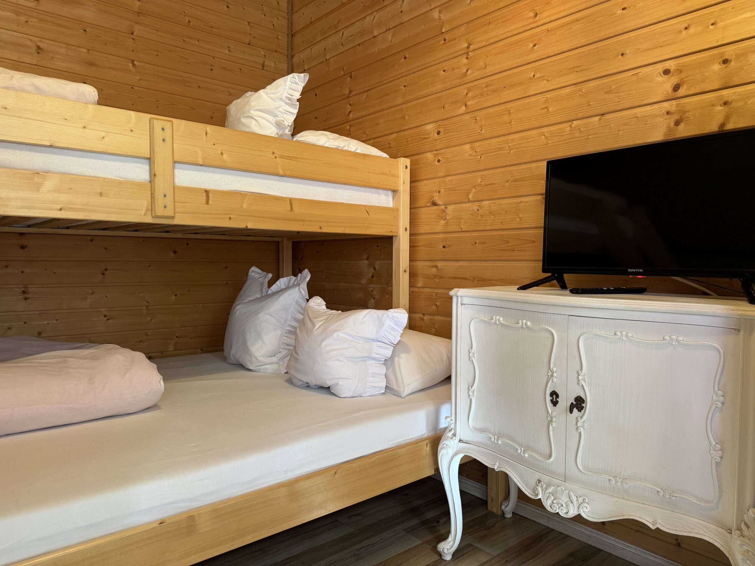 Dwie sypialnie: pierwsza 2-osobowa z możliwością spania dla dwóch dodatkowych osób (sofa narożna z funkcją spania), także możliwość dostawienia łóżeczka dziecięcego oraz drga 3-osobowa. Łazienka z prysznicem, WC. Kompletna kuchnia.