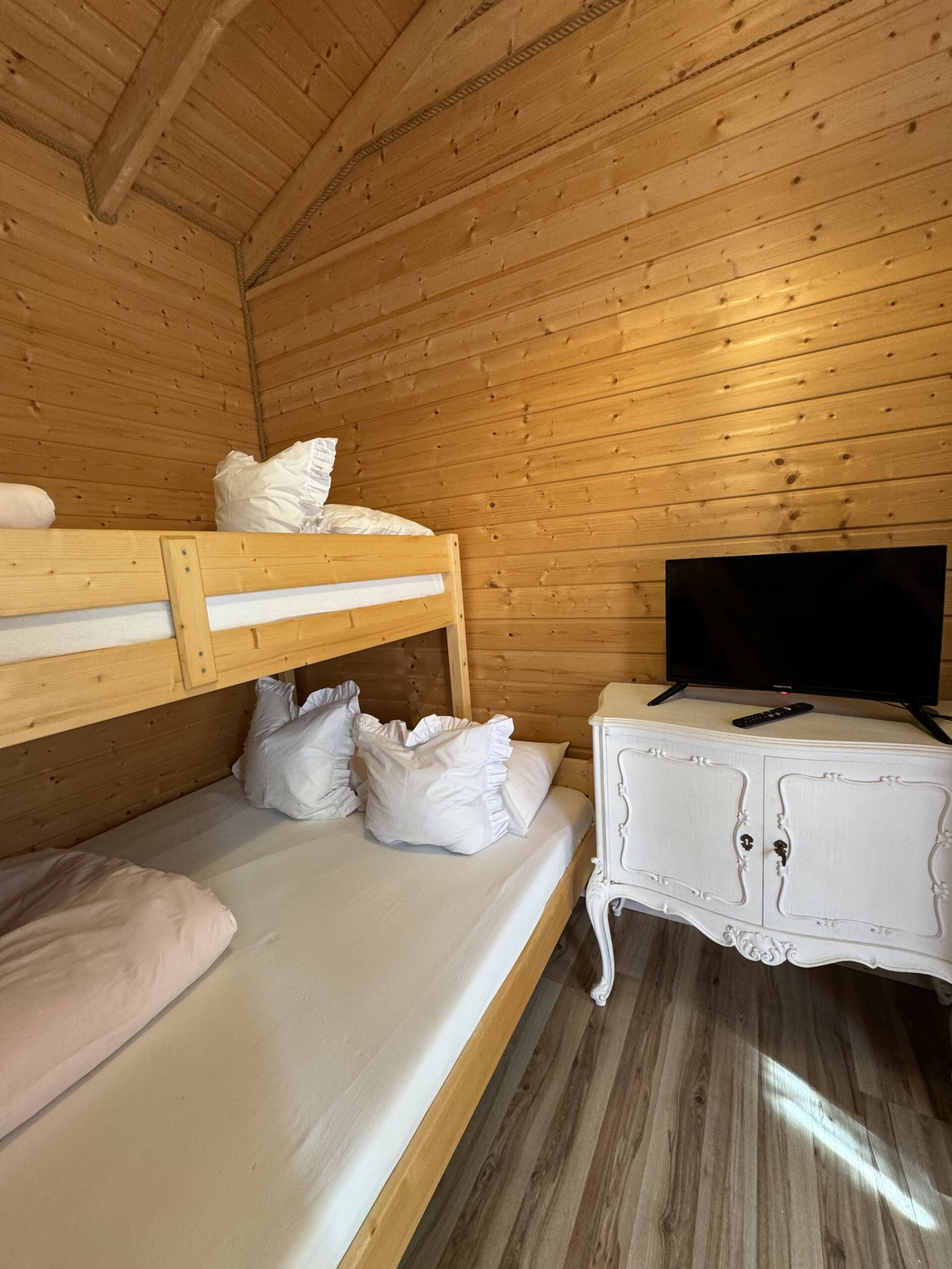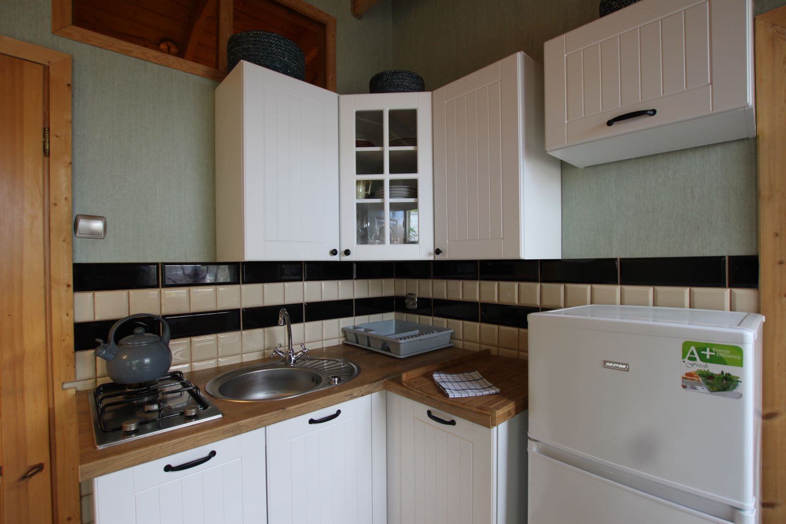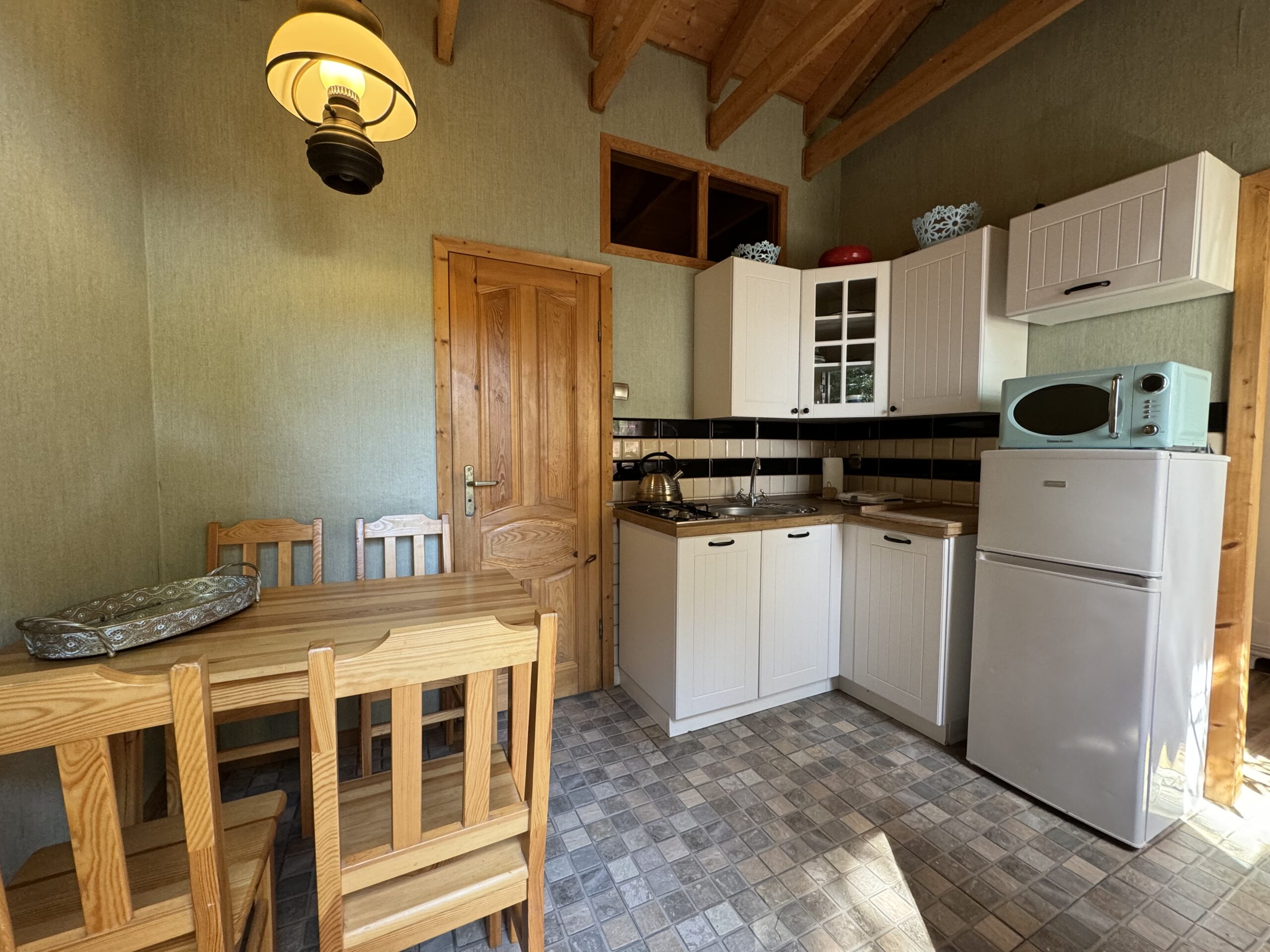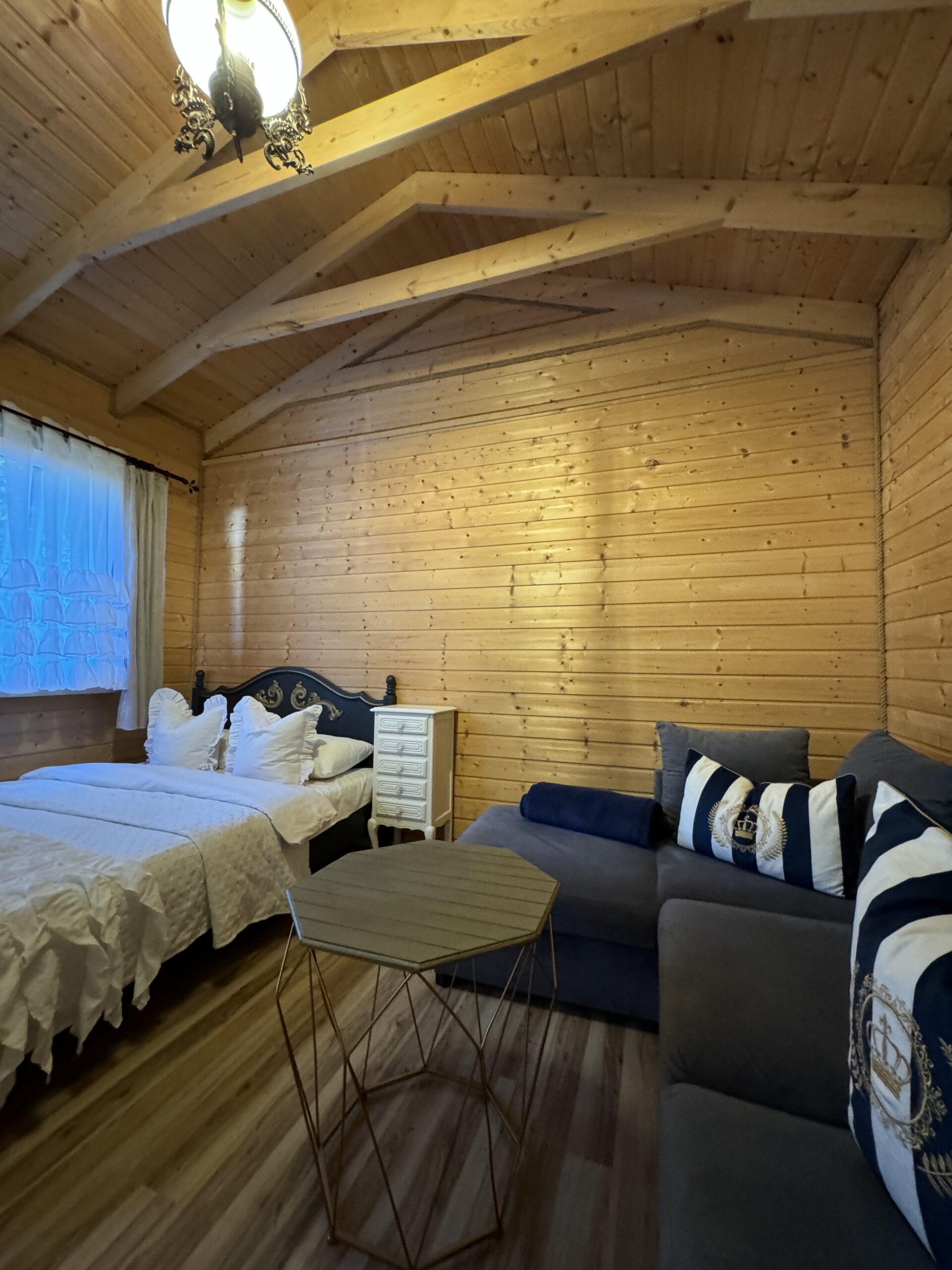 Dwie sypialnie: pierwsza 2-osobowa z możliwością spania dla dwóch dodatkowych osób (sofa narożna z funkcją spania), także możliwość dostawienia łóżeczka dziecięcego oraz drga 3-osobowa. Łazienka z prysznicem, WC. Kompletna kuchnia.