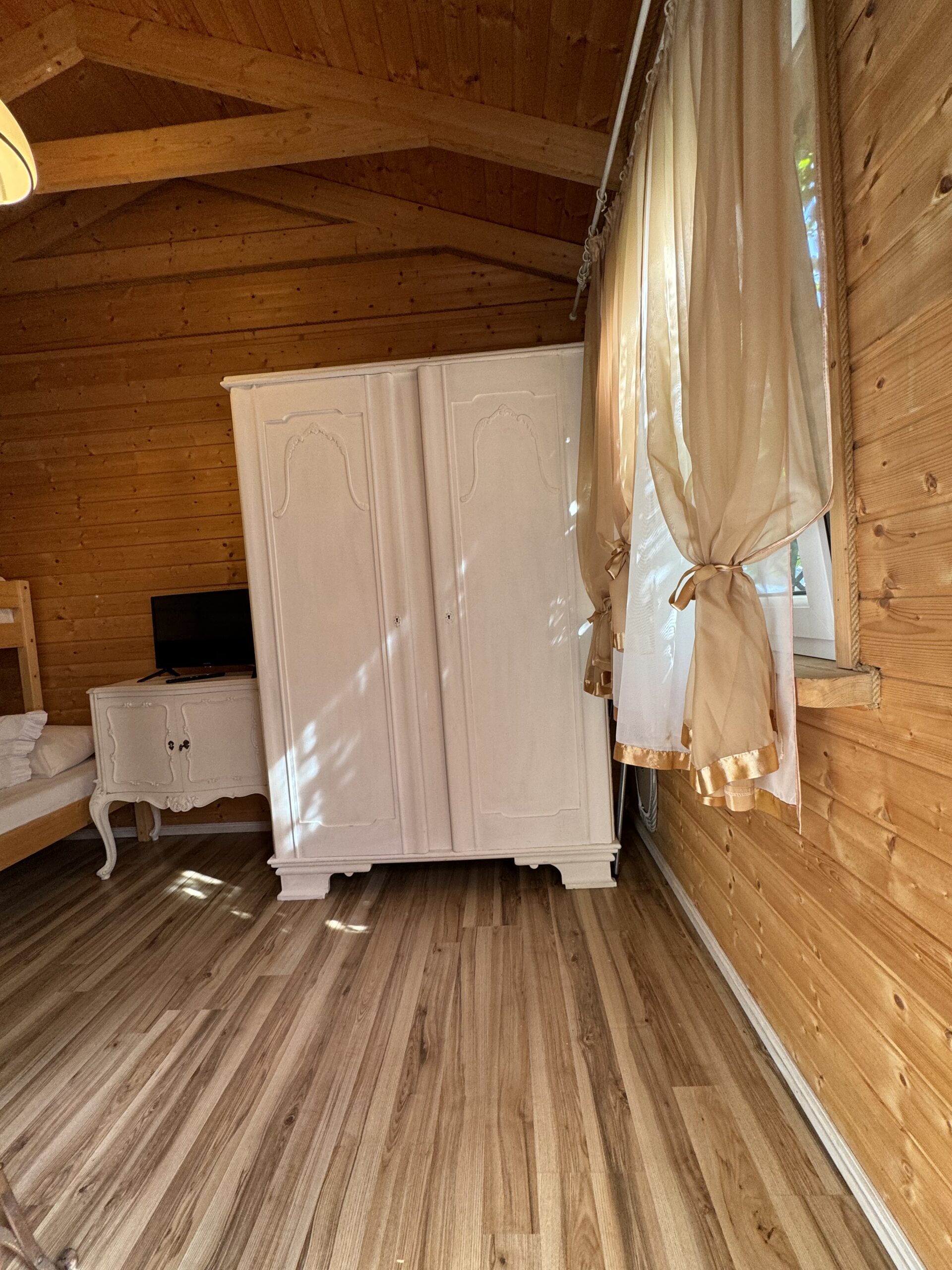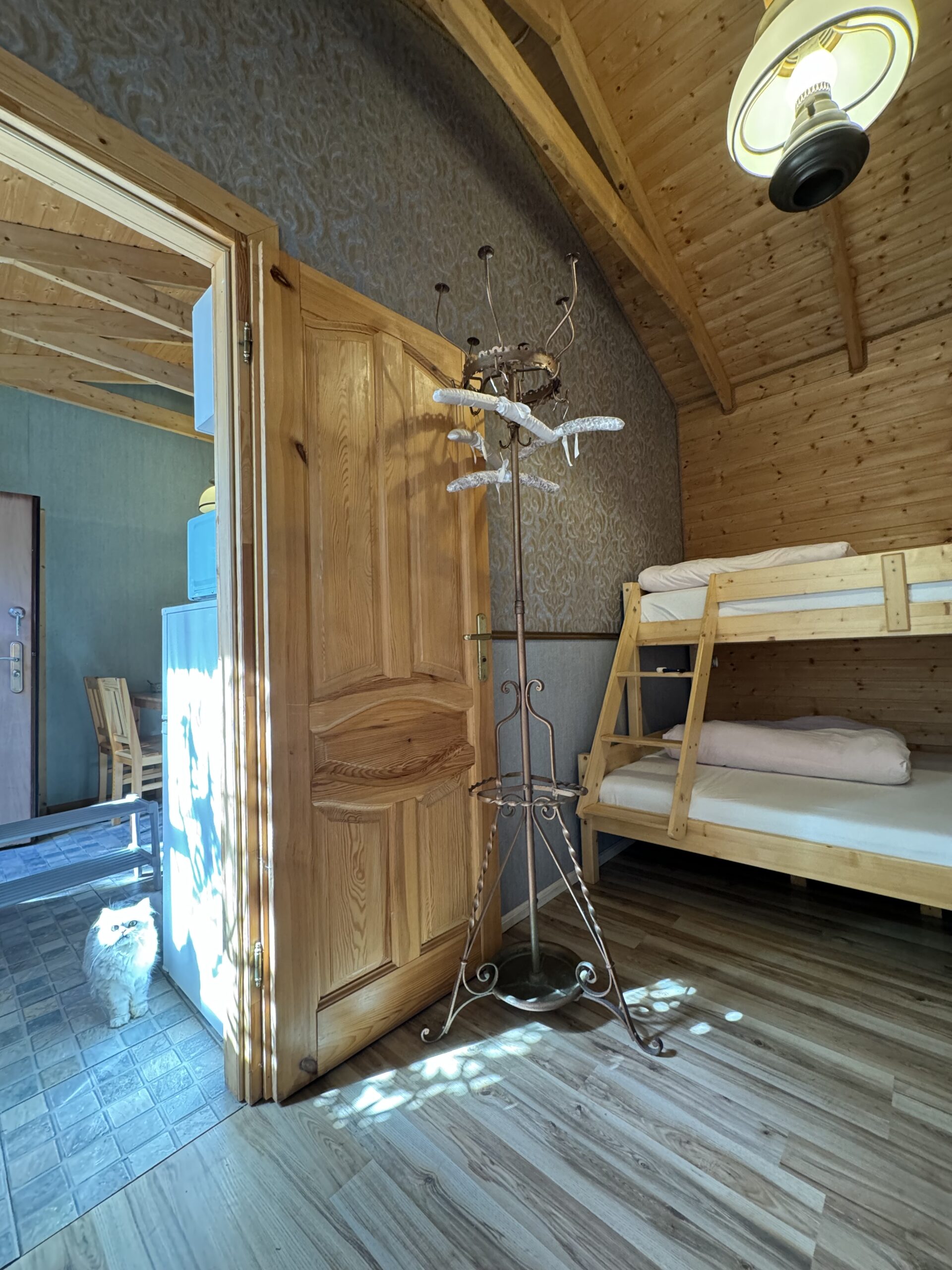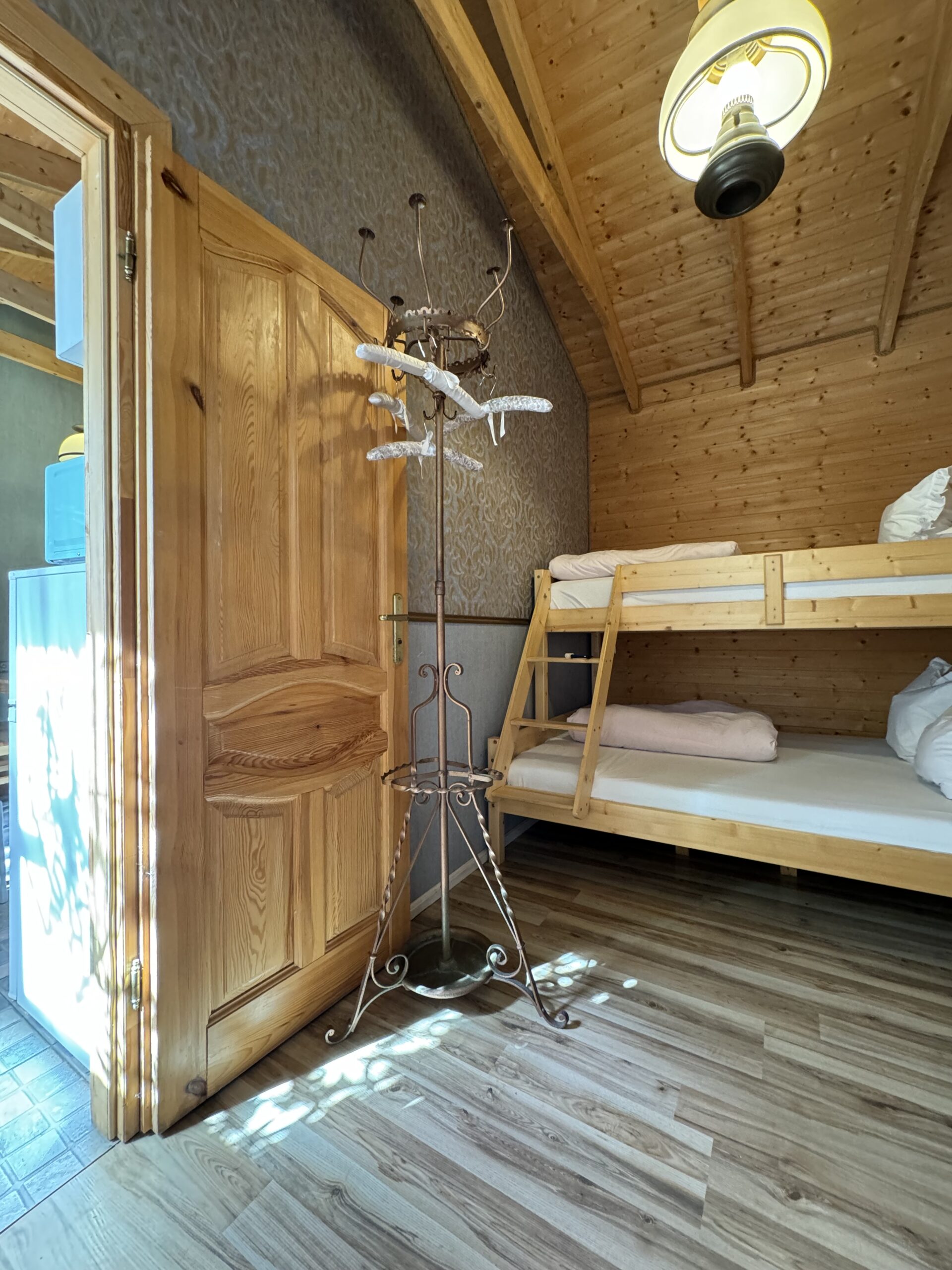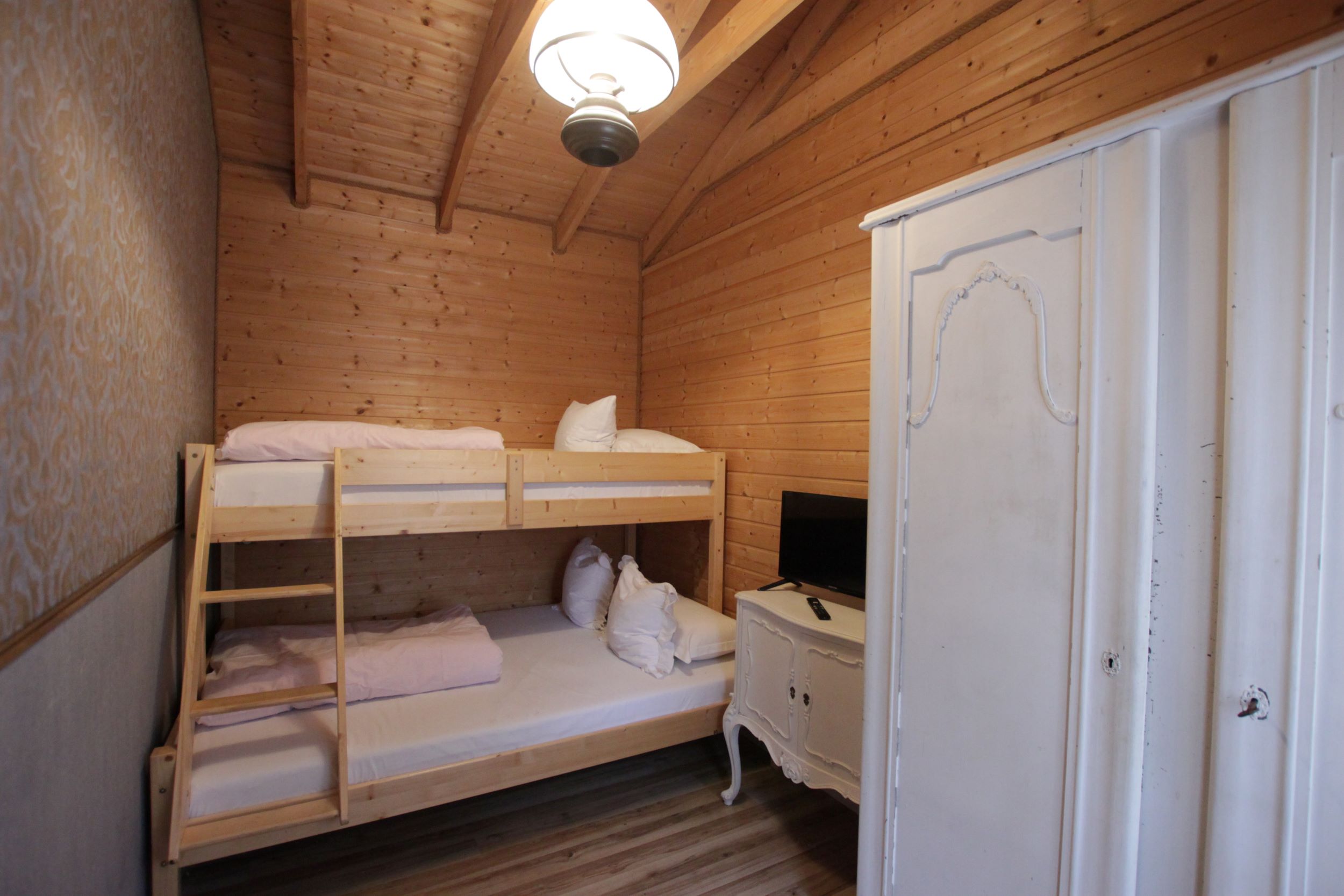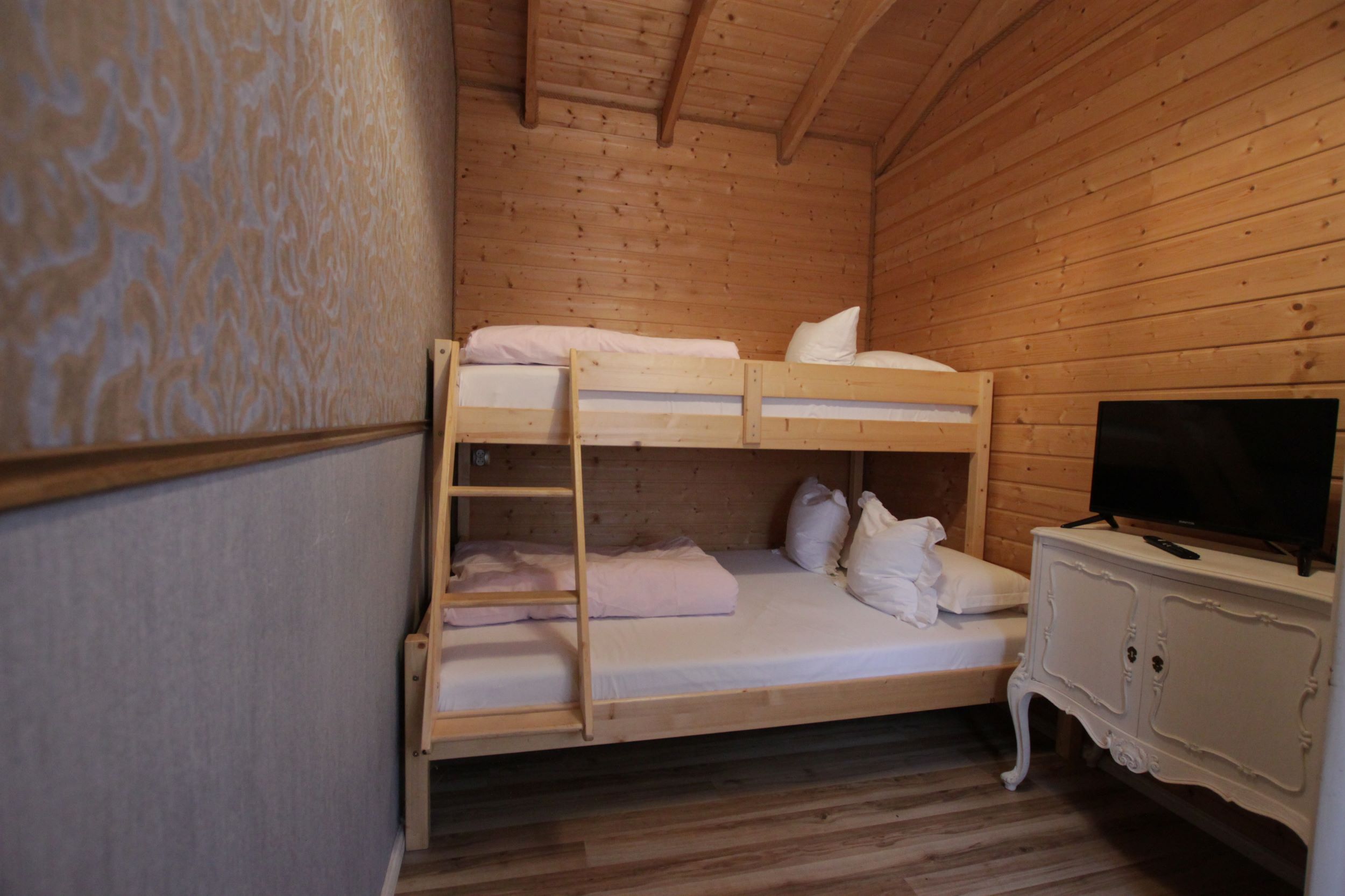 Dwie sypialnie: pierwsza 2-osobowa z możliwością spania dla dwóch dodatkowych osób (sofa narożna z funkcją spania), także możliwość dostawienia łóżeczka dziecięcego oraz drga 3-osobowa. Łazienka z prysznicem, WC. Kompletna kuchnia.