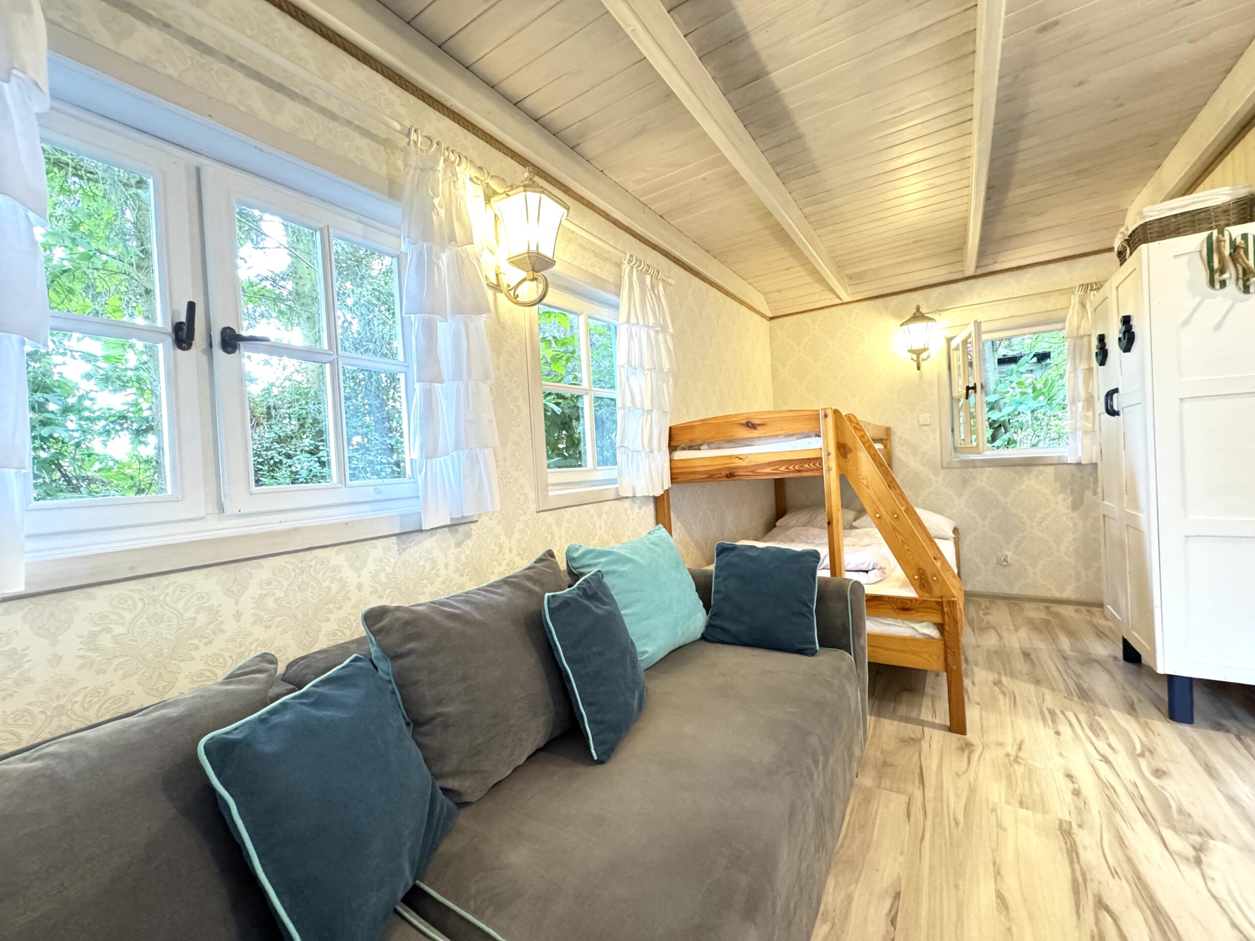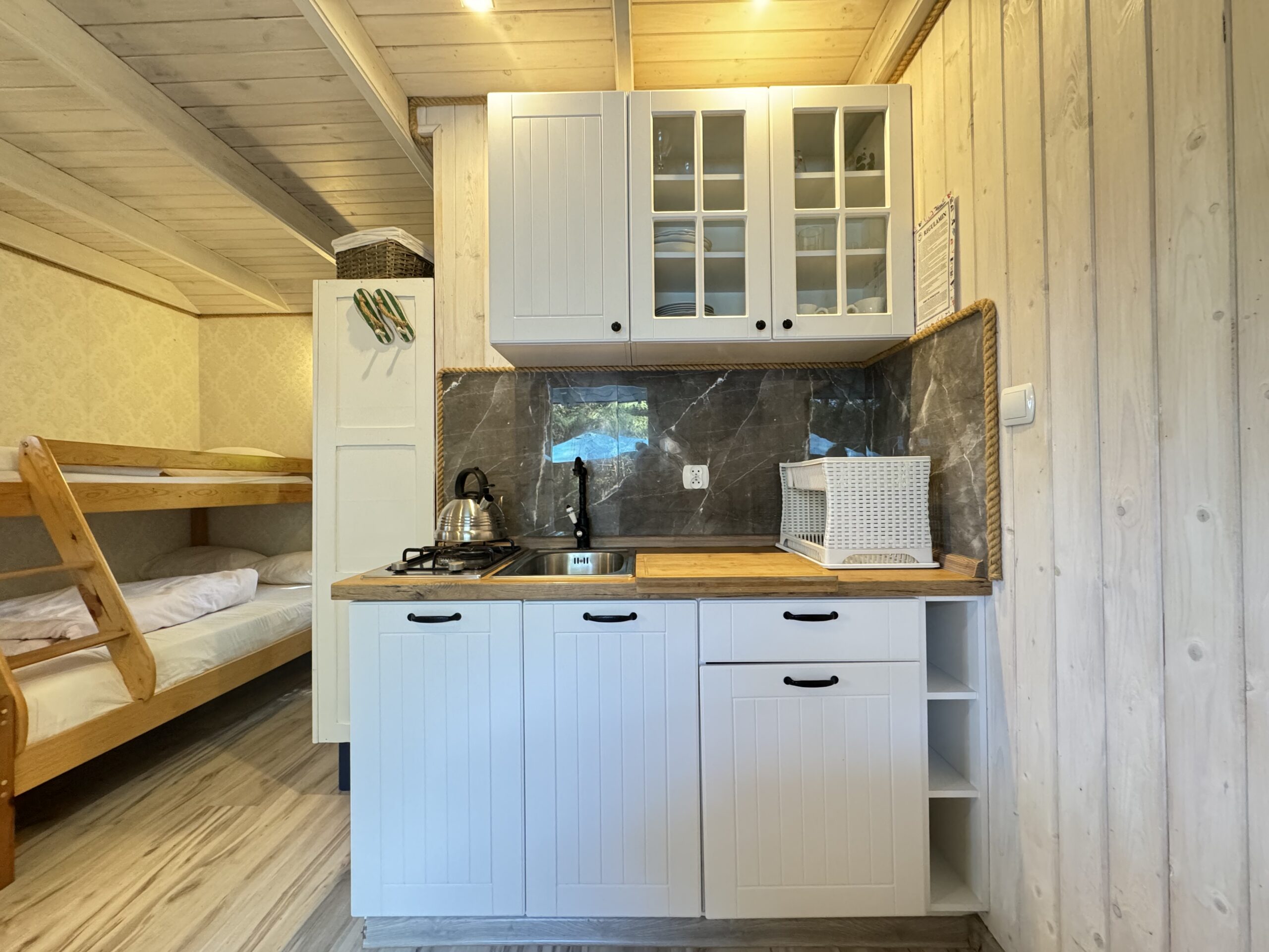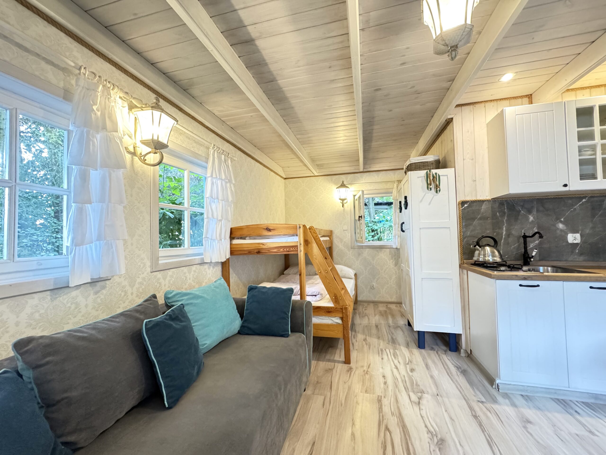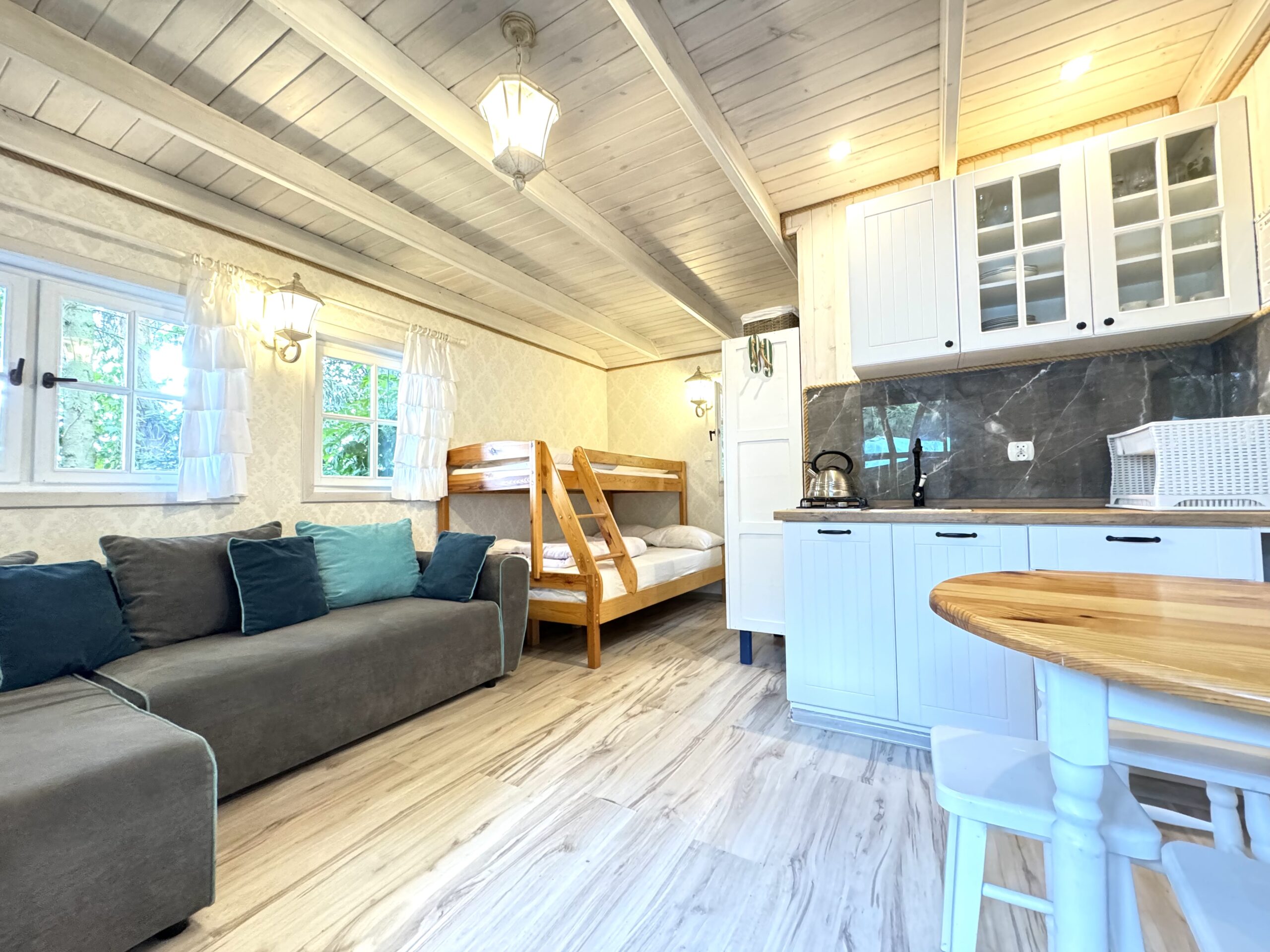 Dla każdej rodziny mieszkanko typu studio o pow. 23 m2 wyposażone w łóżko piętrowe 3-osobowe (dolna część jest 2-osobowa) także w kanapę narożną z funkcją spania dla kolejnych 2 osób.