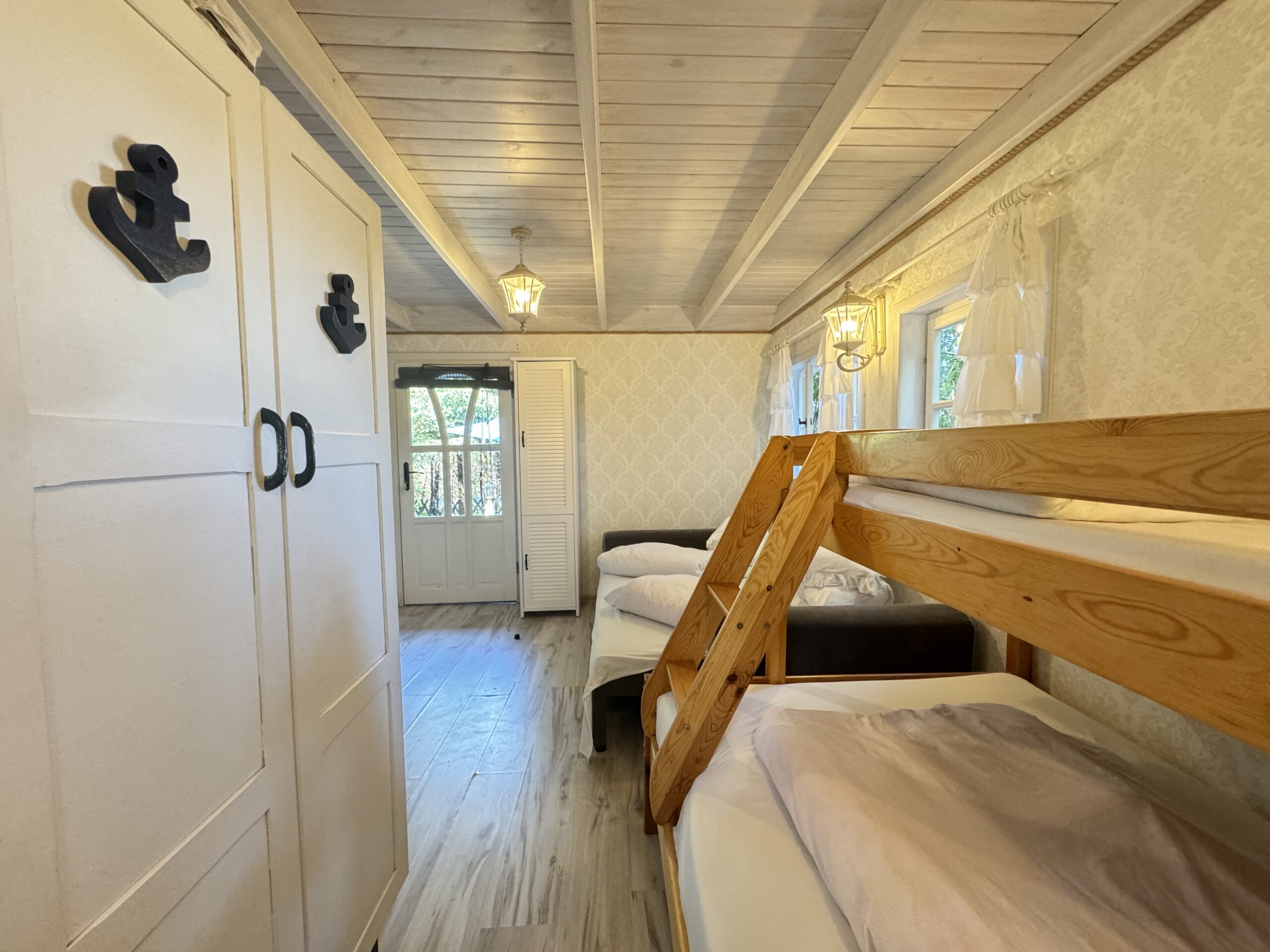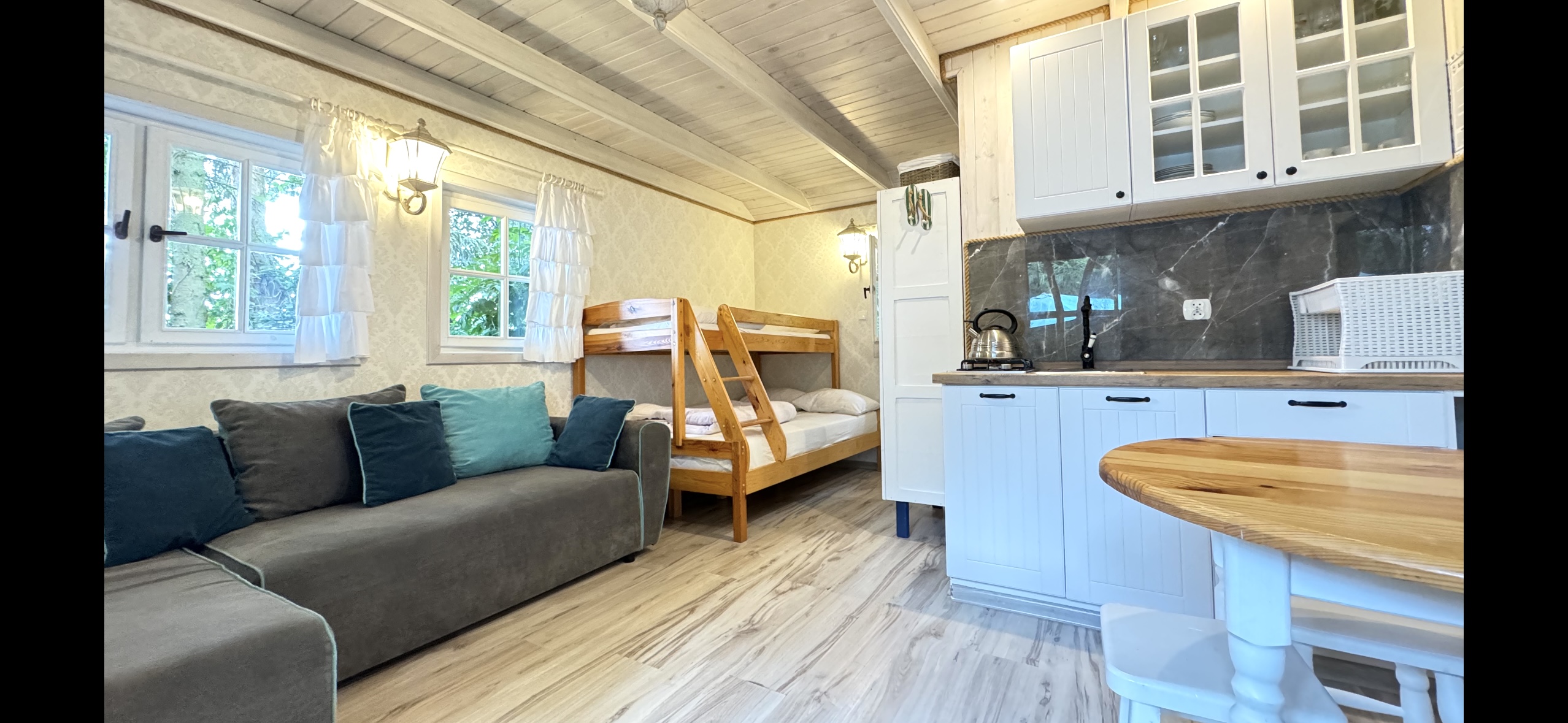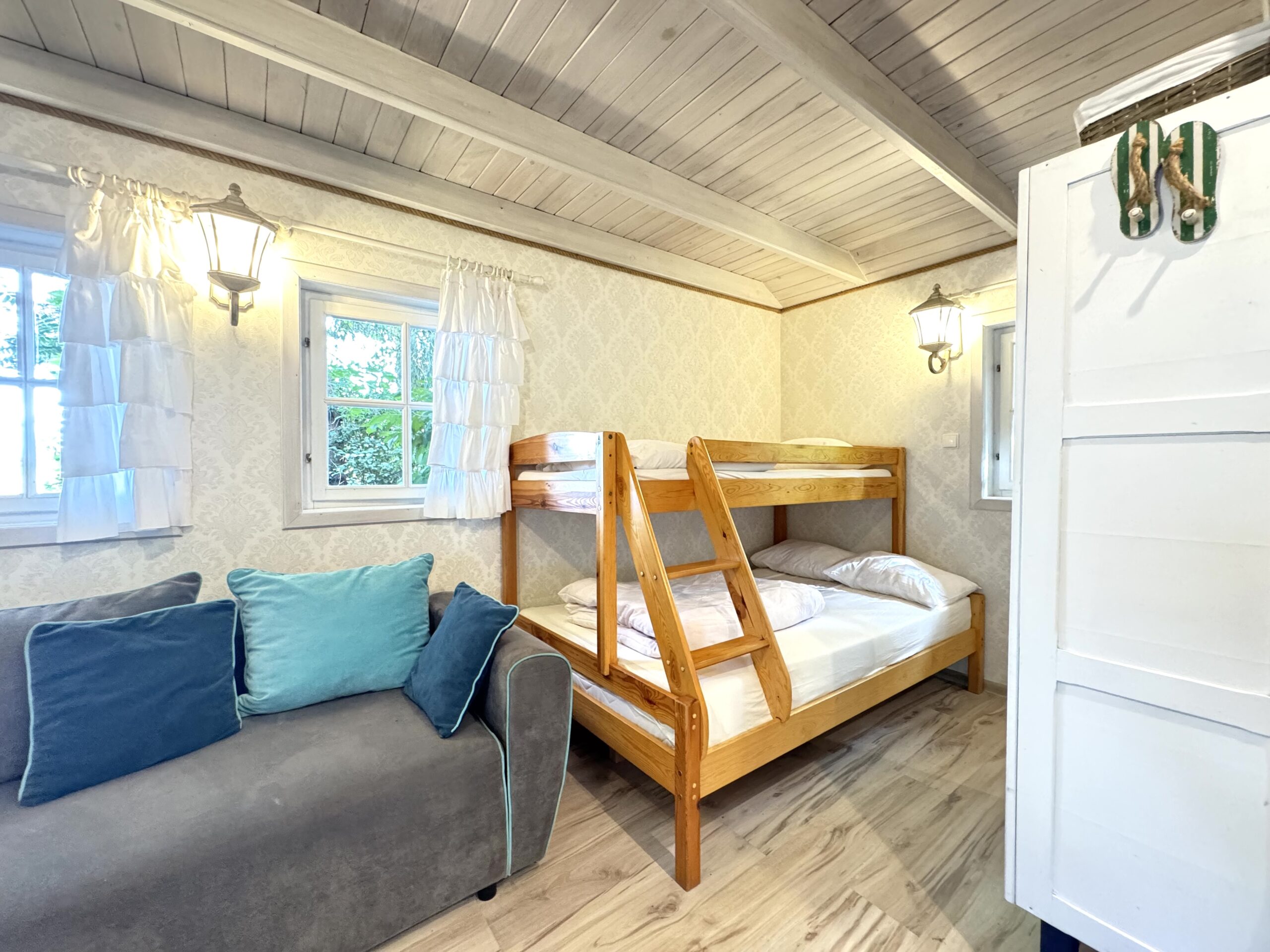 Dla każdej rodziny mieszkanko typu studio o pow. 23 m2 wyposażone w łóżko piętrowe 3-osobowe (dolna część jest 2-osobowa) także w kanapę narożną z funkcją spania dla kolejnych 2 osób.