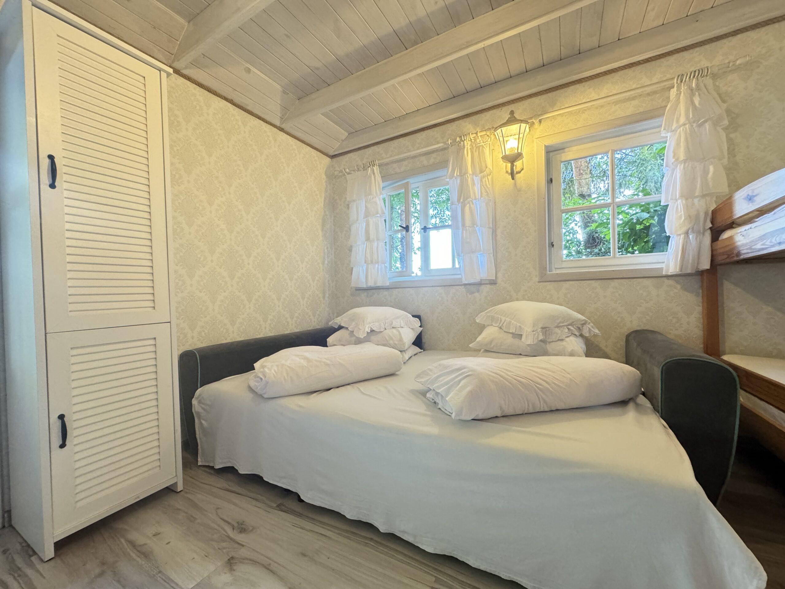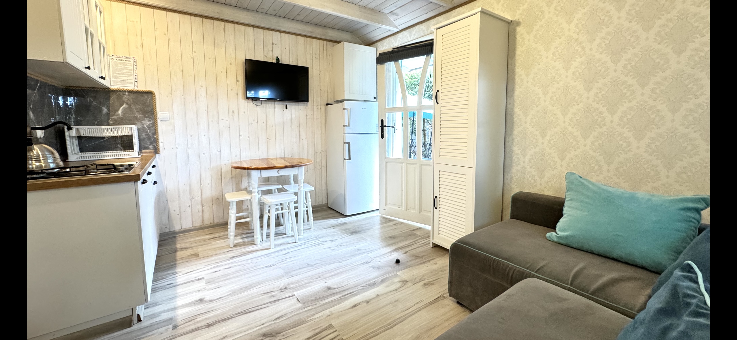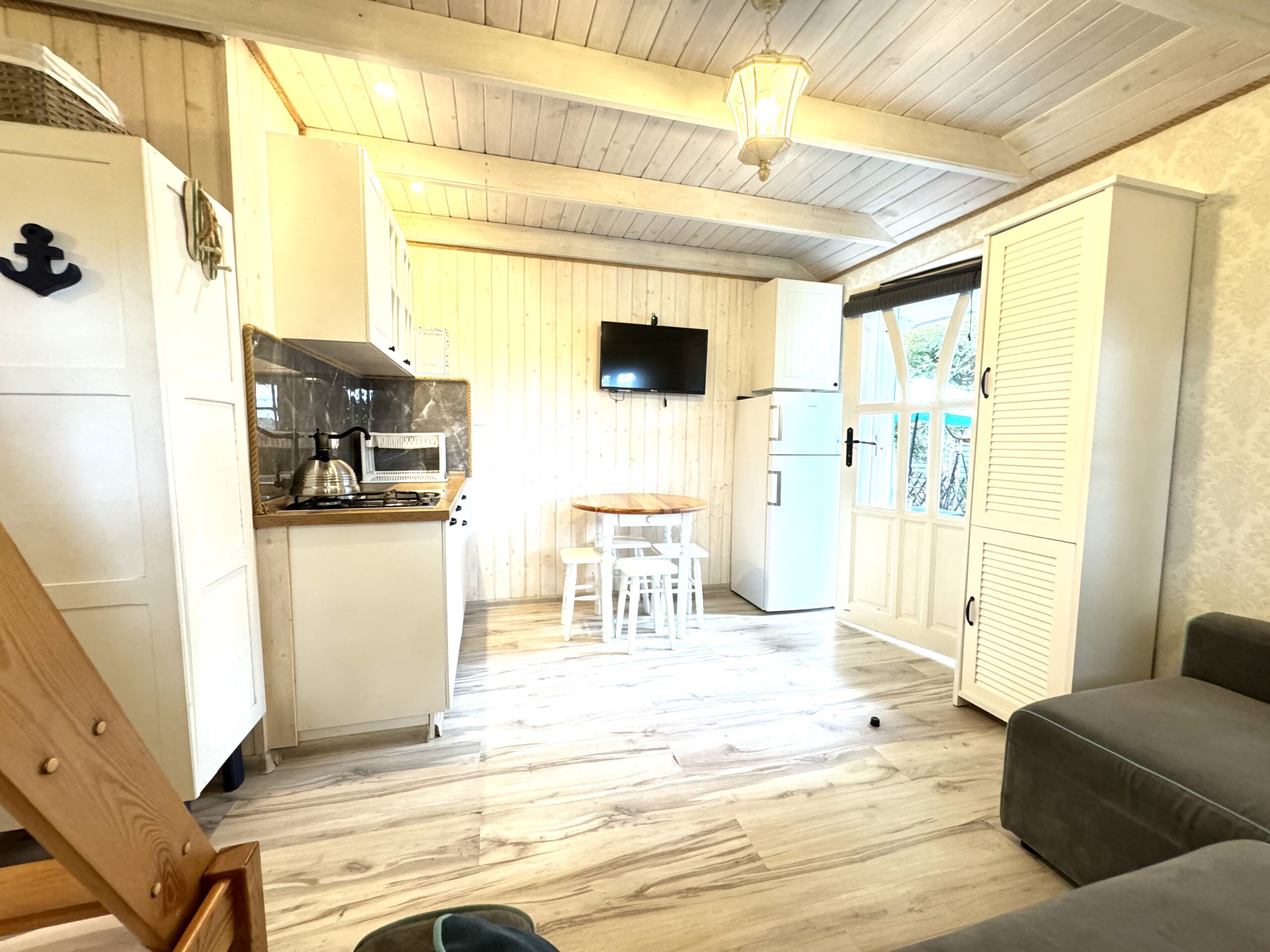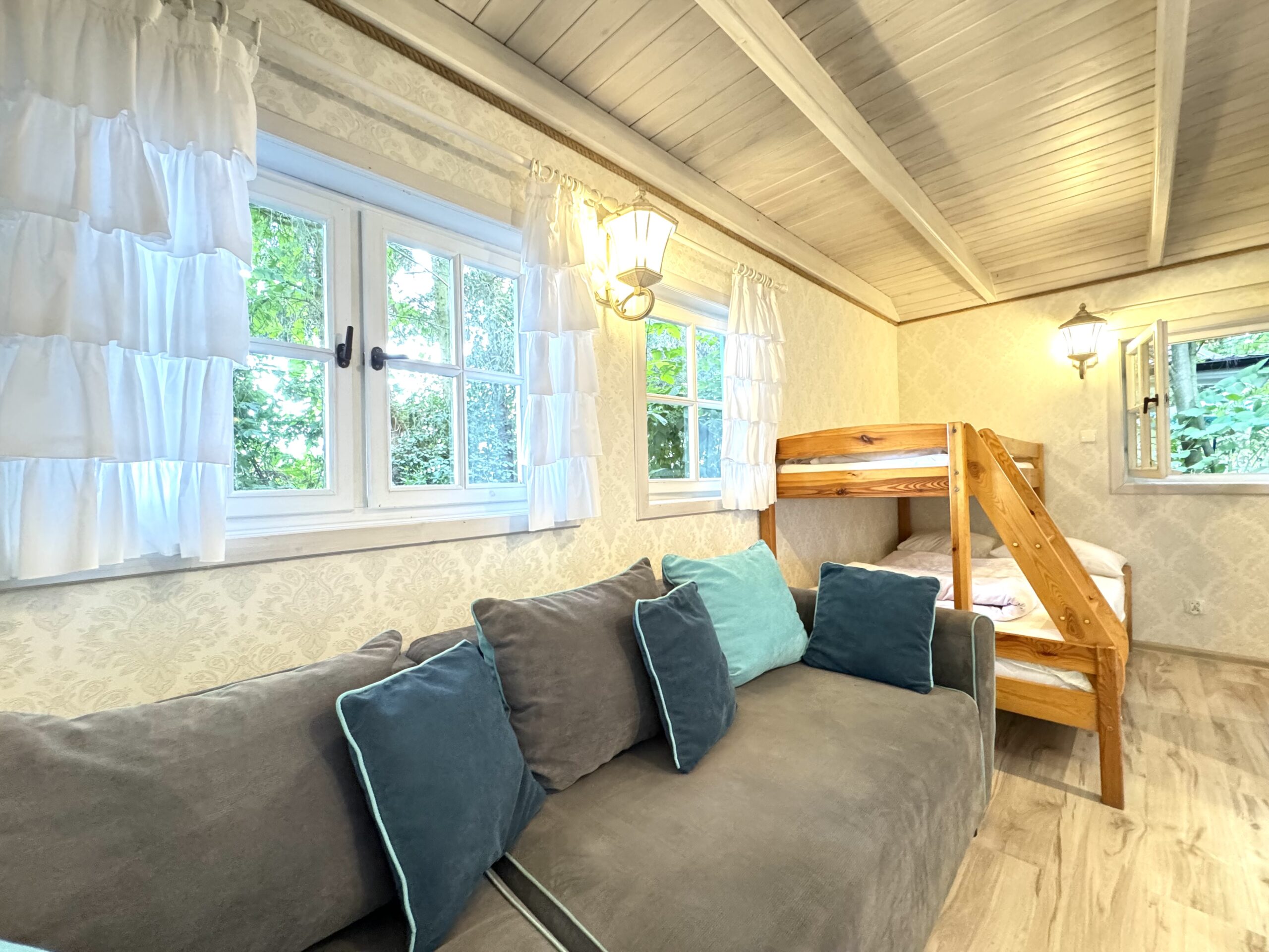 Dla każdej rodziny mieszkanko typu studio o pow. 23 m2 wyposażone w łóżko piętrowe 3-osobowe (dolna część jest 2-osobowa) także w kanapę narożną z funkcją spania dla kolejnych 2 osób.