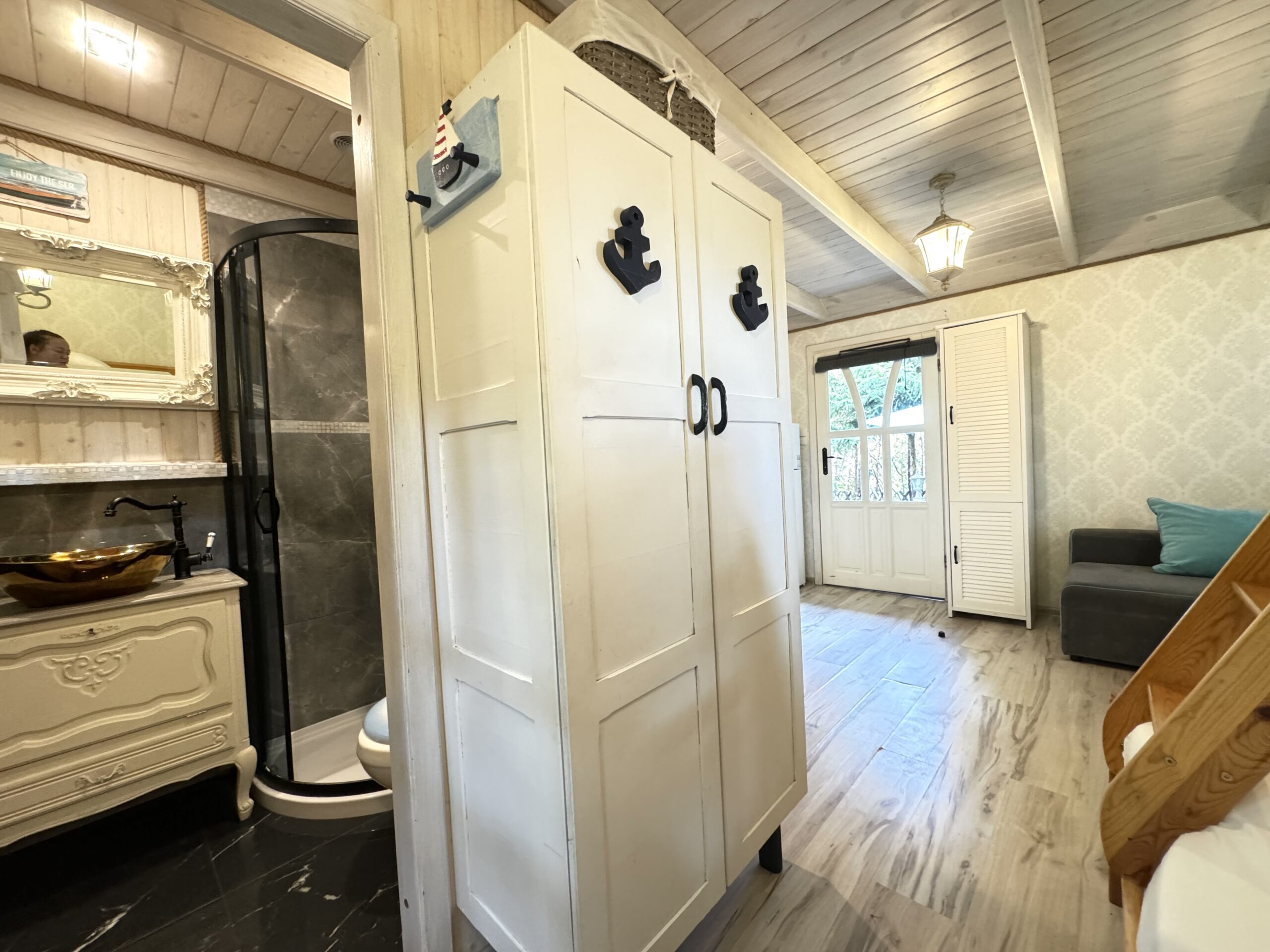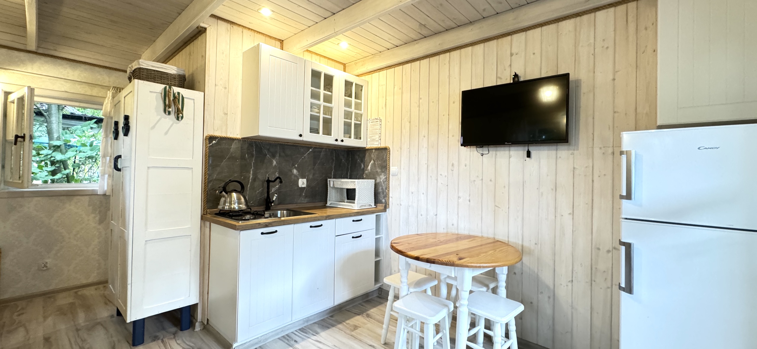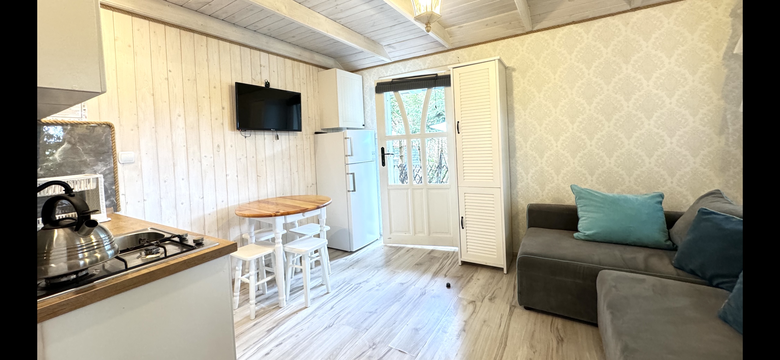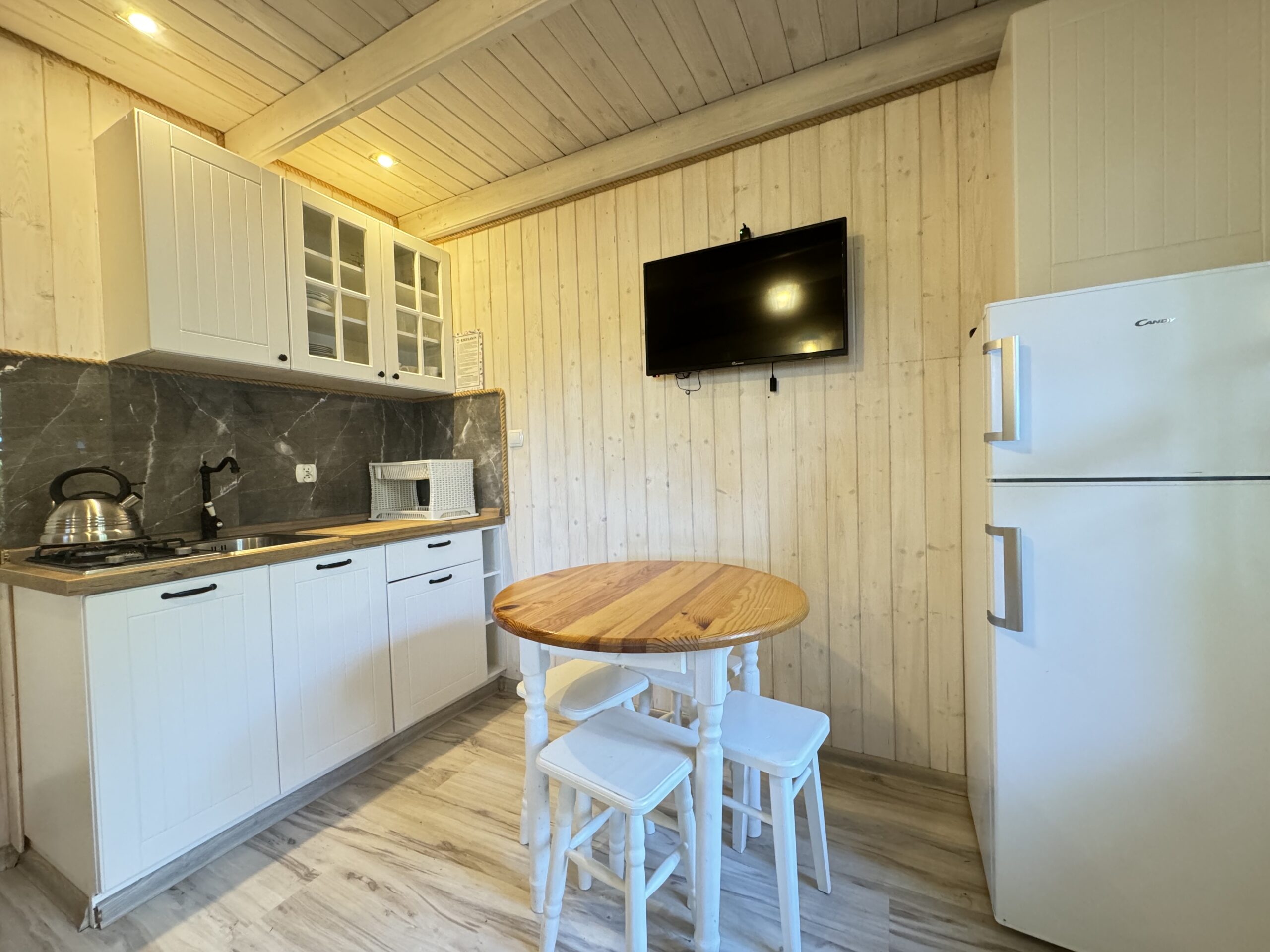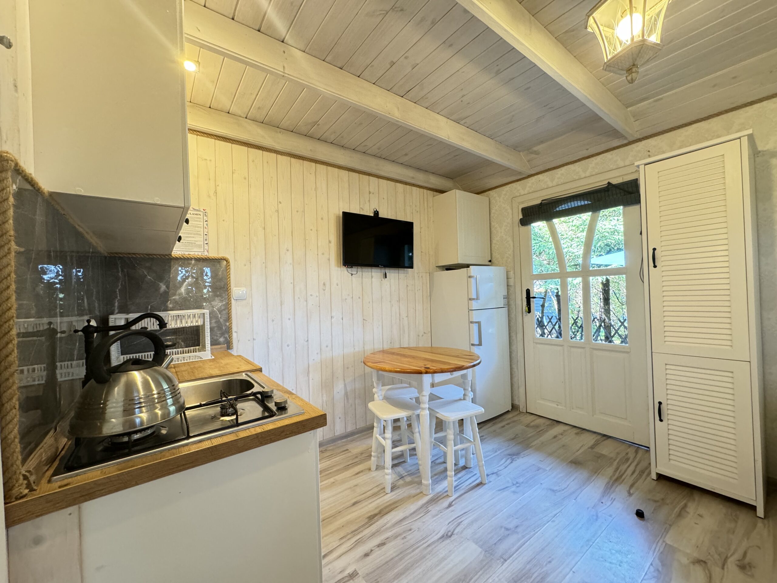 Do każdej części domku oddzielne wejście, w środku każdej części kompletnie wyposażony aneks kuchenny oraz łazienka z prysznicem, WC.