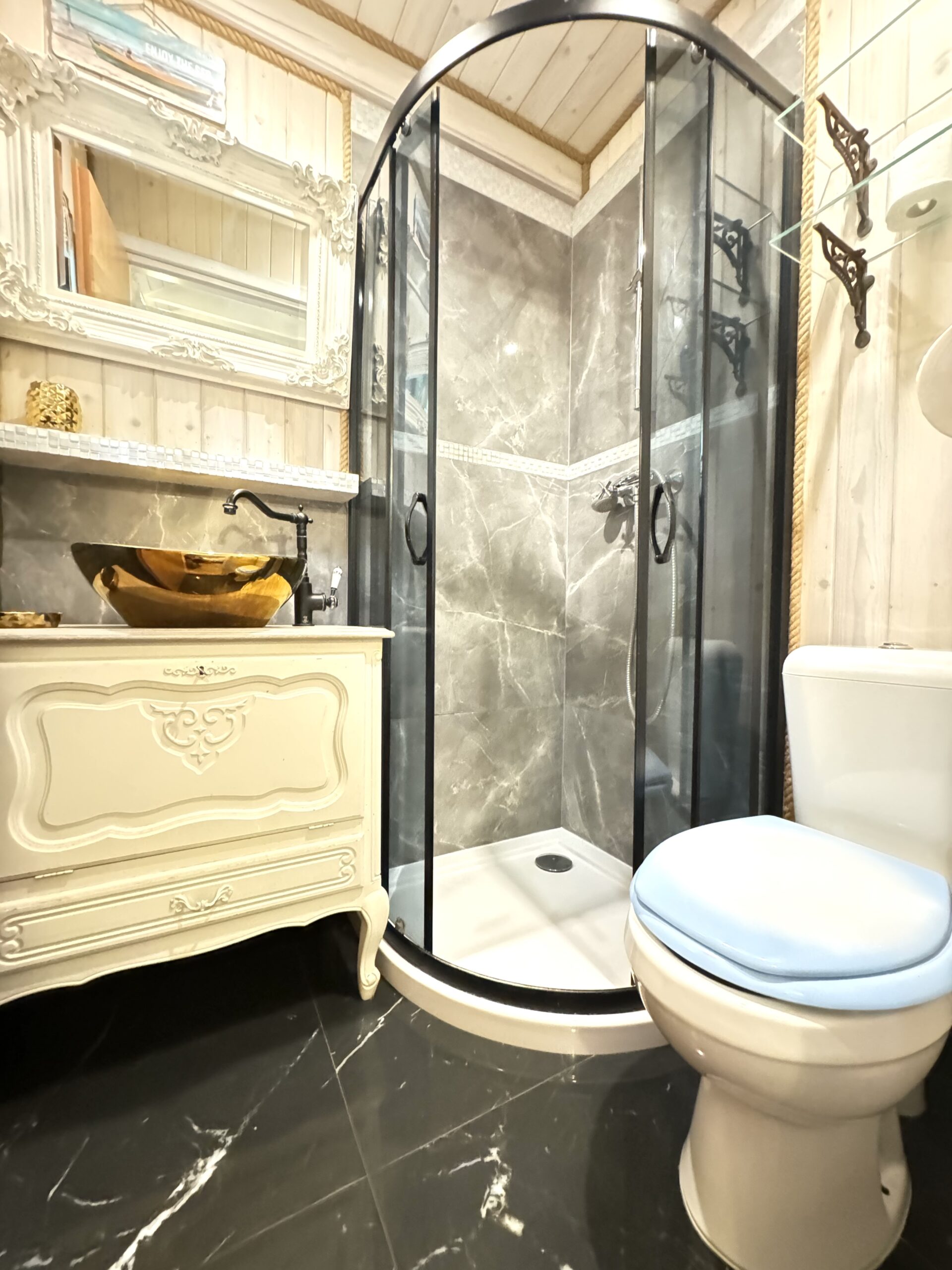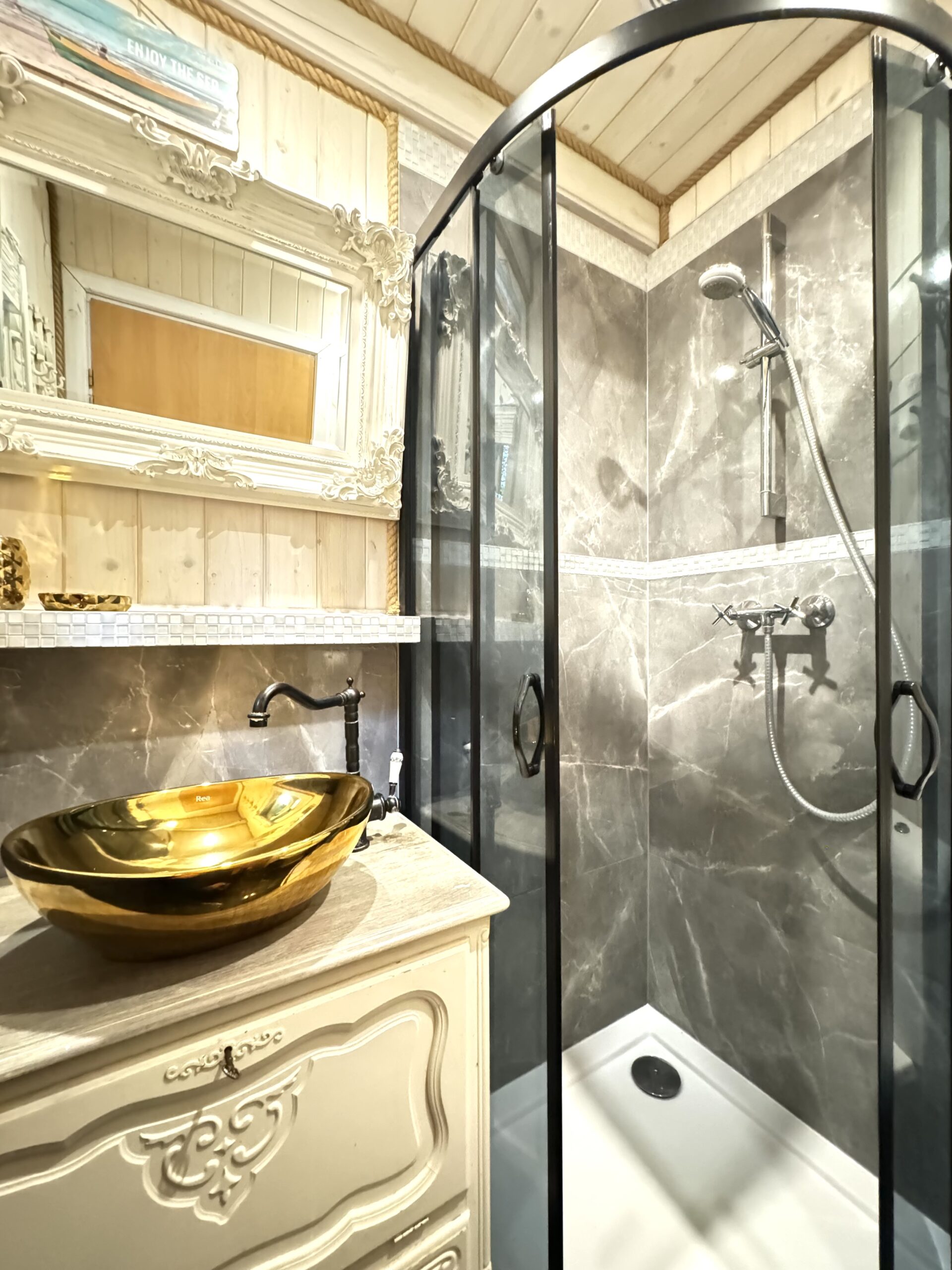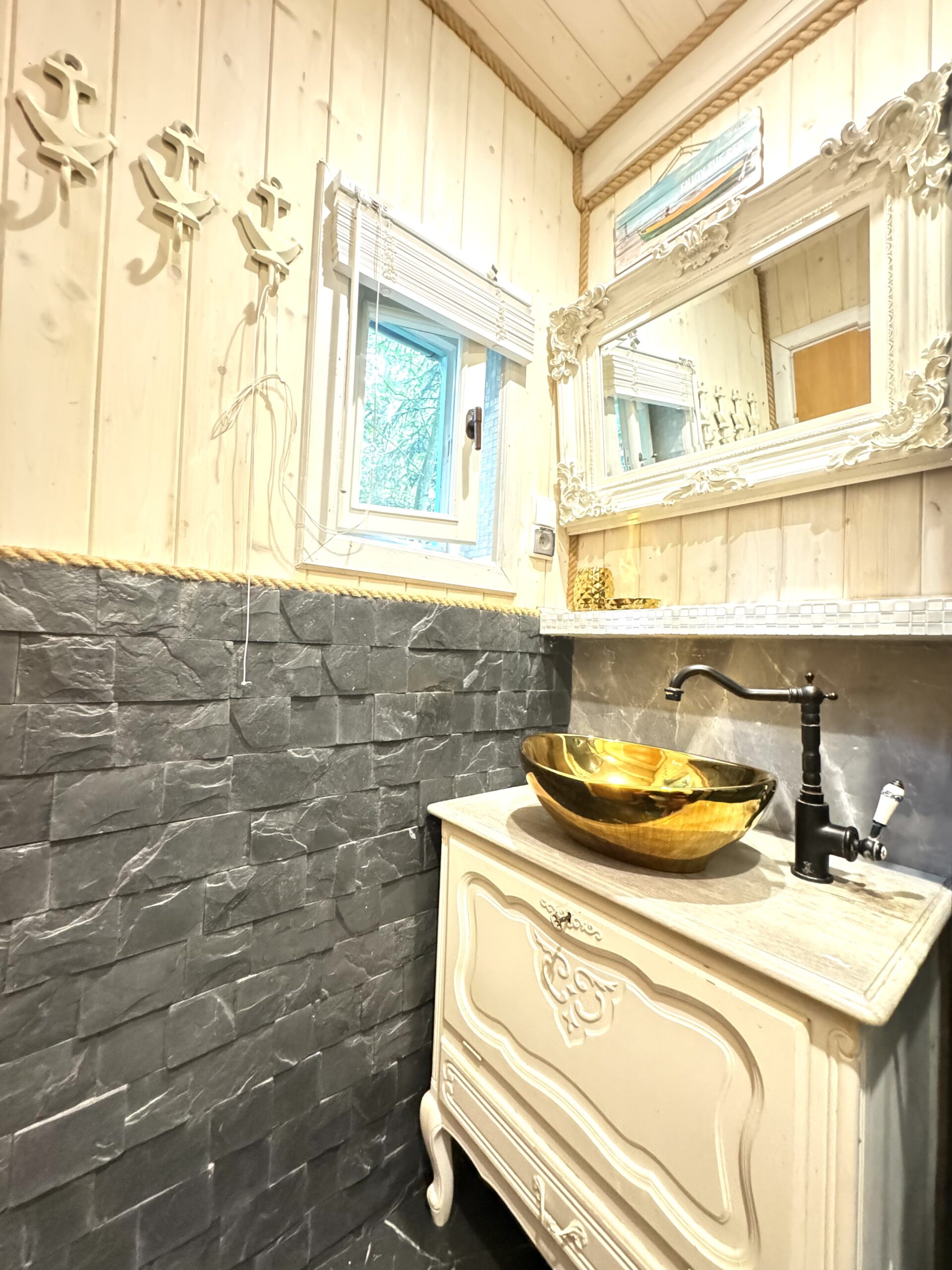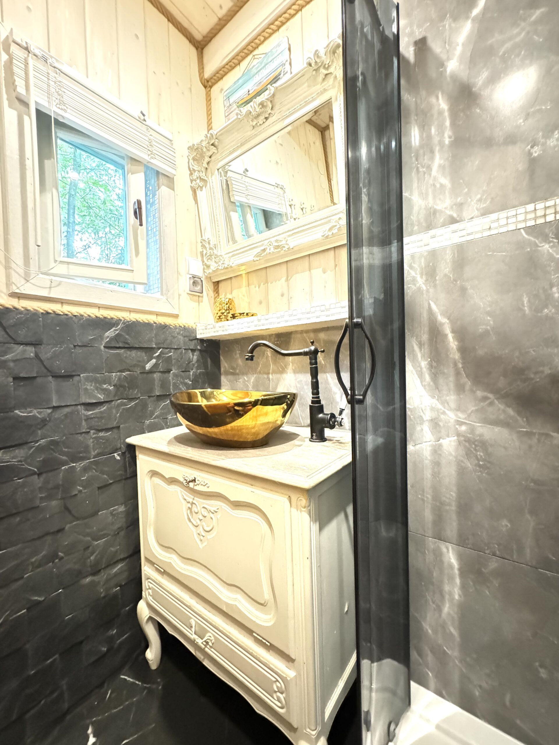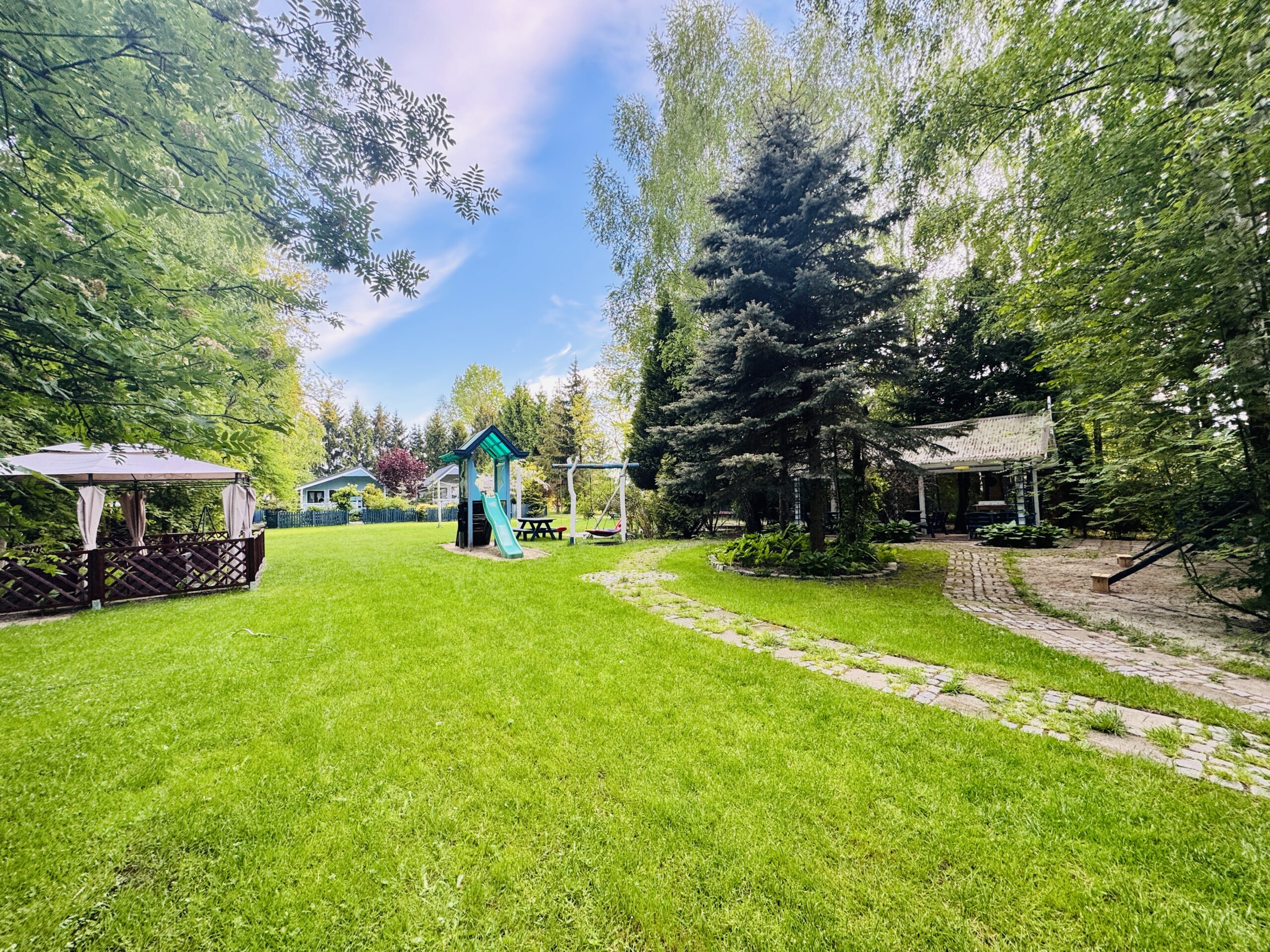 Do każdej części domku oddzielne wejście, w środku każdej części kompletnie wyposażony aneks kuchenny oraz łazienka z prysznicem, WC.
