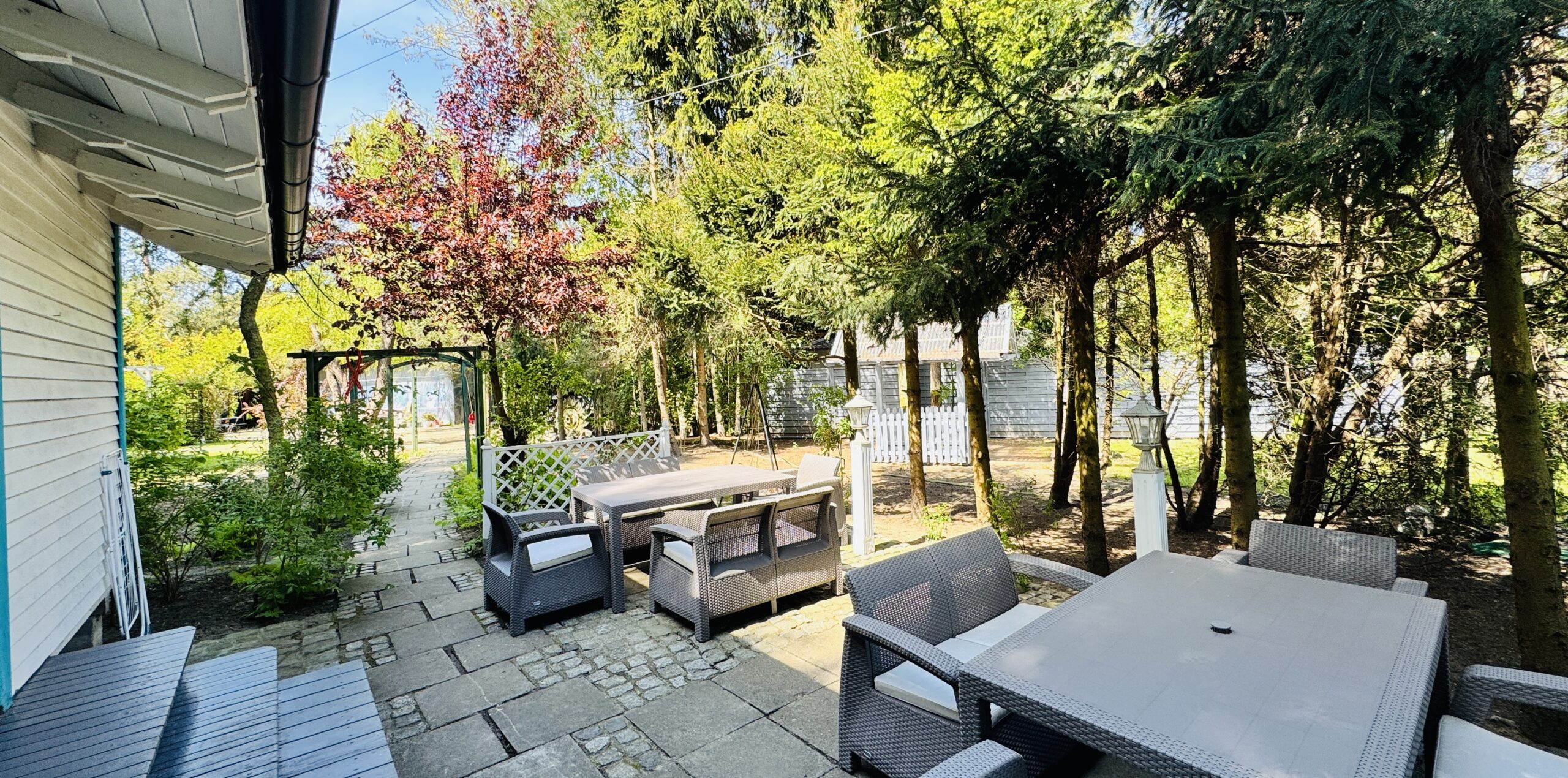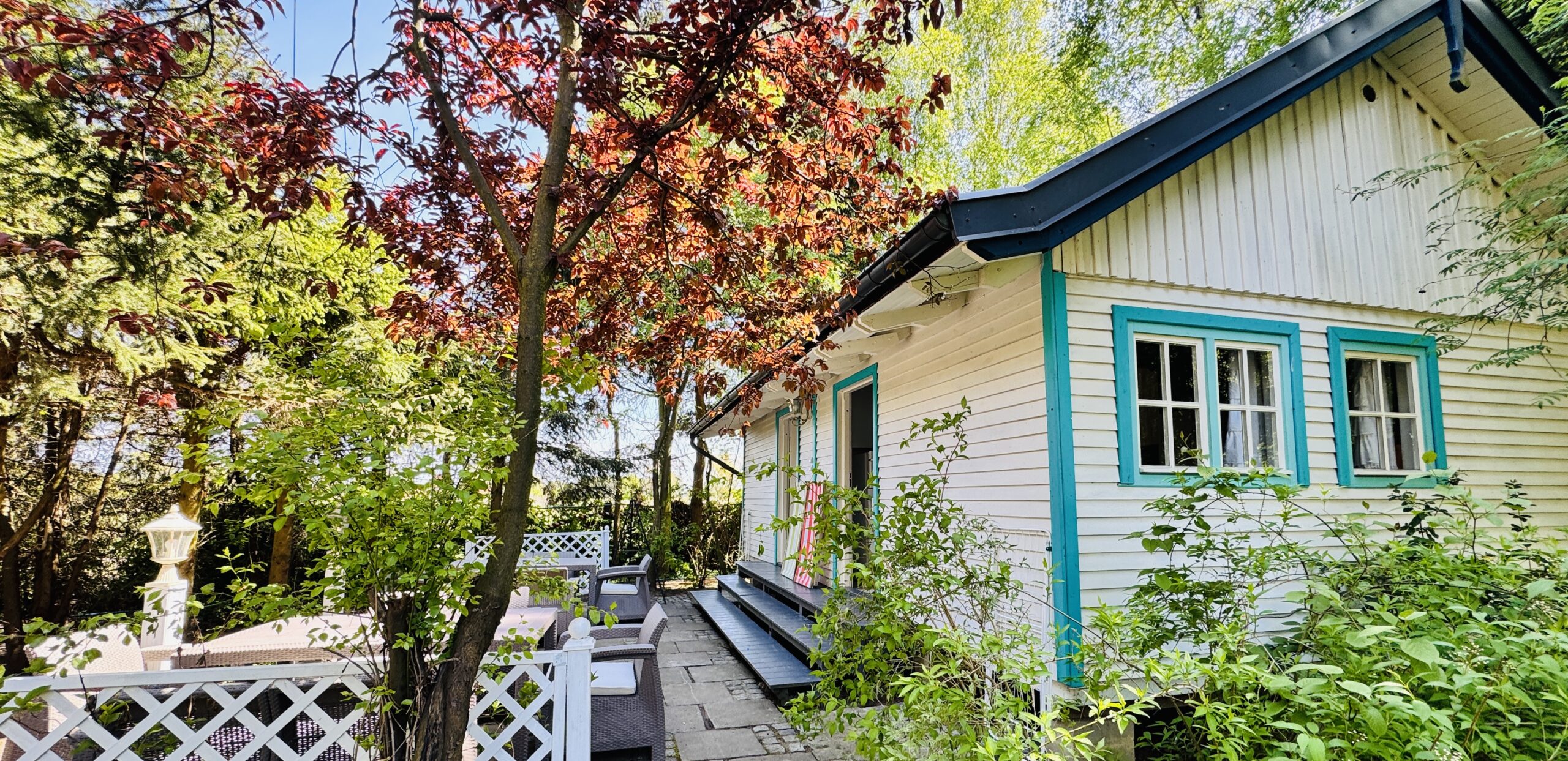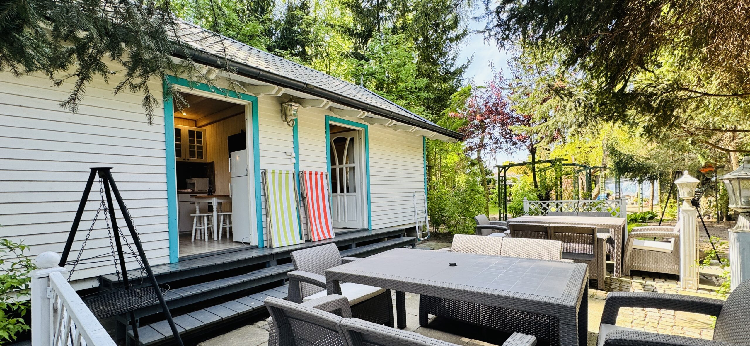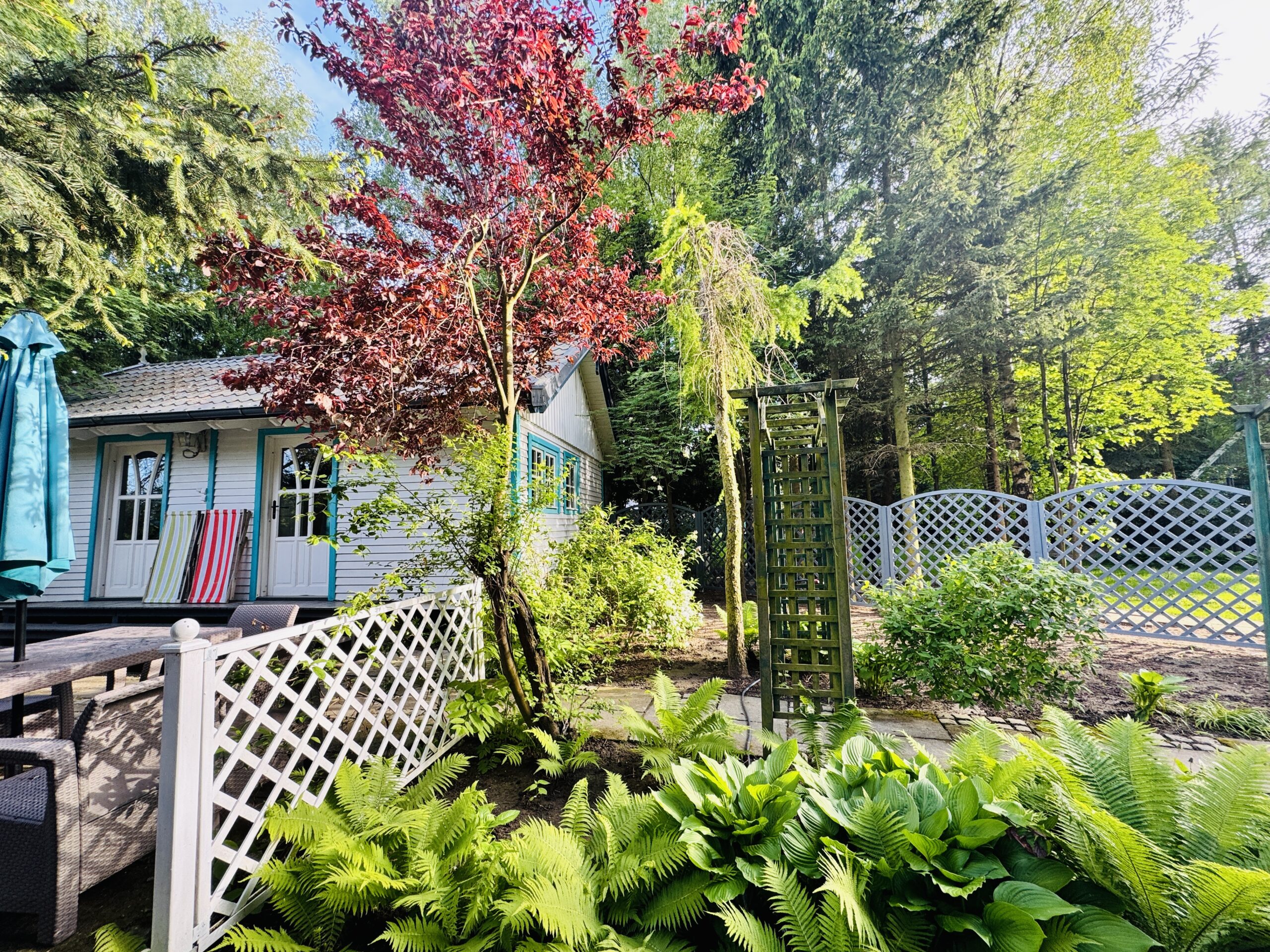 Dla każdej części domku do dyspozycji gości własny stół z parasolem w ogrodzie oraz miejsce do grillowania. Ukryty od pozostałej części ogrodu przez oddzielenie zielenią.