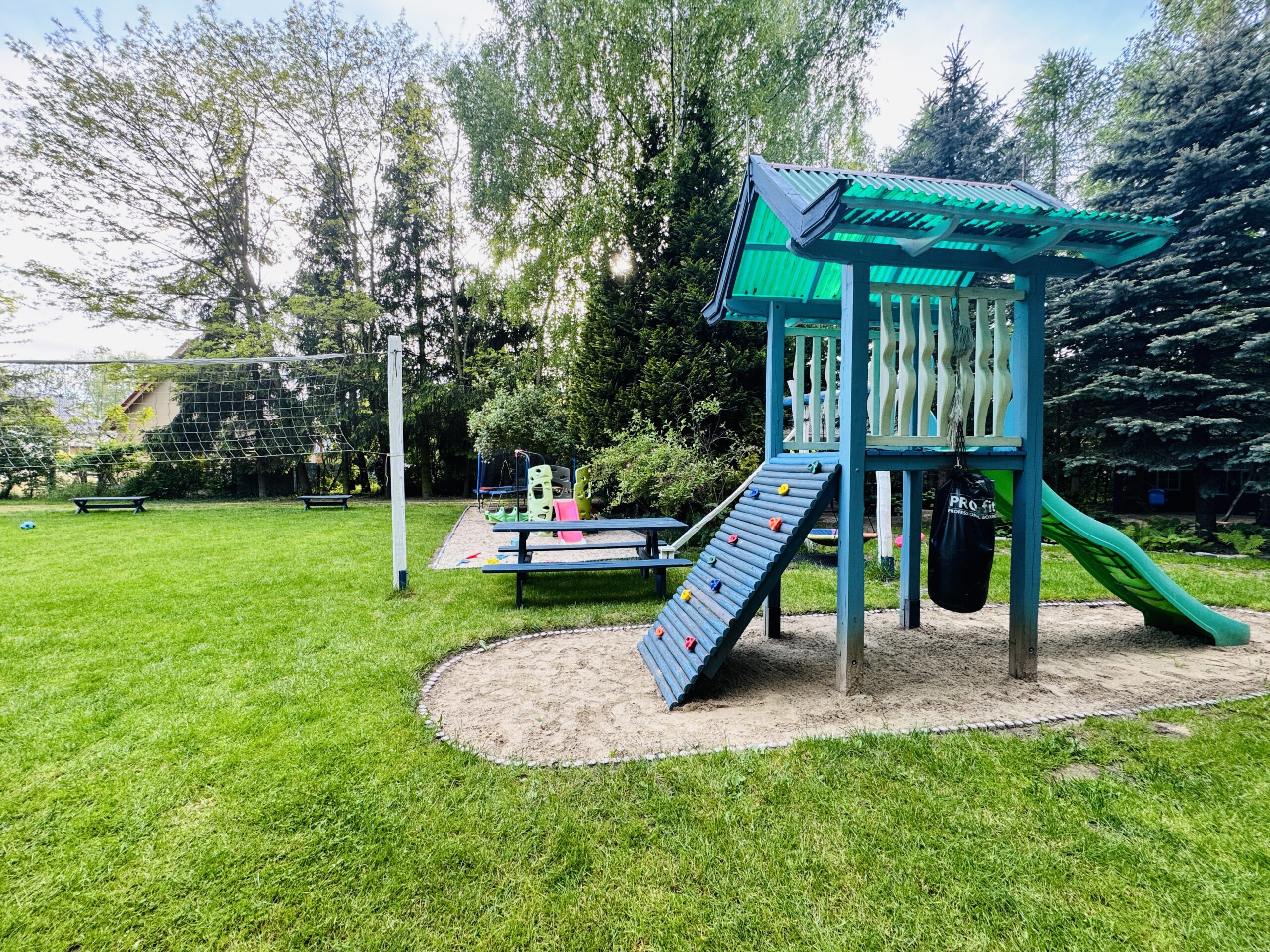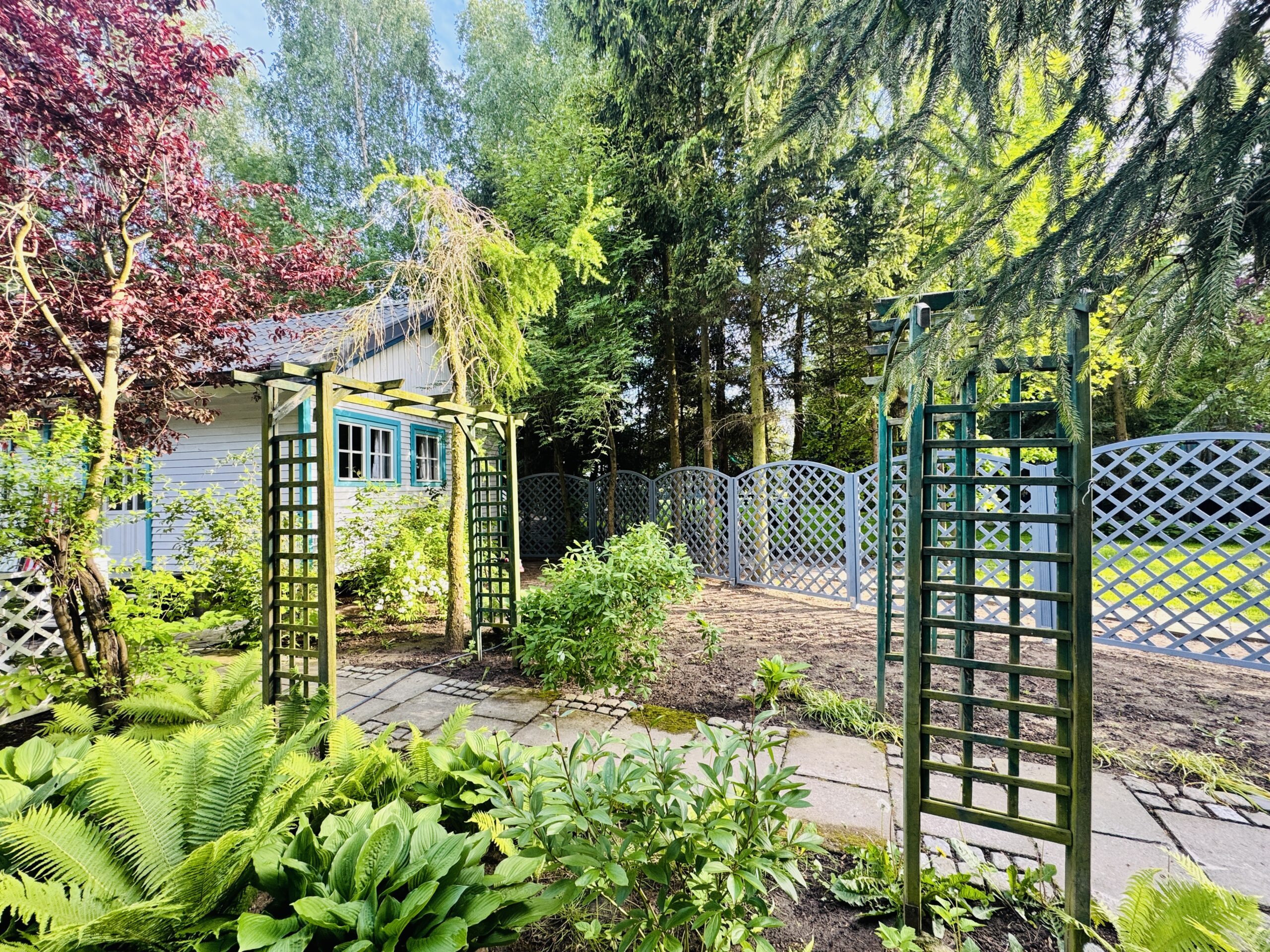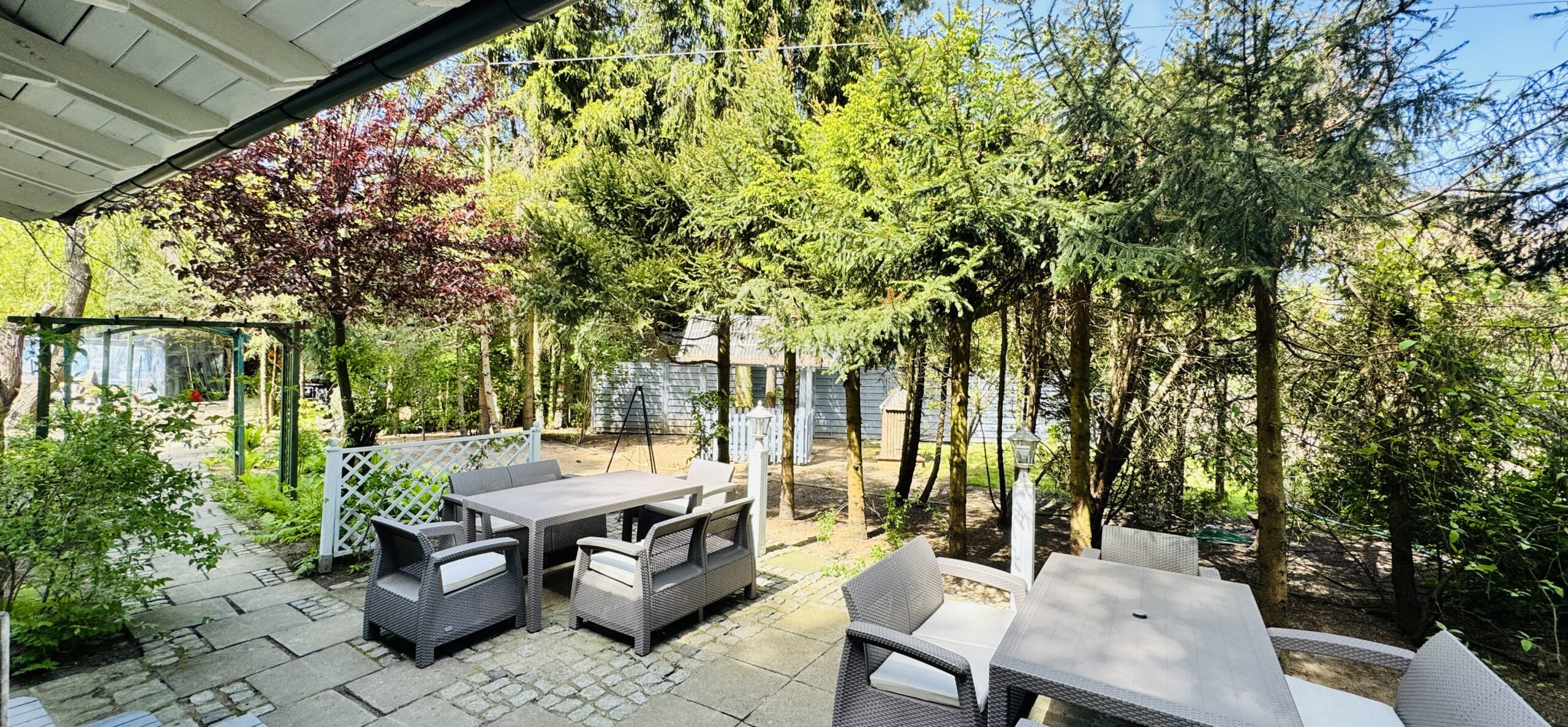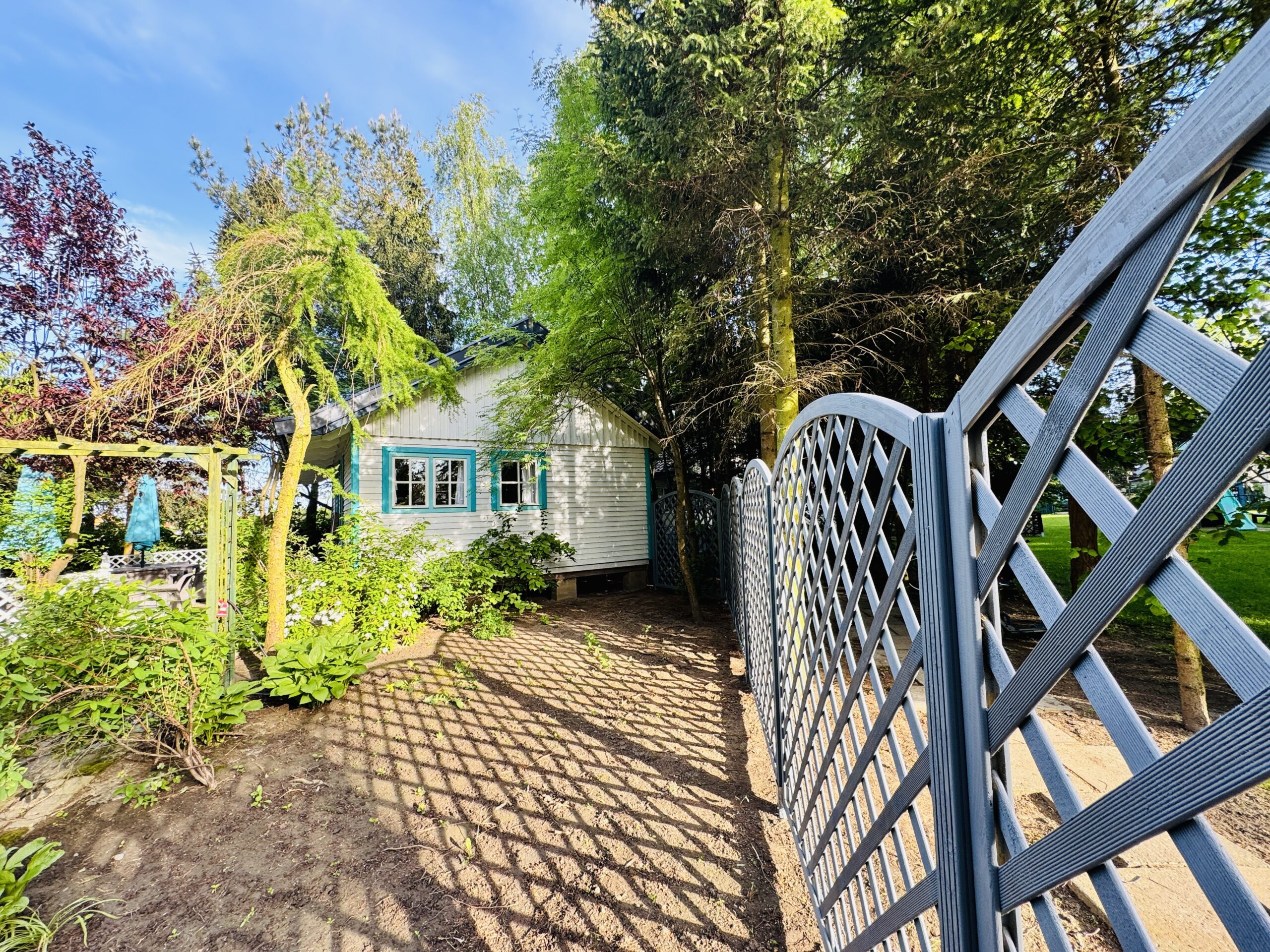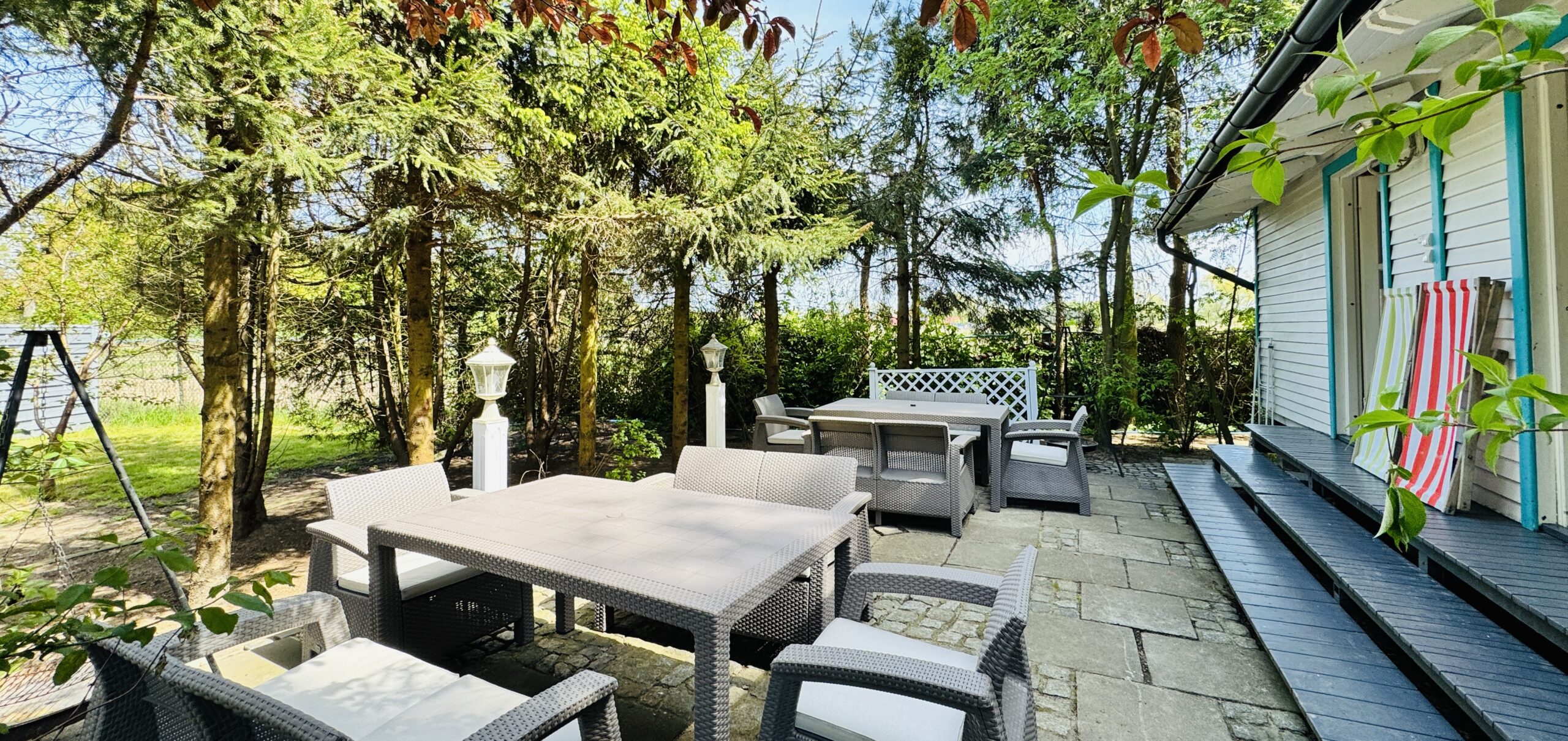 Dla każdej części domku do dyspozycji gości własny stół z parasolem w ogrodzie oraz miejsce do grillowania. Ukryty od pozostałej części ogrodu przez oddzielenie zielenią.