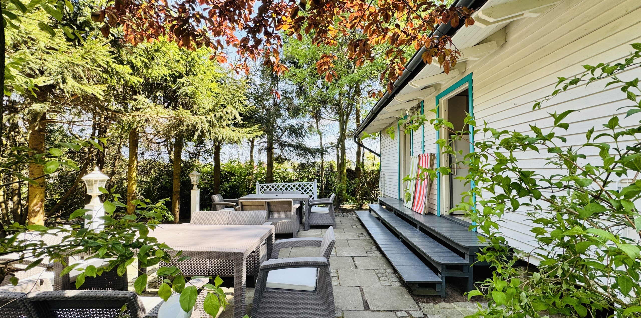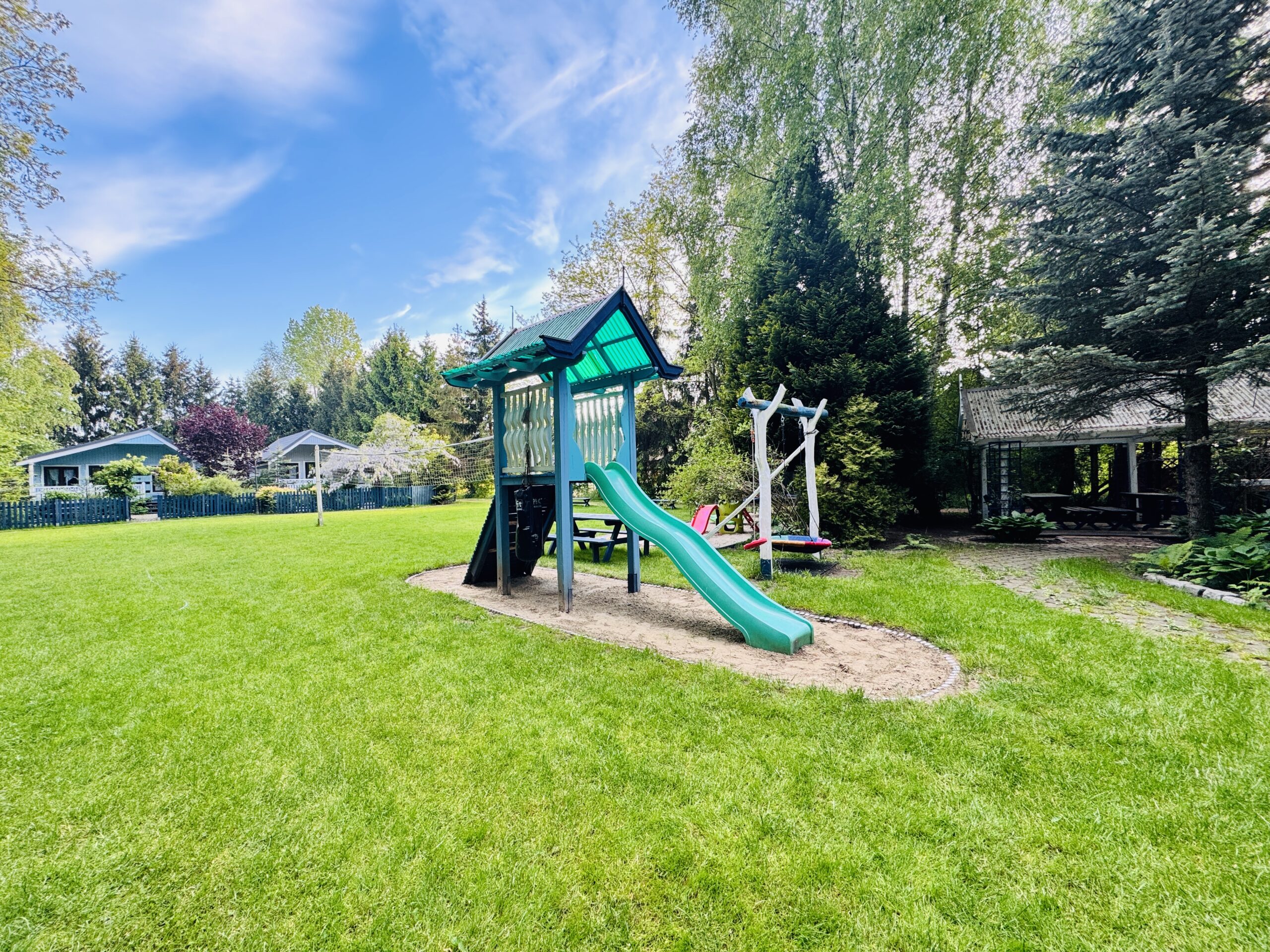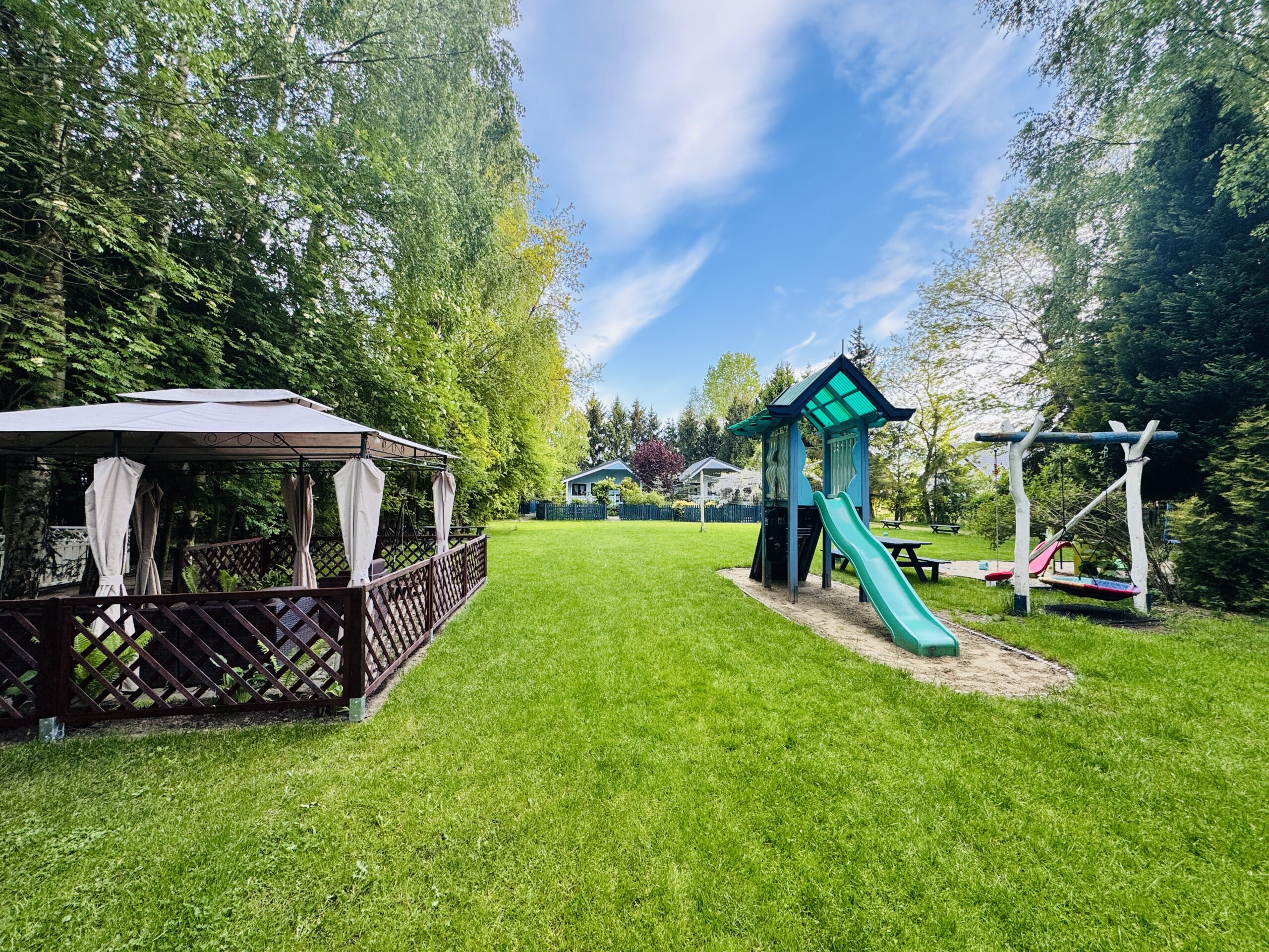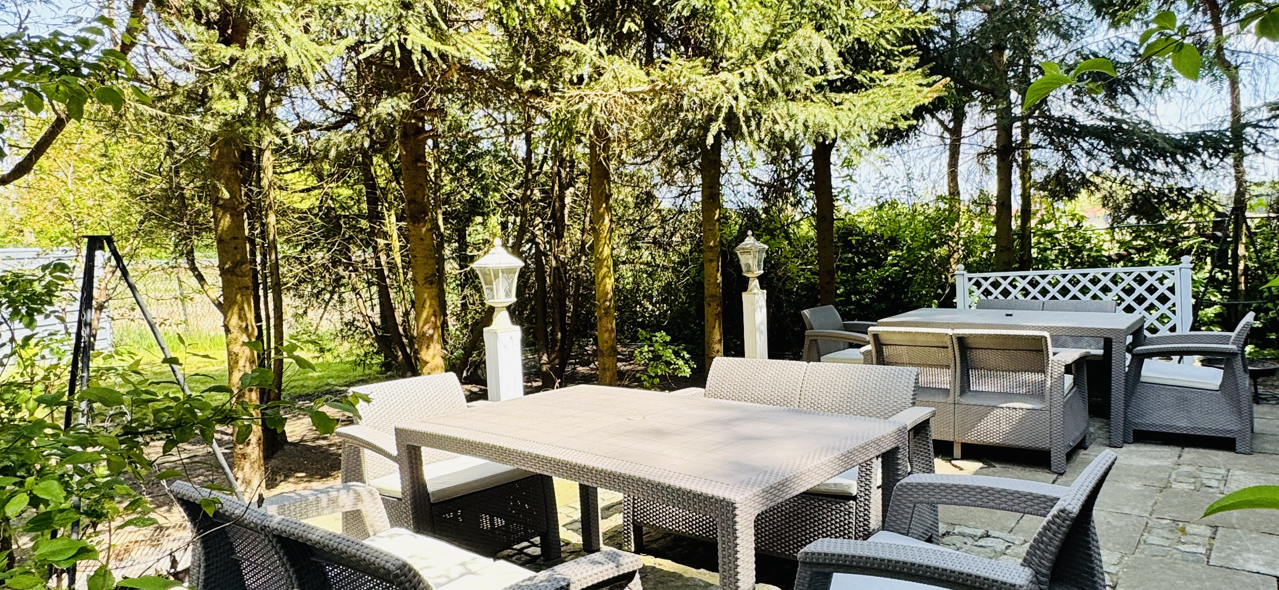 Dla każdej części domku do dyspozycji gości własny stół z parasolem w ogrodzie oraz miejsce do grillowania. Ukryty od pozostałej części ogrodu przez oddzielenie zielenią.