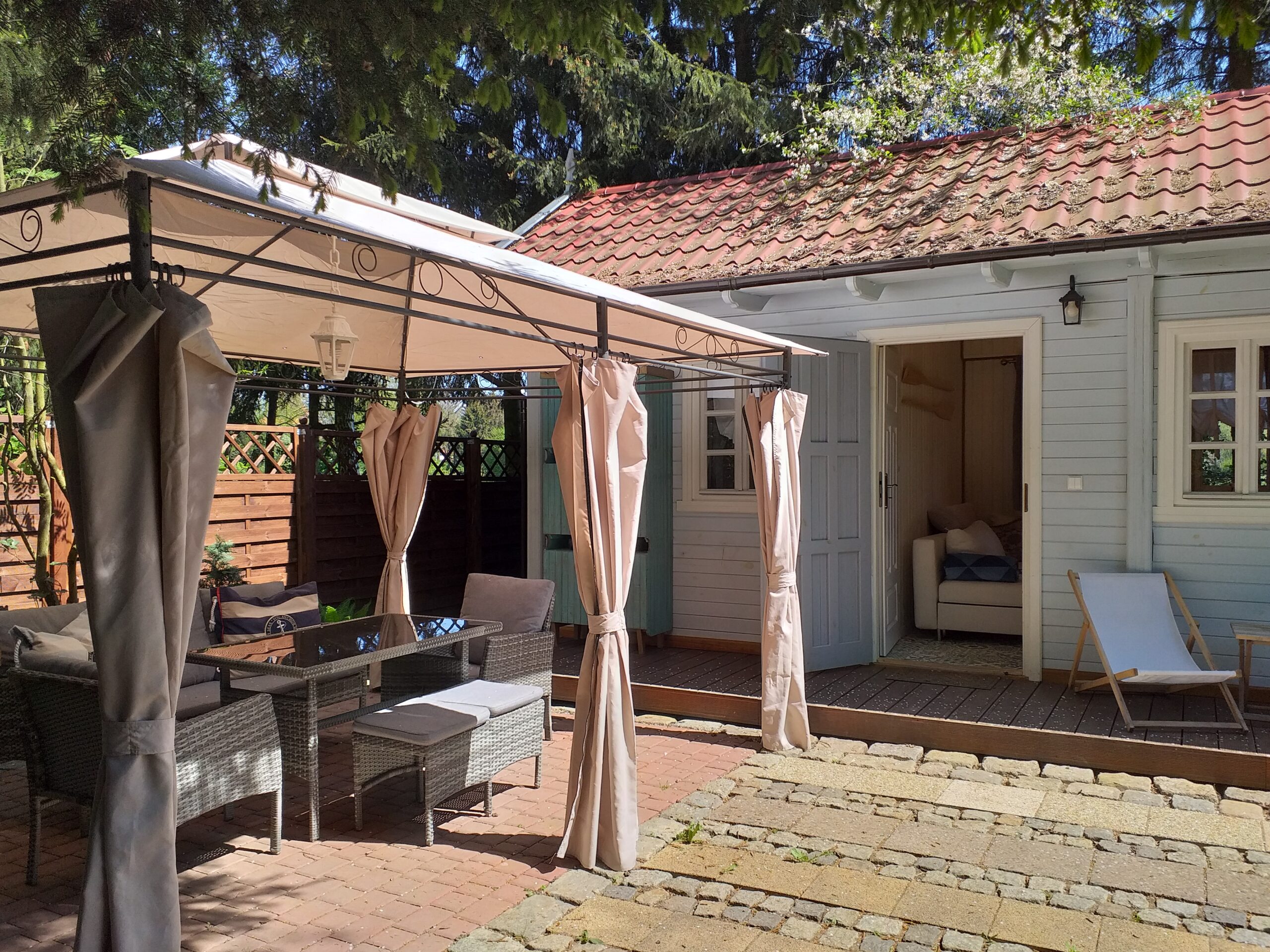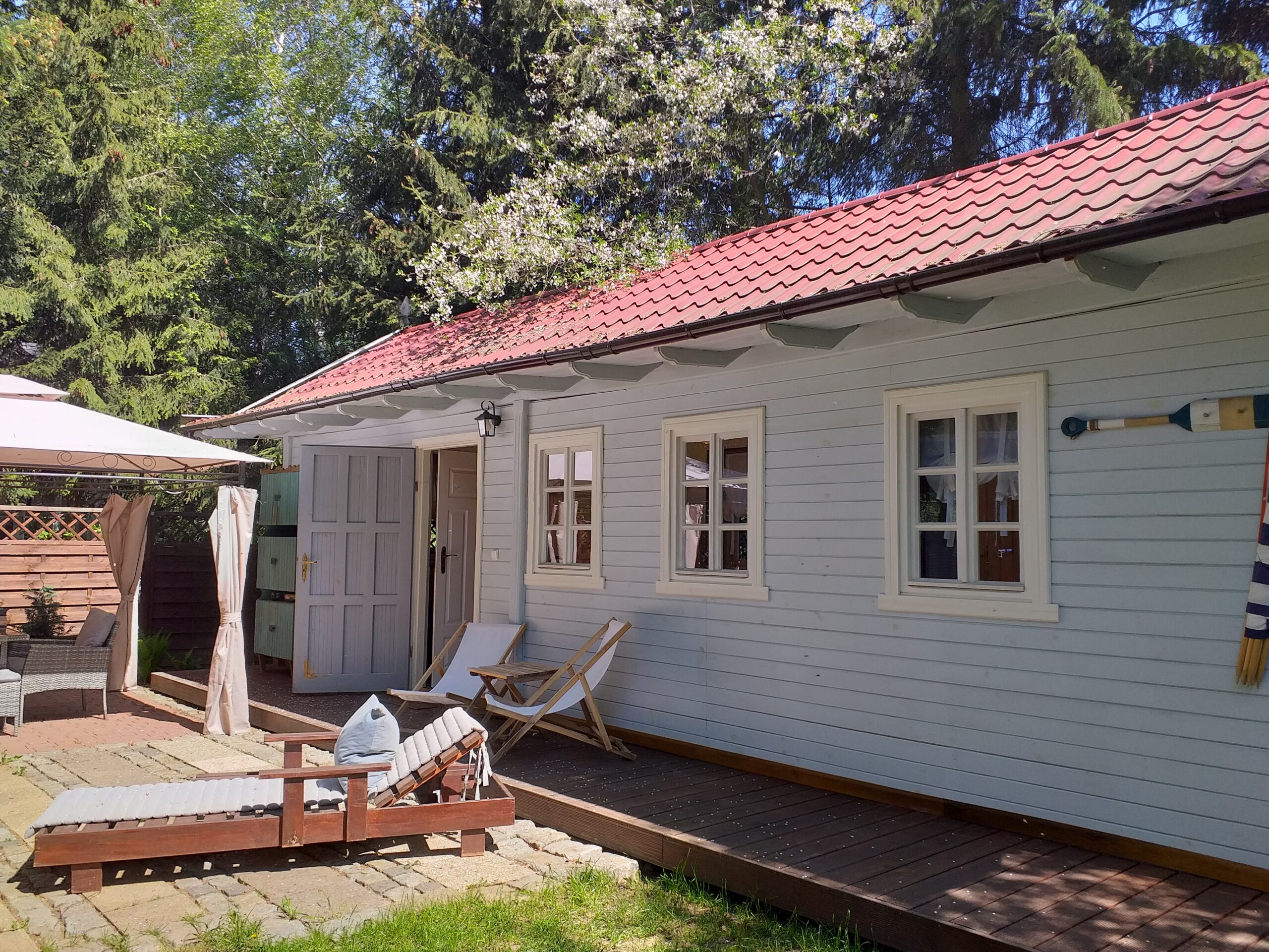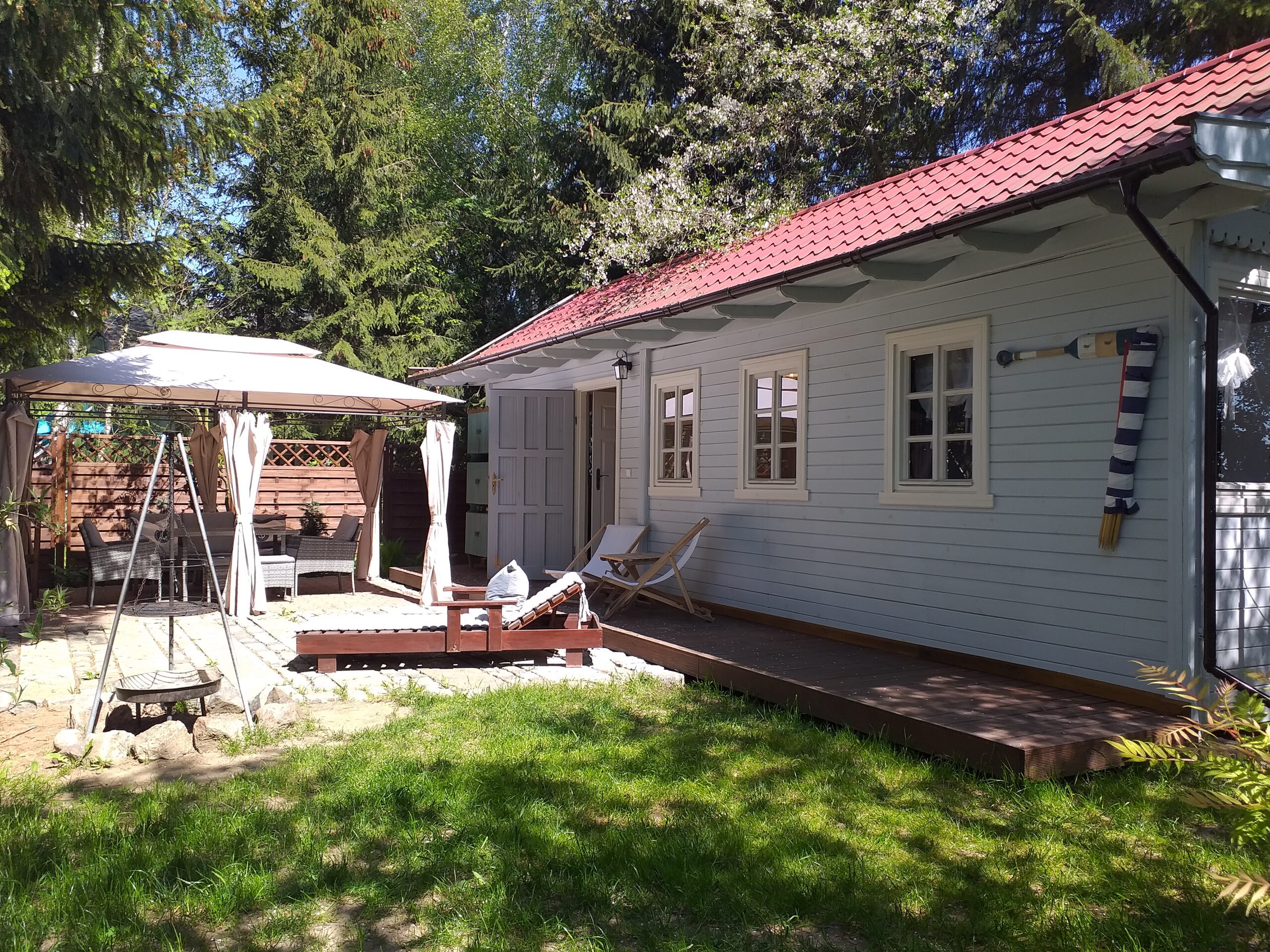Dla 5 - max 8 osób. Domek o pow. 35 m2 stojący na indywidualnie ogrodzonej działce o pow. 190 m2 wraz z altanką wyposażona w zestaw mebli wypoczynkowych.