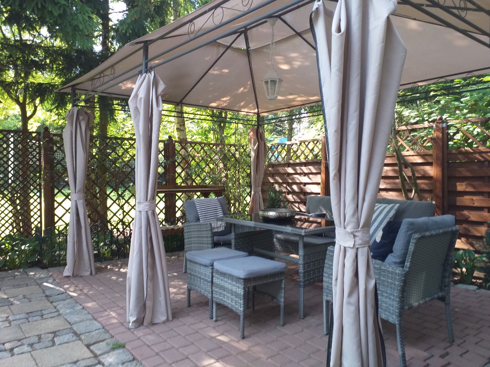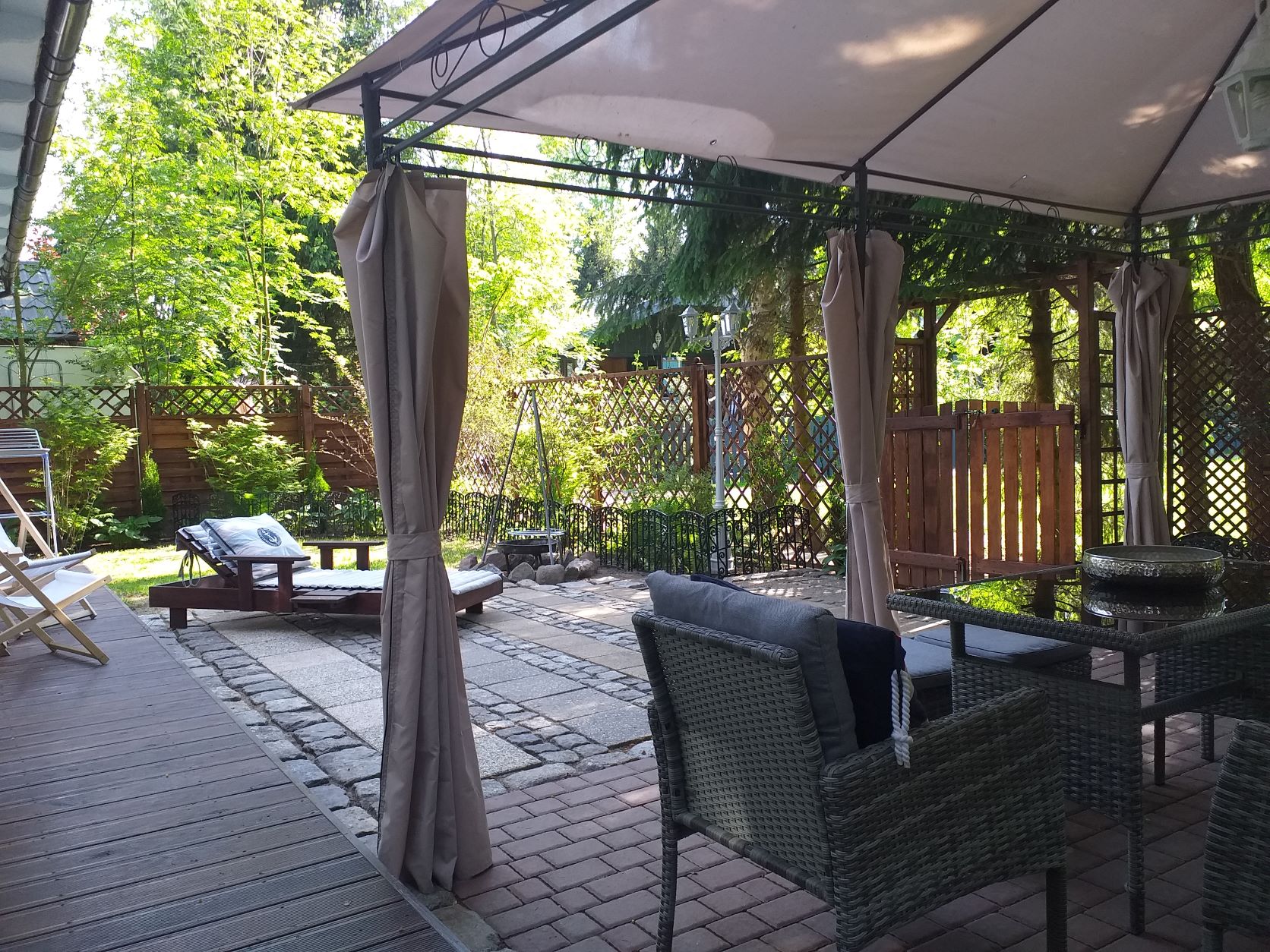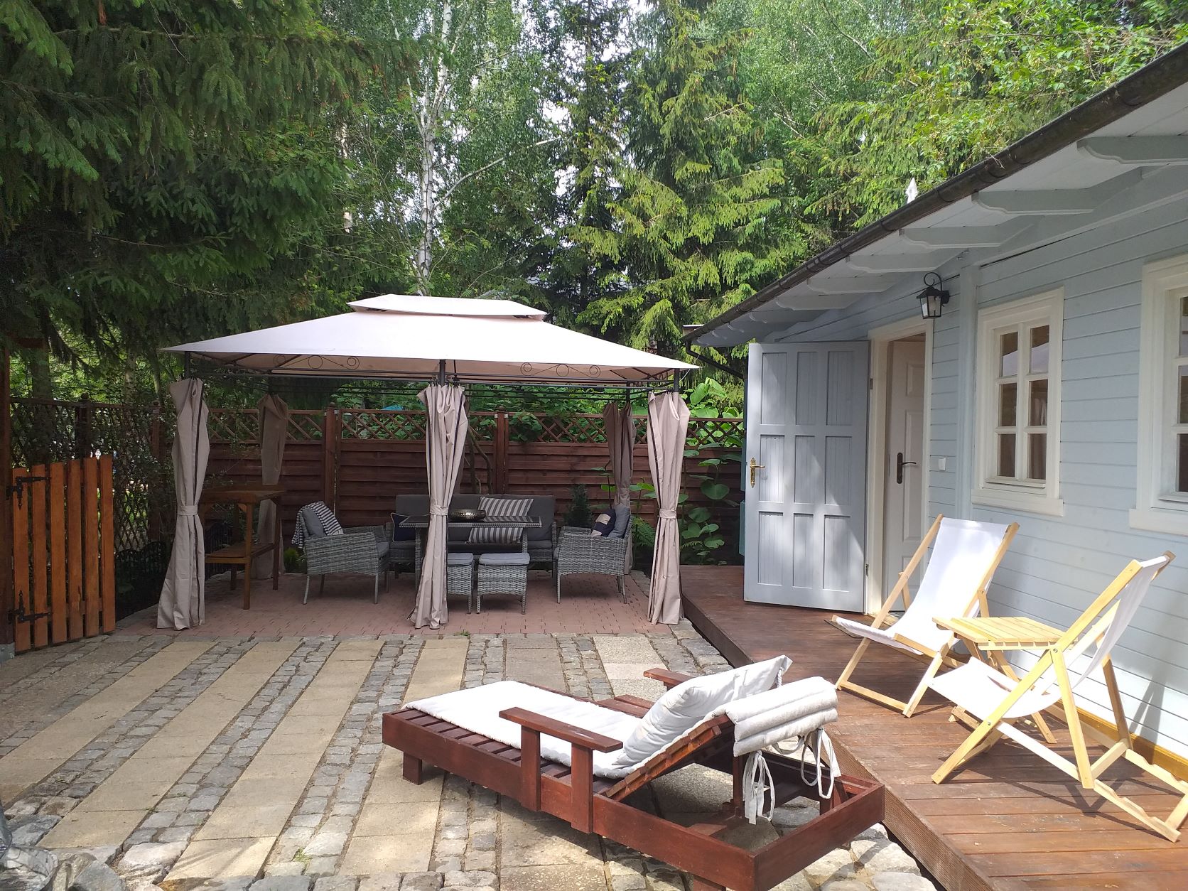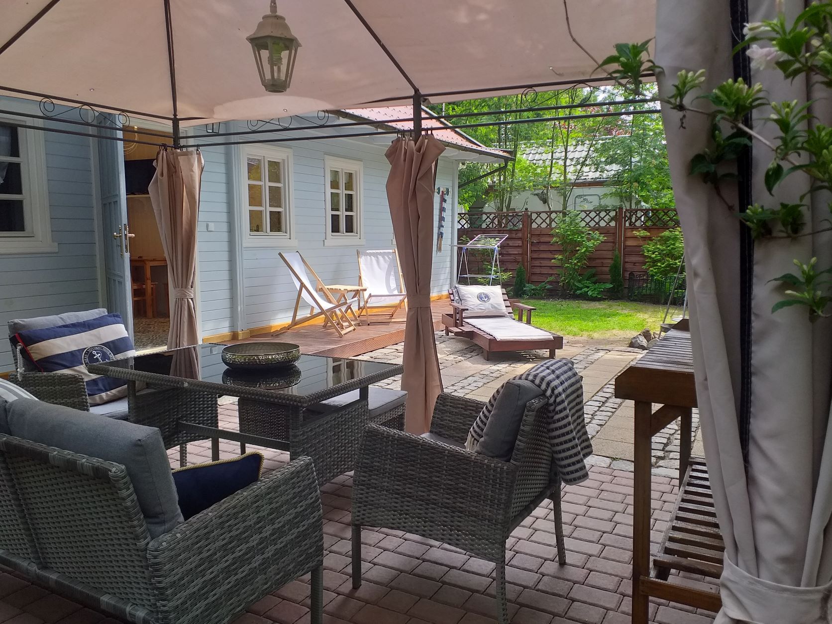 Dla 5 - max 8 osób. Domek o pow. 35 m2 stojący na indywidualnie ogrodzonej działce o pow. 190 m2 wraz z altanką wyposażona w zestaw mebli wypoczynkowych.