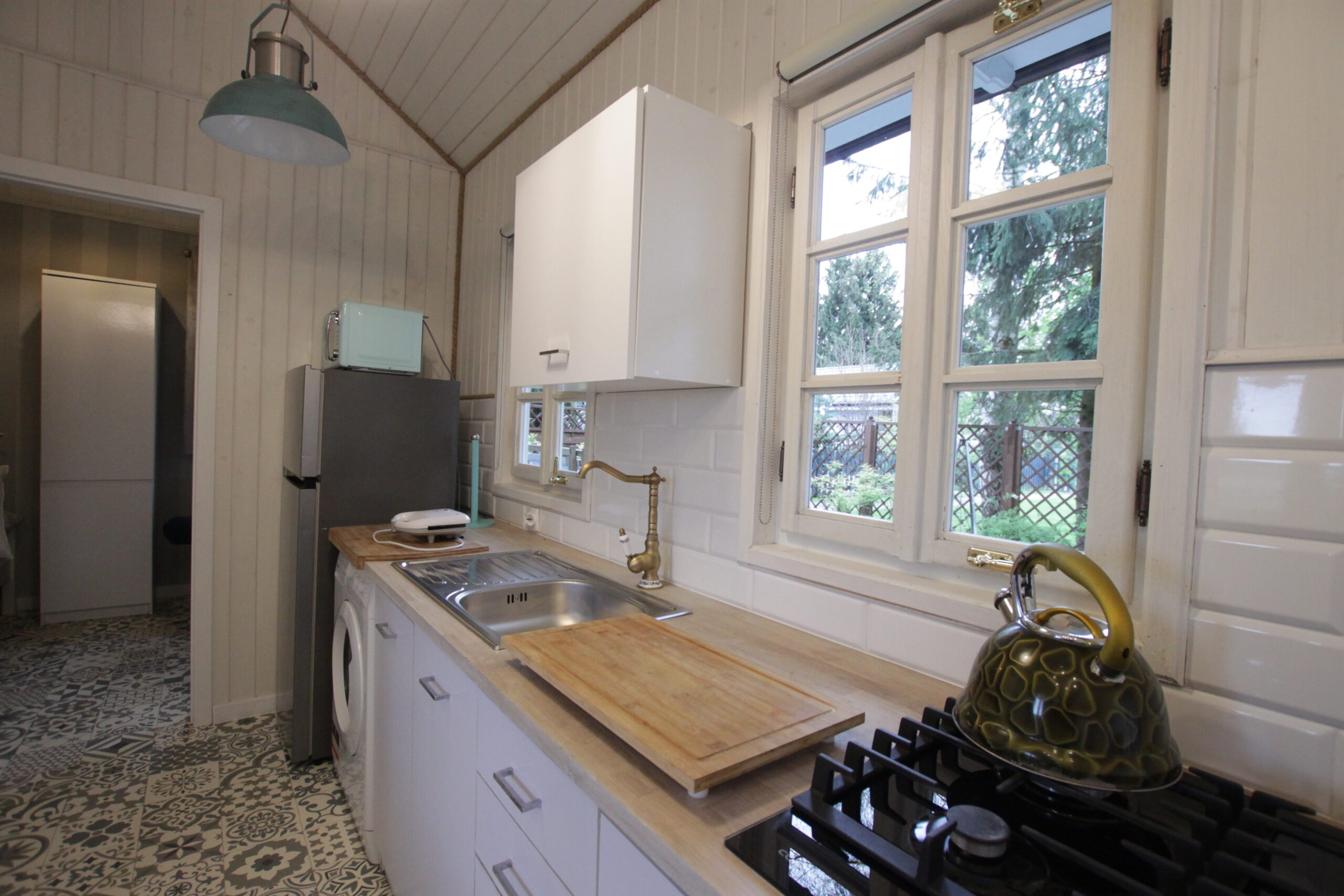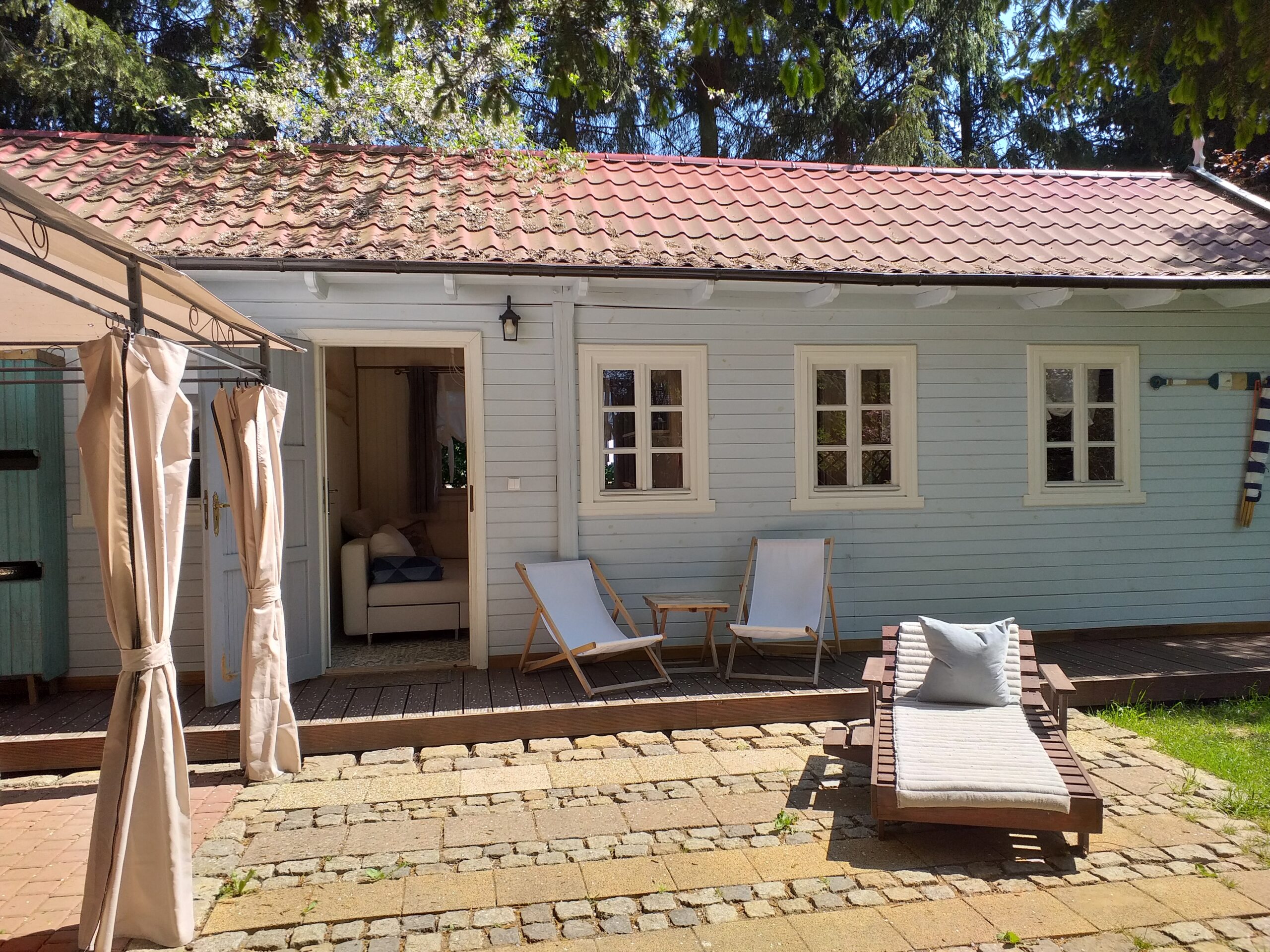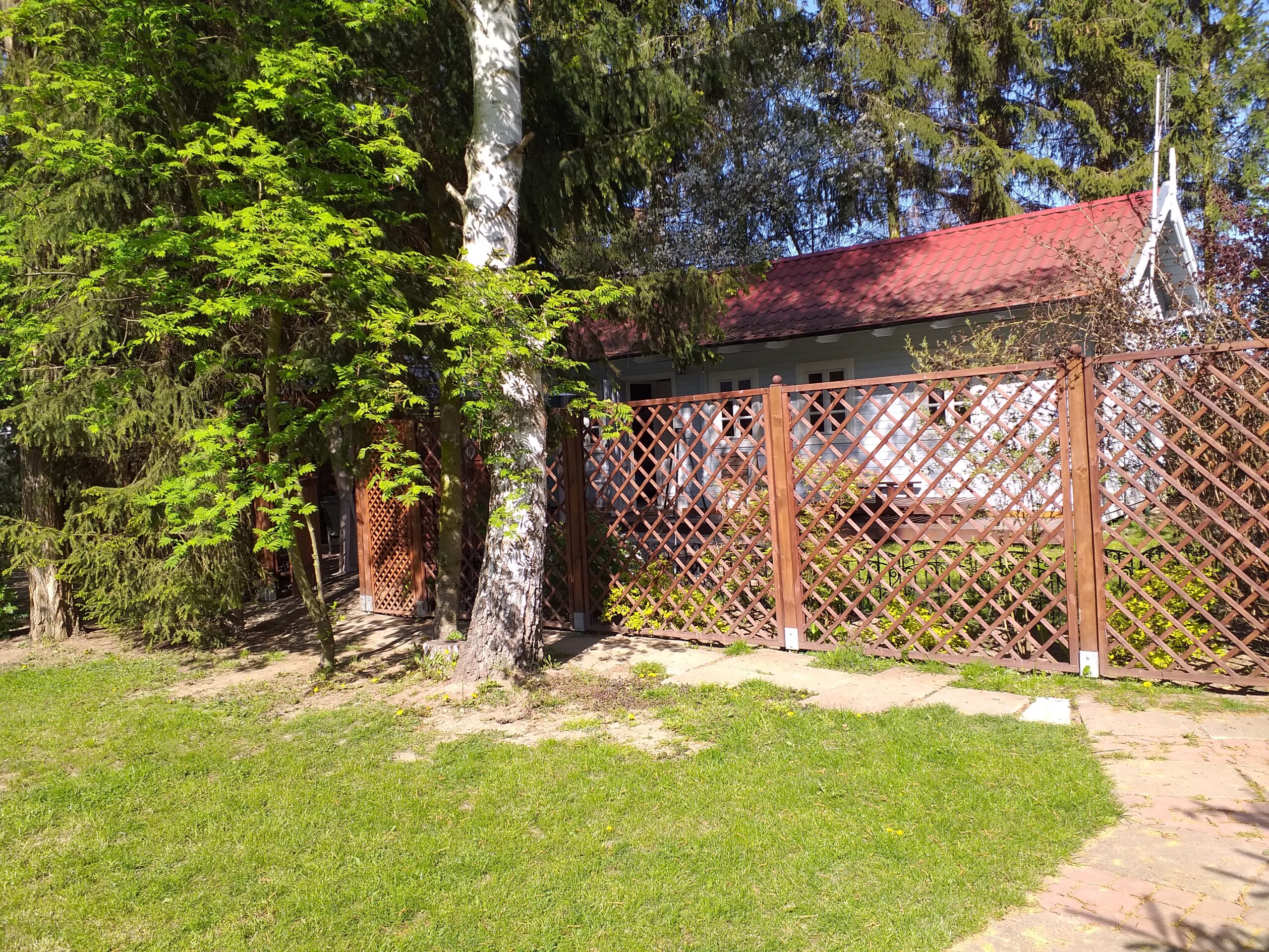 Kuchnia w pełni wyposażona. Łazienka z prysznicem, pralka. Otoczenie pełne bujnej zieleni w zacisznym zakątku ogrodu. Szczególnie dobrze dostosowany do pobytu z dużym psem!