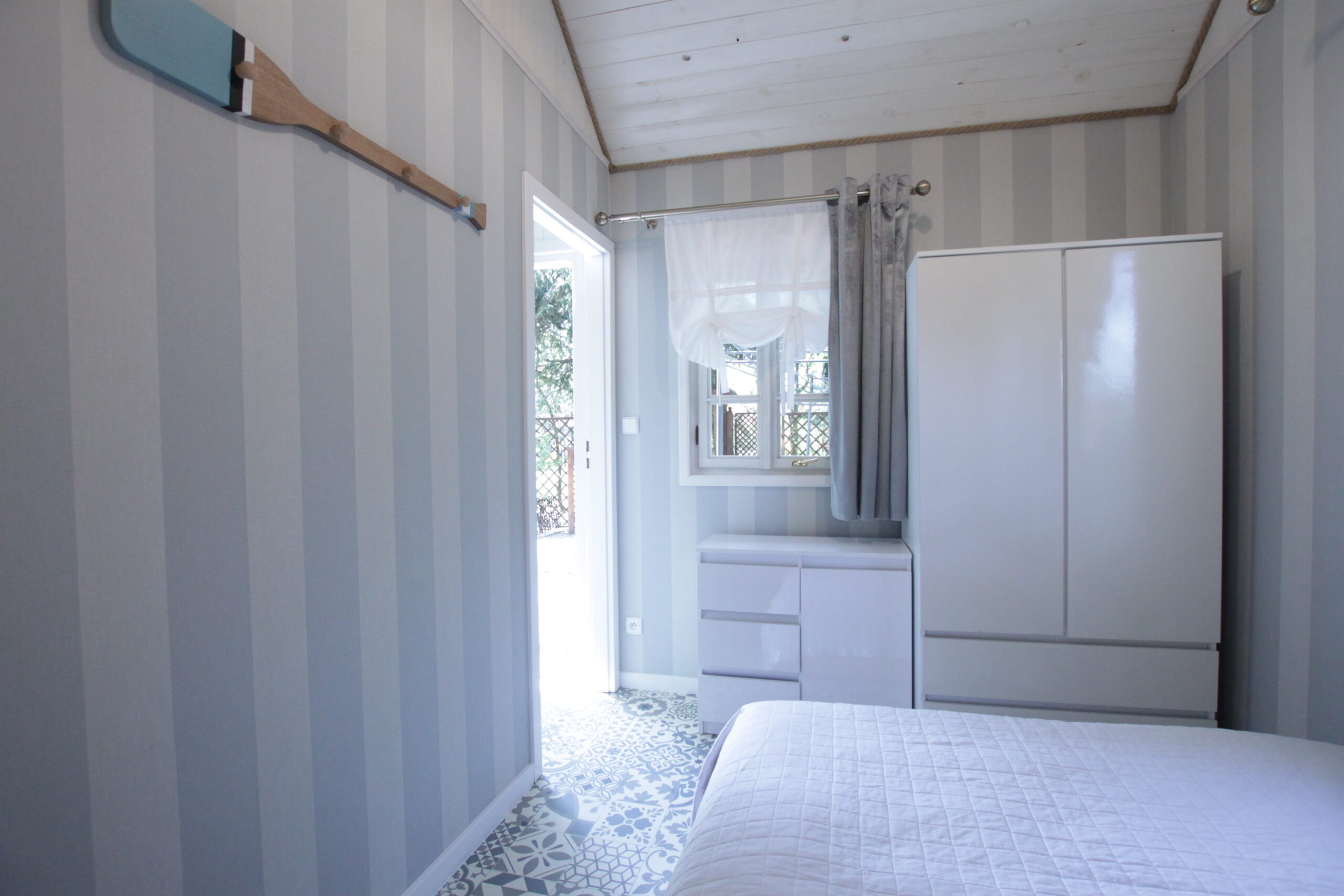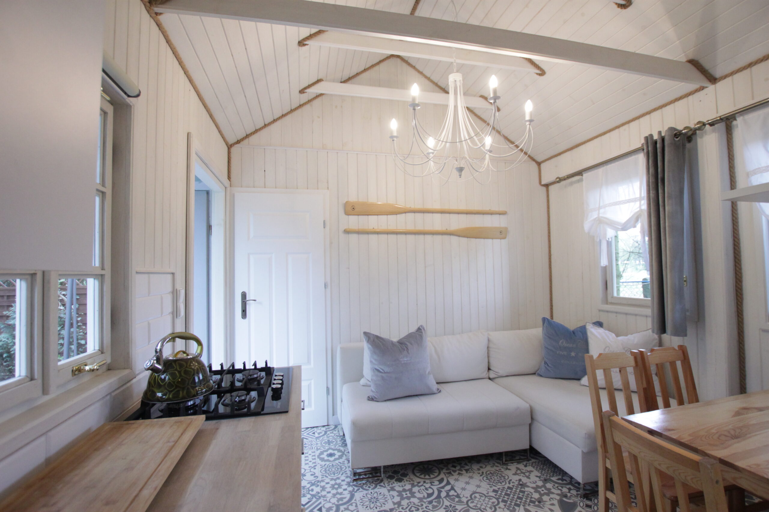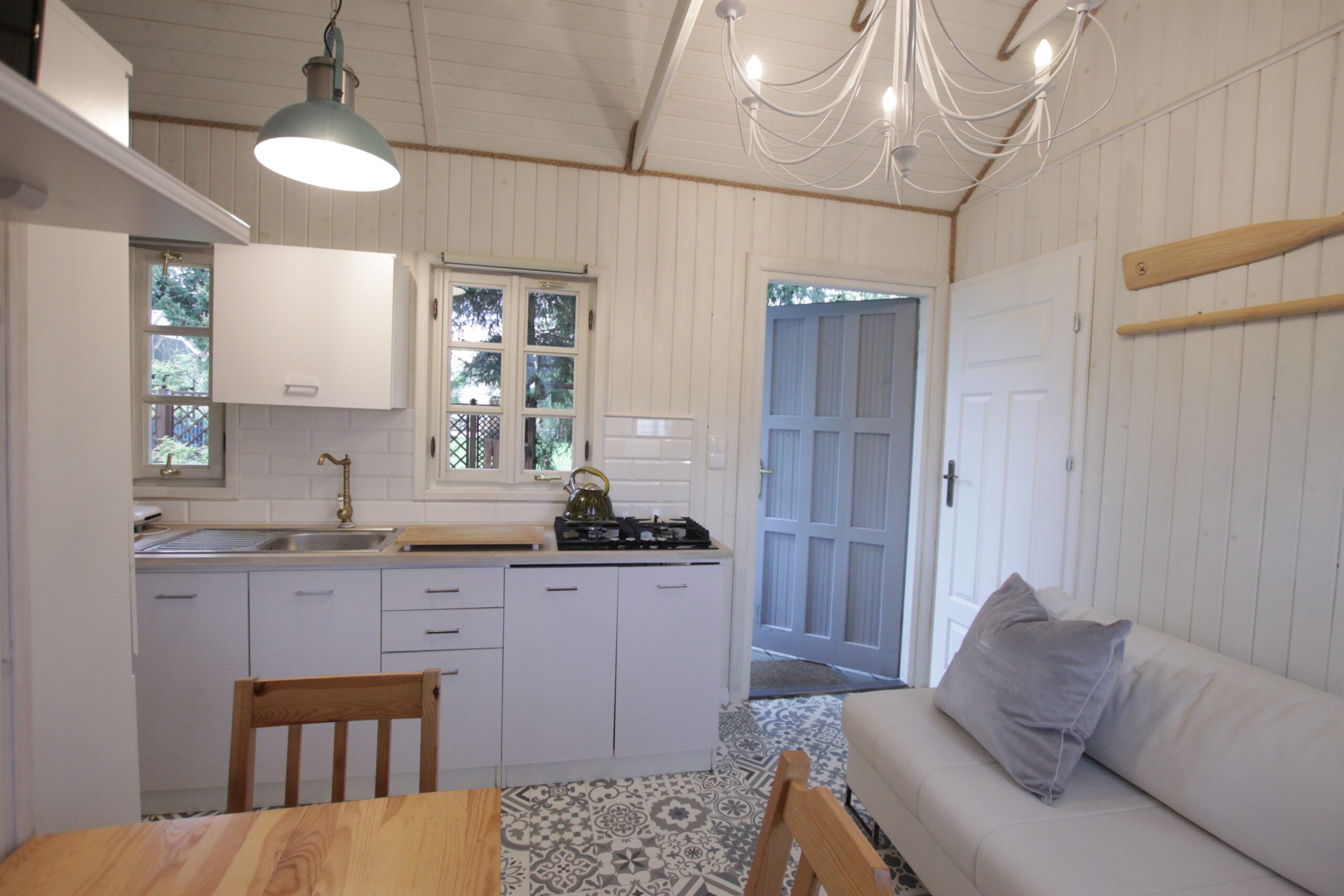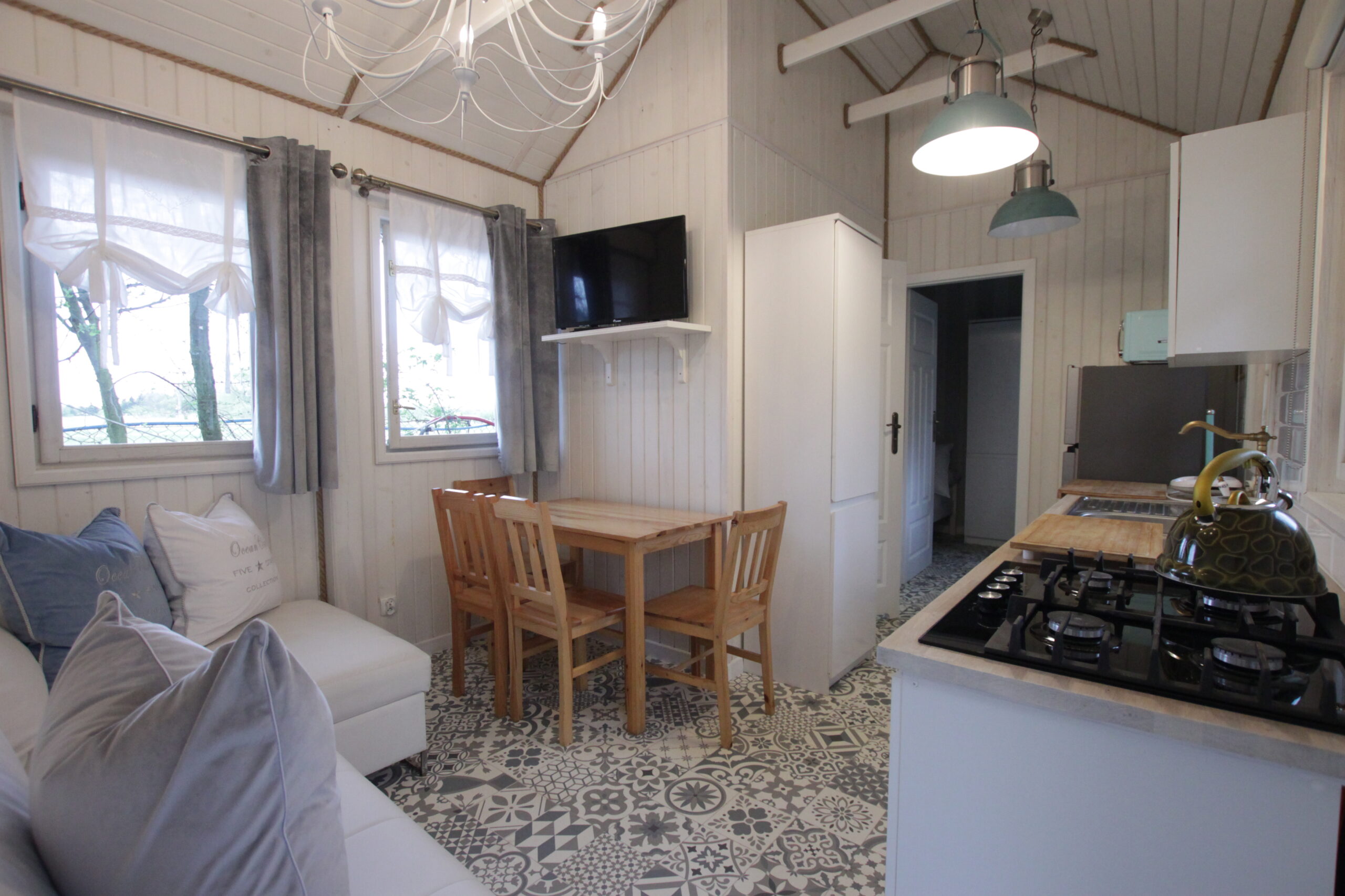 W domku są dwie sypialnie: Jedna – 2-osobowa z dużym łożem małżeńskim, druga – 3 osobowa z możliwością spania 1 dodatkowej osoby na rozkładanej sofce. Salonik z aneksem kuchennym pełniący funkcję pomieszczenia do dziennego pobytu oraz możliwość noclegu dla kolejnych 2 osób – kanapa narożna z funkcja spania.