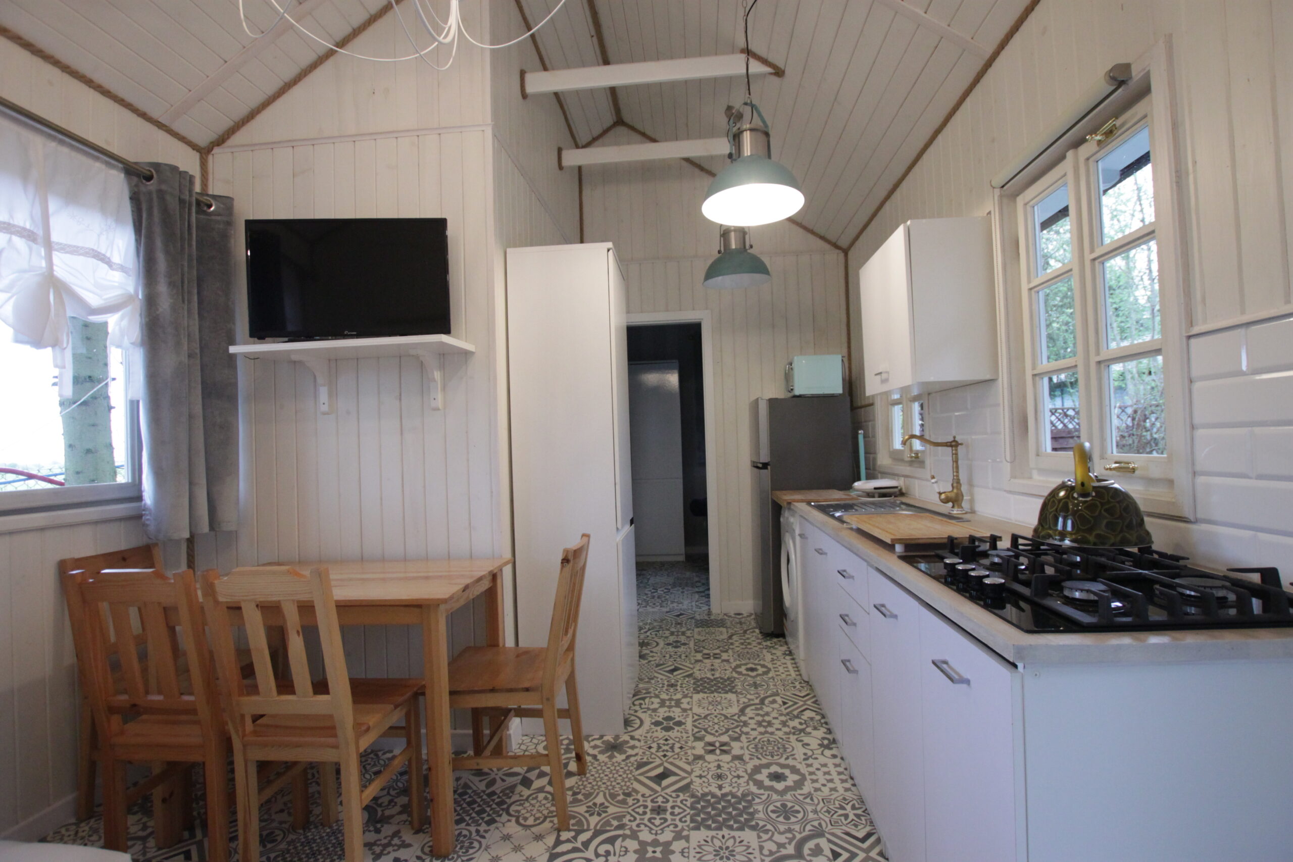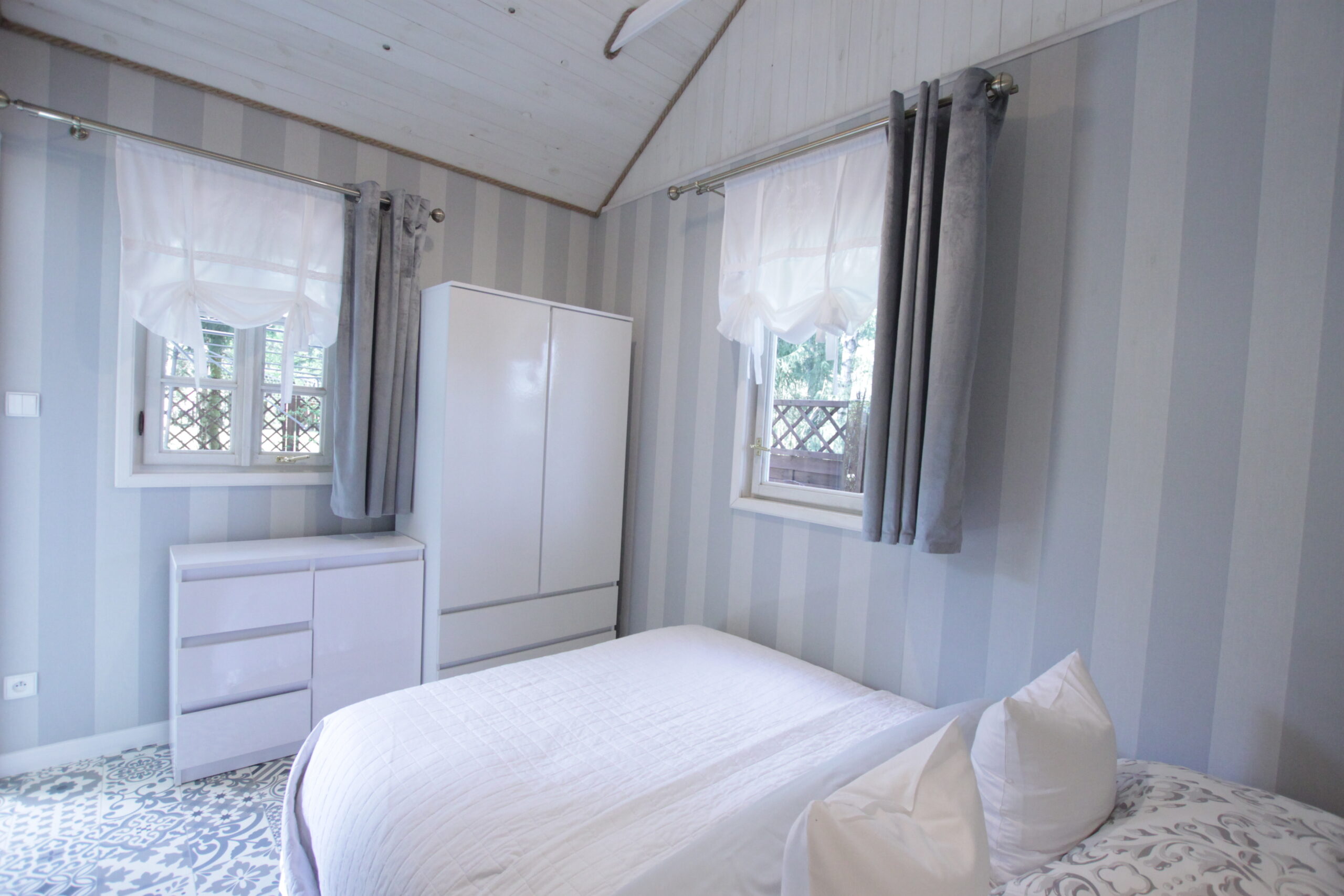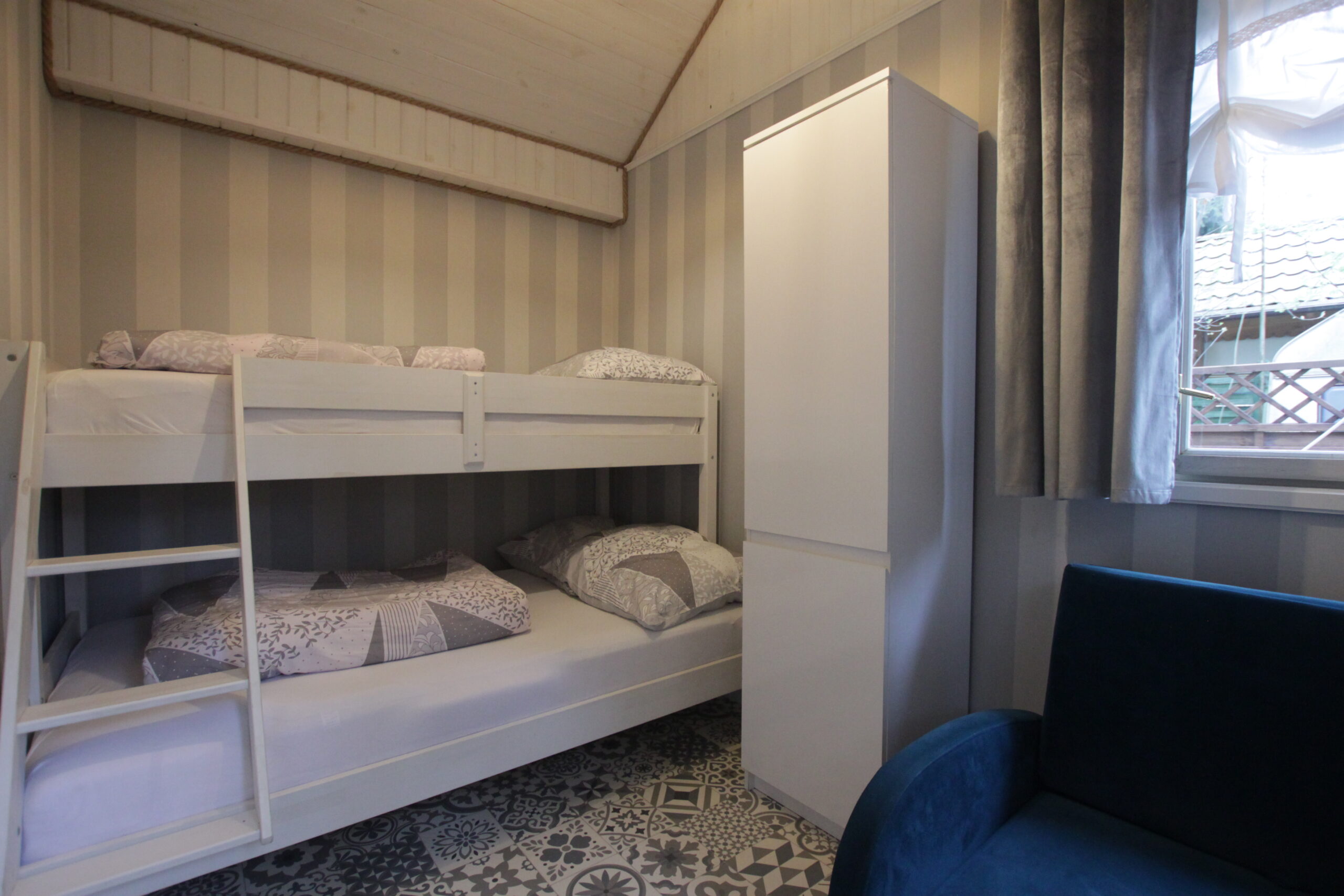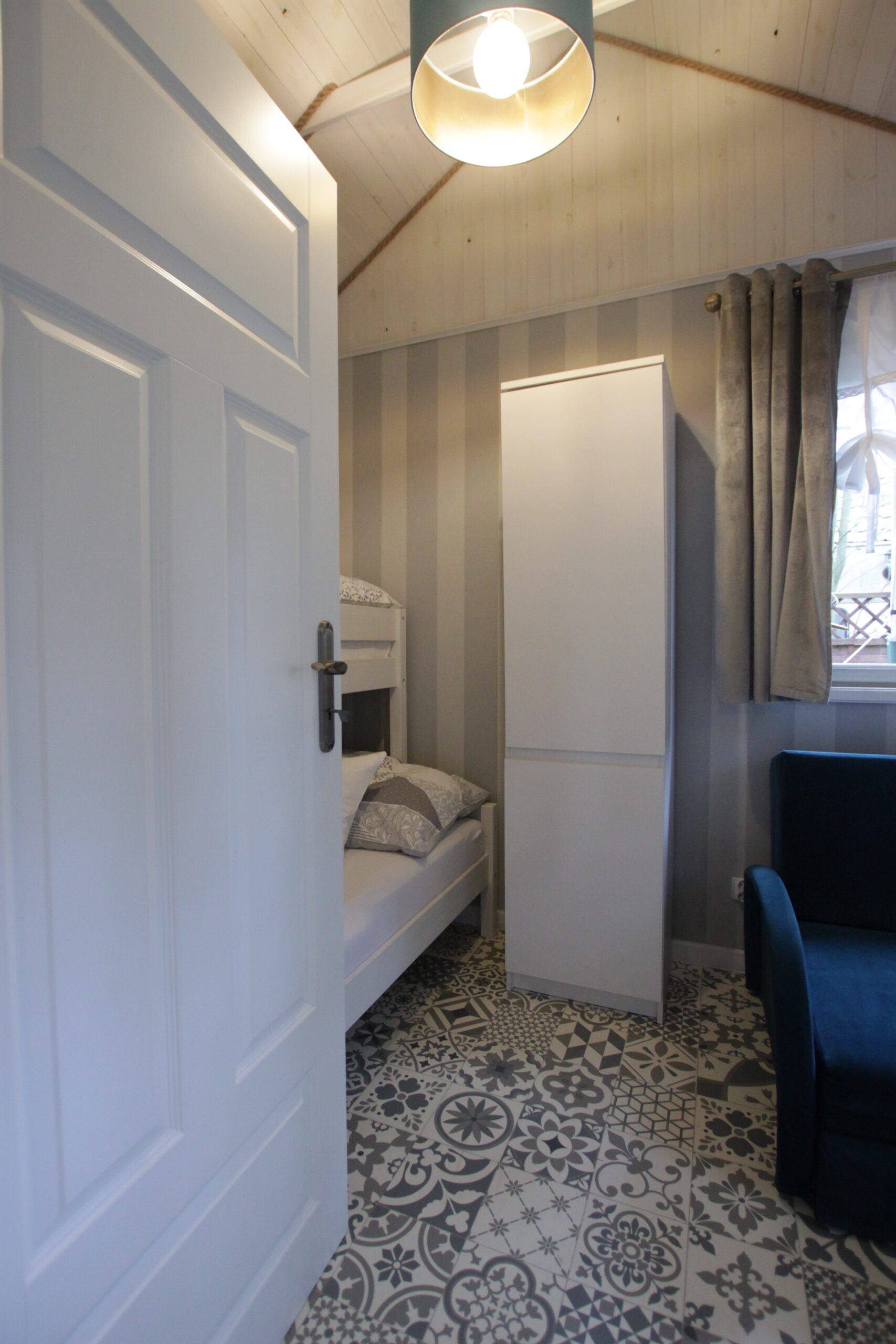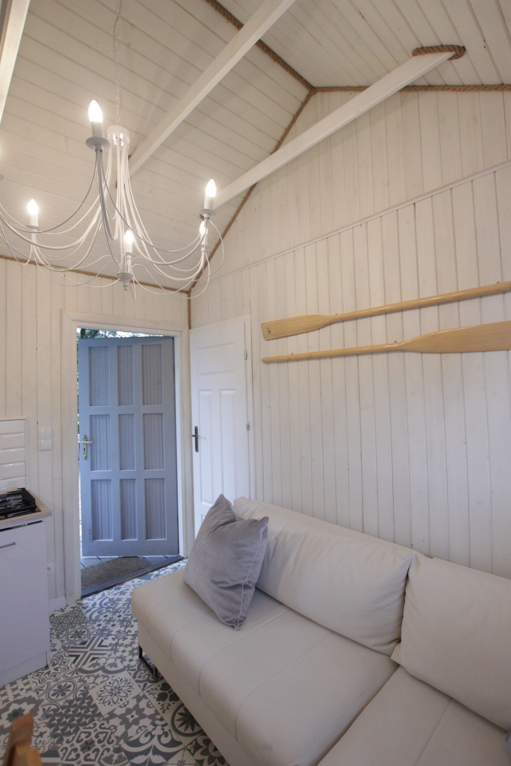 W domku są dwie sypialnie: Jedna – 2-osobowa z dużym łożem małżeńskim, druga – 3 osobowa z możliwością spania 1 dodatkowej osoby na rozkładanej sofce. Salonik z aneksem kuchennym pełniący funkcję pomieszczenia do dziennego pobytu oraz możliwość noclegu dla kolejnych 2 osób – kanapa narożna z funkcja spania.