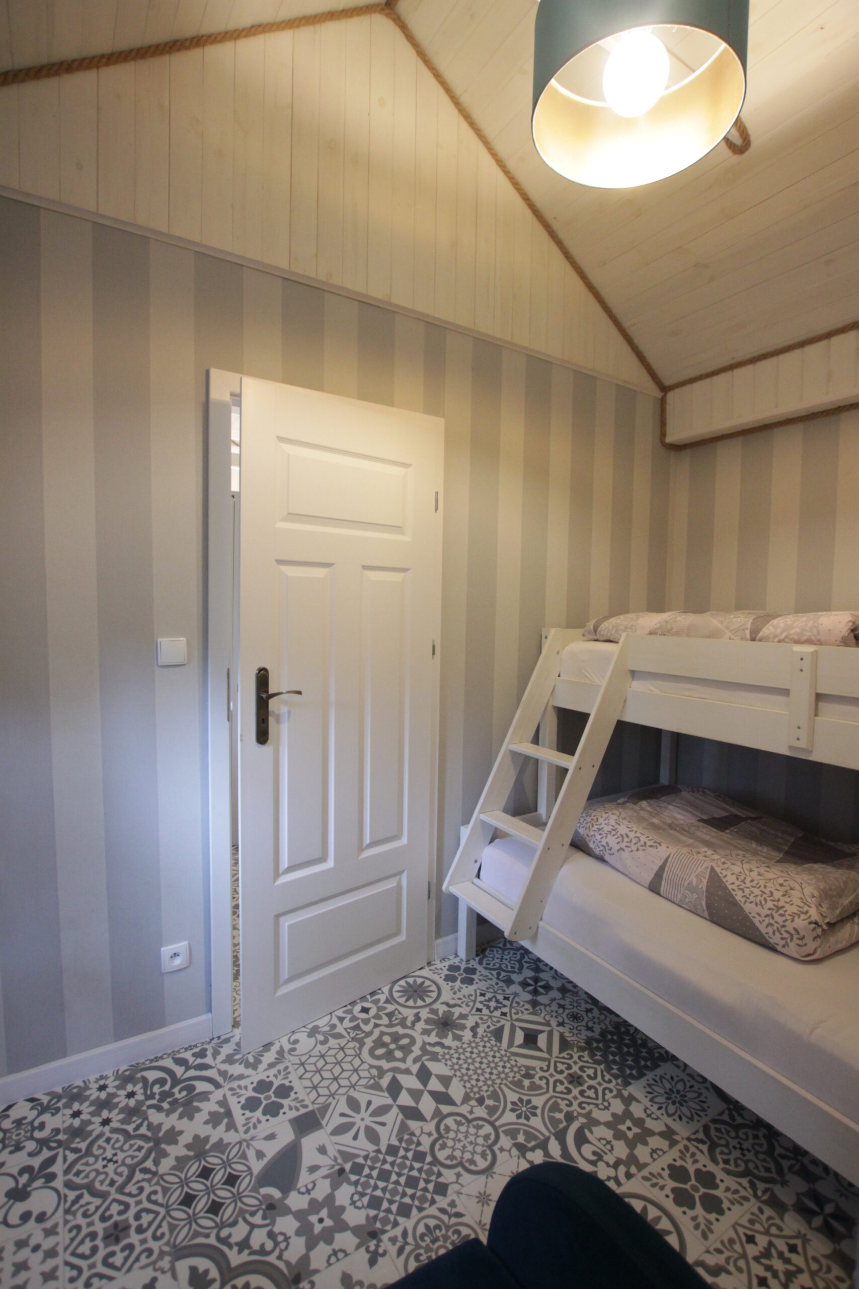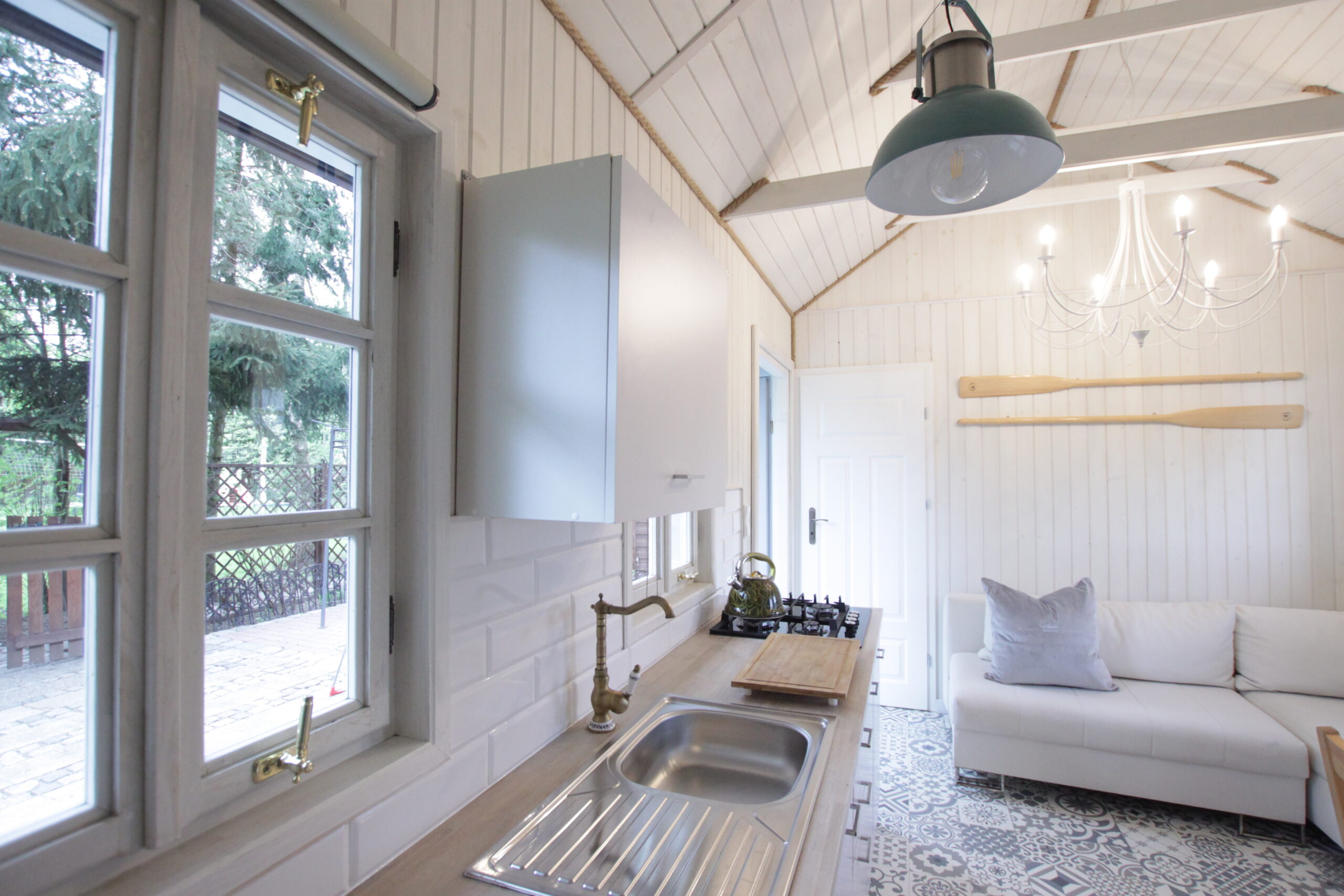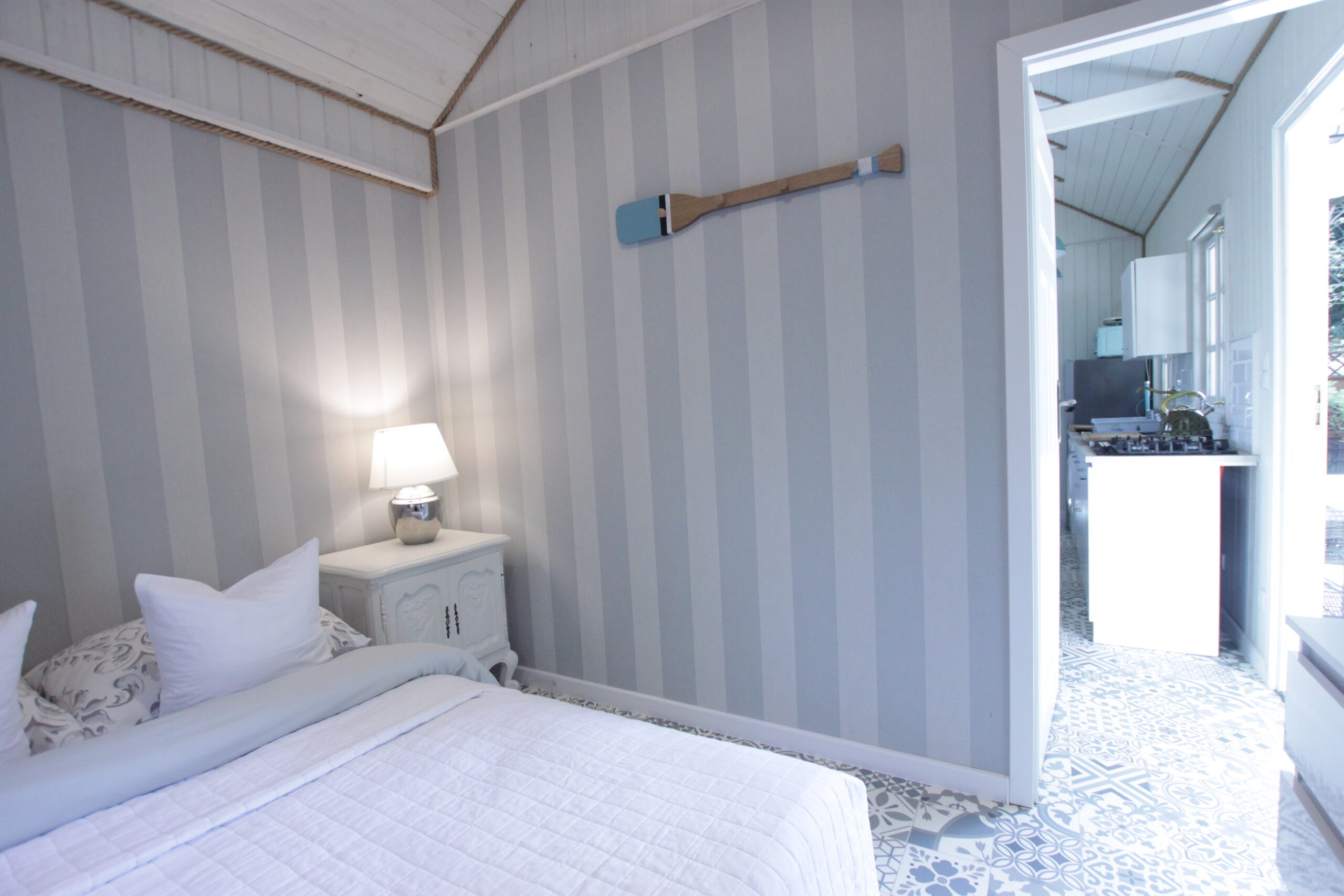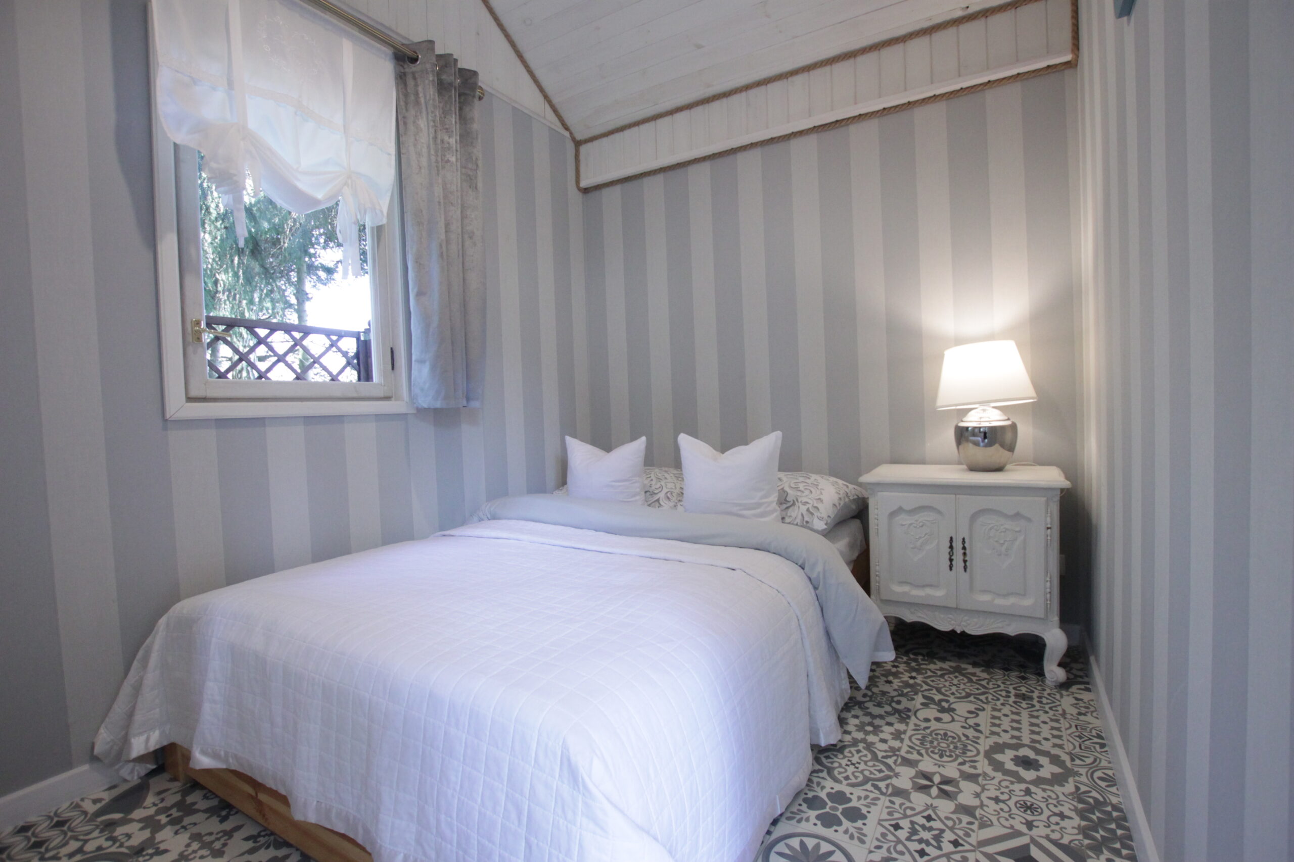 W domku są dwie sypialnie: Jedna – 2-osobowa z dużym łożem małżeńskim, druga – 3 osobowa z możliwością spania 1 dodatkowej osoby na rozkładanej sofce. Salonik z aneksem kuchennym pełniący funkcję pomieszczenia do dziennego pobytu oraz możliwość noclegu dla kolejnych 2 osób – kanapa narożna z funkcja spania.